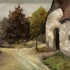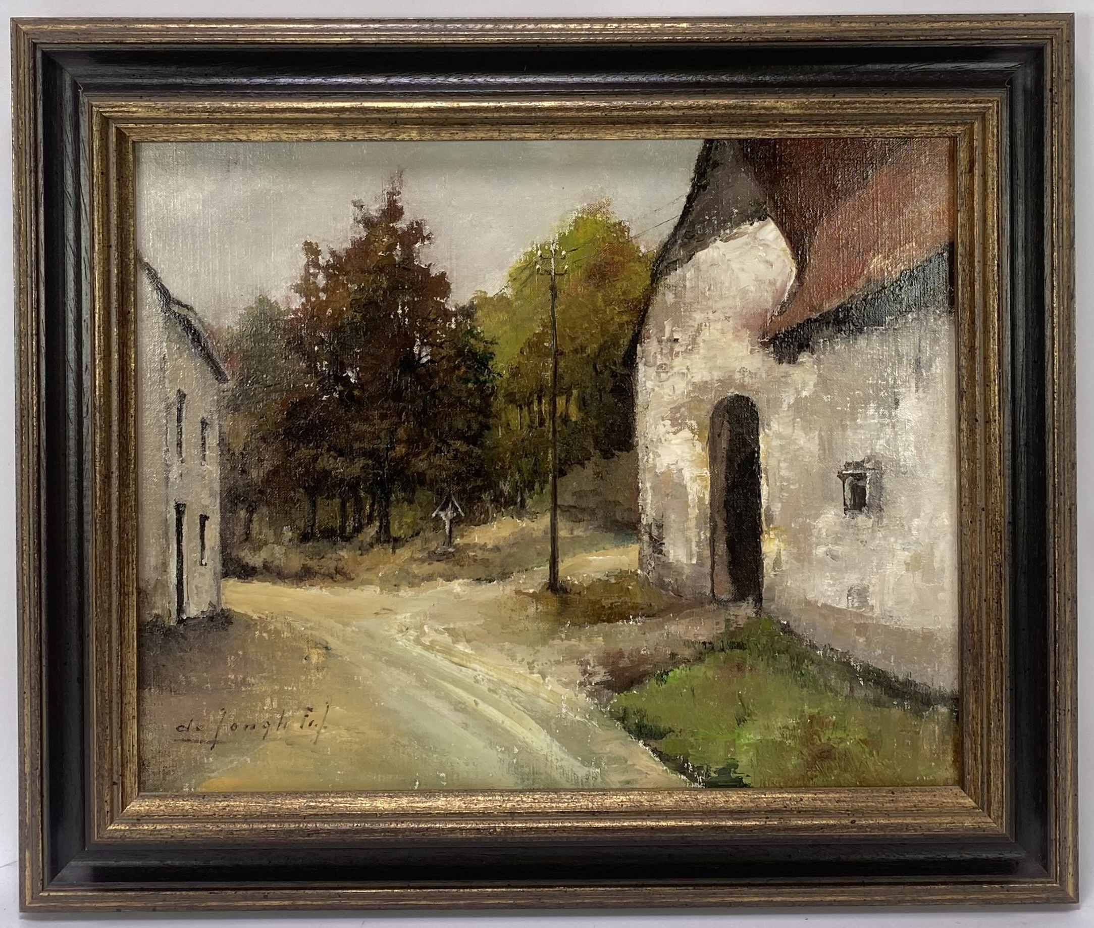 Olieverfschilderij, de Jonghe Fr. – dorpsstraat met boerderijen, 20e eeuw