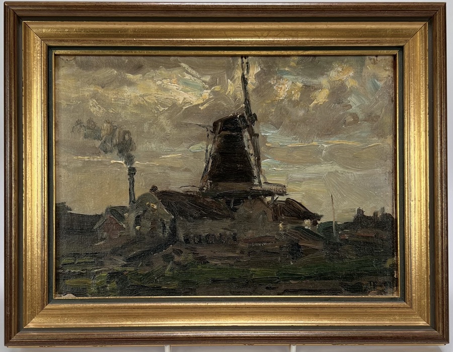 Olieverfschilderij, F.H. Bach, Haagse School – molenlandschap, ca. 1900