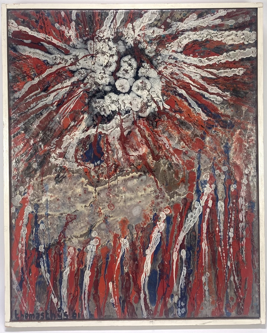 Schilderij door Thomas Thijs, uitgevoerd in olieverf op doek en gedateerd 1961. De abstract-expressionistische compositie bestaat uit brede verfbanen in rood, wit, grijs en blauw, samengebracht rond een centrale kern met dynamische penseelvoering. Gesigneerd linksonder “Thomas Thijs ’61”. Kom langs tijdens de kijkdagen (28 t/m 30 november) en ontdek dit schilderij zelf! |