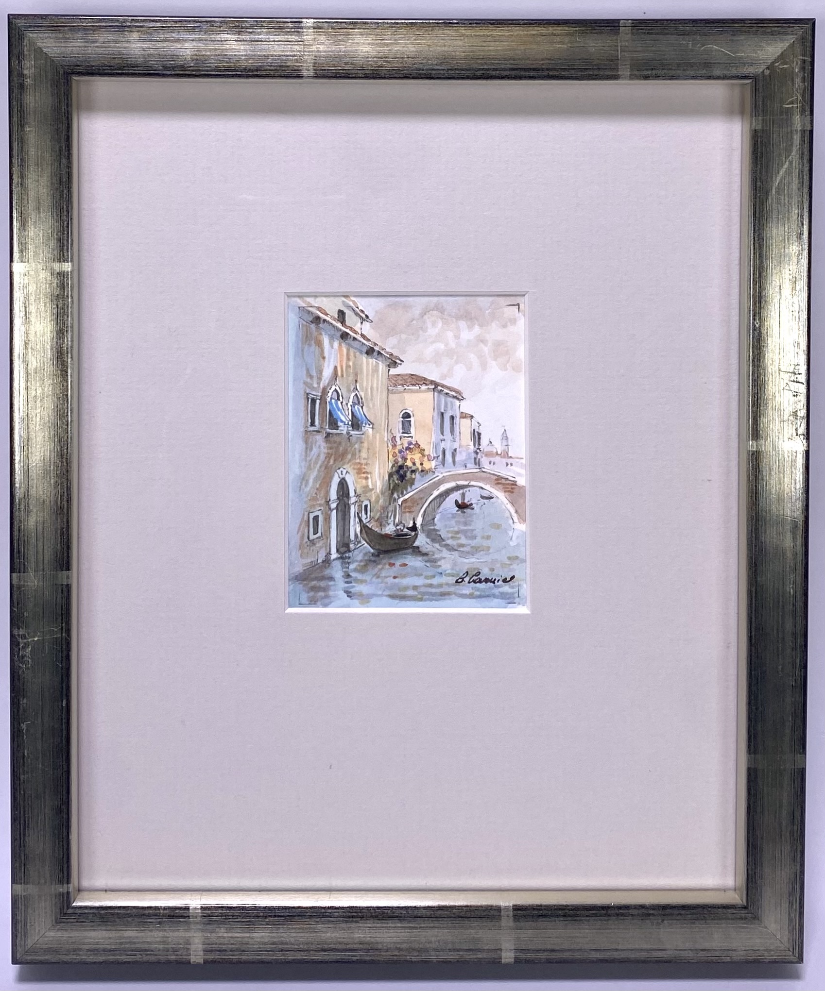 Deze aquarel op papier is een stadsgezicht van Venetië, uitgevoerd in een impressionistische stijl uit de 2e helft van de 20e eeuw. Het werk toont een brug over een kanaal en gondels, met traditionele gebouwen en een klokkentoren in de achtergrond. De compositie bevat een lichte, gedempte kleurstelling, rechtsonder onduidelijk gesigneerd. Klaar om te bieden? Registreer je nu en doe mee aan de veiling! |