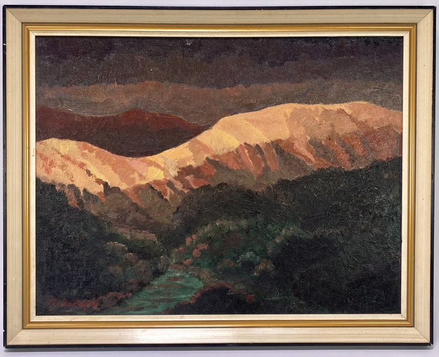Olieverfschilderij op doek van een expressief berglandschap met heuvels en donkere valleien, uitgevoerd in krachtige penseelstreken en warme aardtinten. Linksonder onduidelijk gesigneerd, midden 20e eeuw. Het werk bevindt zich in een goudkleurige lijst. Geïnteresseerd? Bezoek onze kijkdagen op 28, 29 of 30 november van 11:00 tot 17:00 uur! |