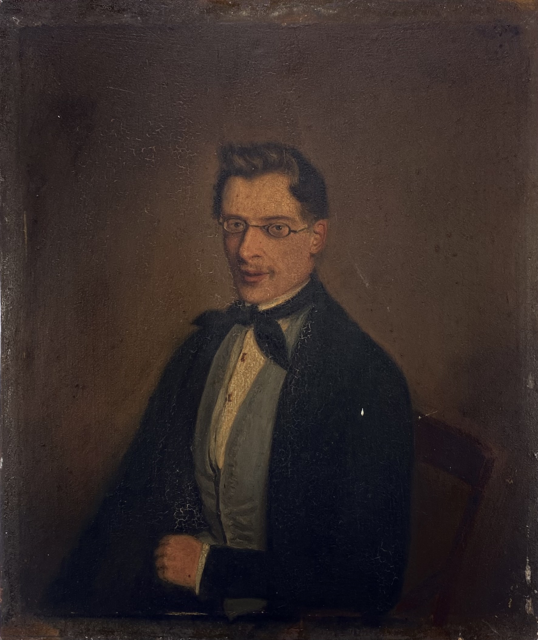 Olieverf op paneel in realistische stijl, eerste helft 19e eeuw, met portret van een man met bril, gekleed in donker kostuum met witte blouse en zwarte strik. De man is driekwart afgebeeld tegen een sobere bruine achtergrond. De verf is dun en fijn opgezet, typisch voor academische portretkunst uit deze periode. Geïnteresseerd? Bezoek onze kijkdagen op 28, 29 of 30 november van 11:00 tot 17:00 uur! |