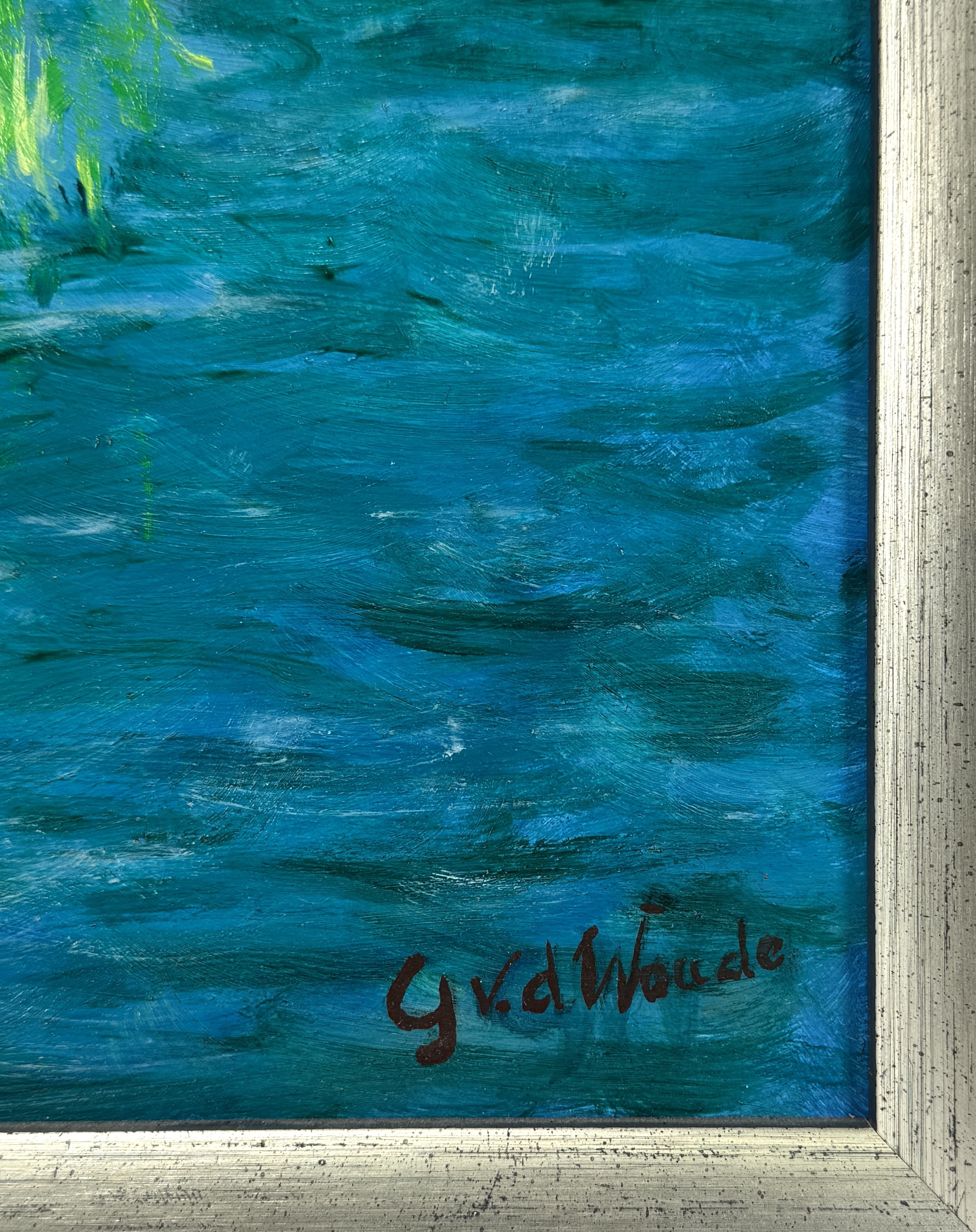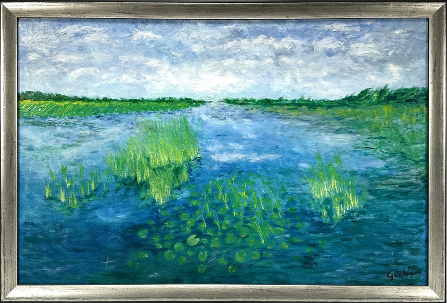 Olieverfschilderij, G. v.d. Woude – watergezicht, laatste kwart 20e eeuw