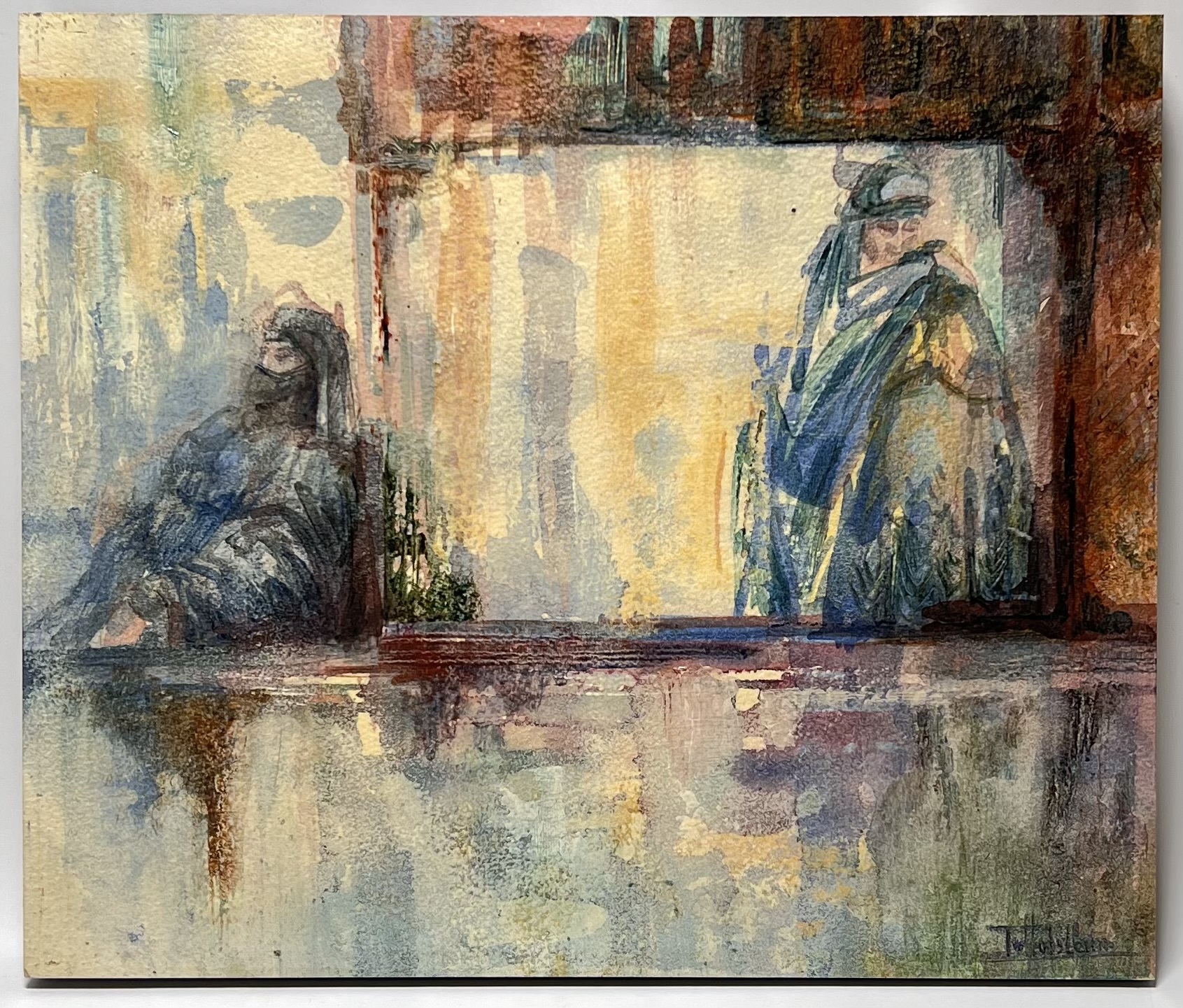 Aquarel op papier, een figuratief werk van de Nederlandse kunstenares Toos van Holstein (1949). Het werk uit de late 20e eeuw toont twee gehulde figuren in een expressionistische sfeer. Kenmerkend is het dromerige, poëtische kleurgebruik en de ruimtelijke gelaagdheid van haar latere werk uit de tweede helft 20e eeuw. Kom langs tijdens de kijkdagen (28 t/m 30 november) en ontdek dit schilderij zelf! |