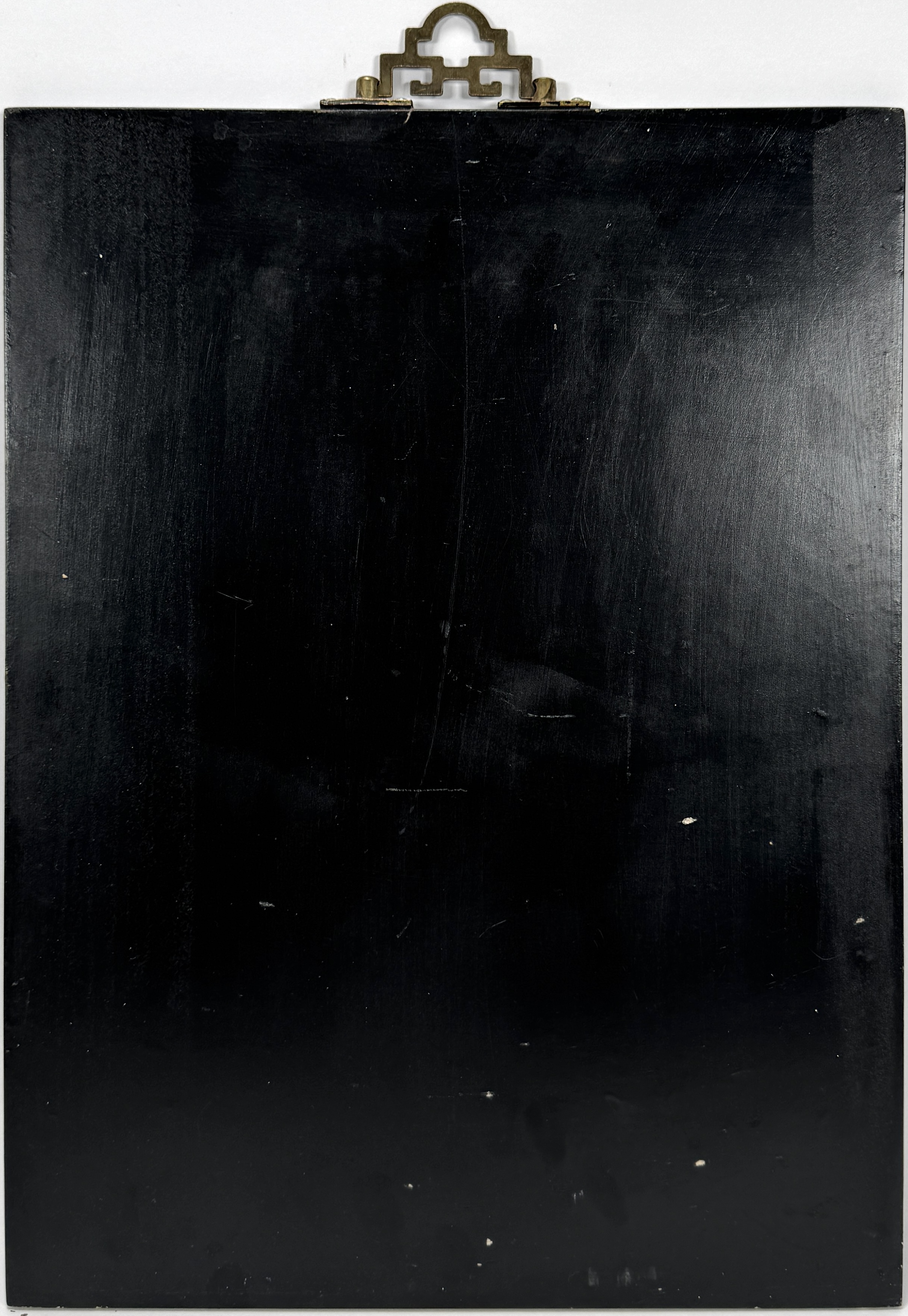 Schildering op hout met lak en gouache, Japans atelier, tweede helft 20e eeuw. Voorstelling van twee geisha’s in traditionele kleding, met goudkleurige achtergrond en zwarte glansrand. Uitgevoerd in ukiyo-e stijl en voorzien van een metalen ophangbeugel in geometrische vorm, decoratief paneel vervaardigd voor export. Registreer nu en bied eenvoudig online mee op dit paneel. |