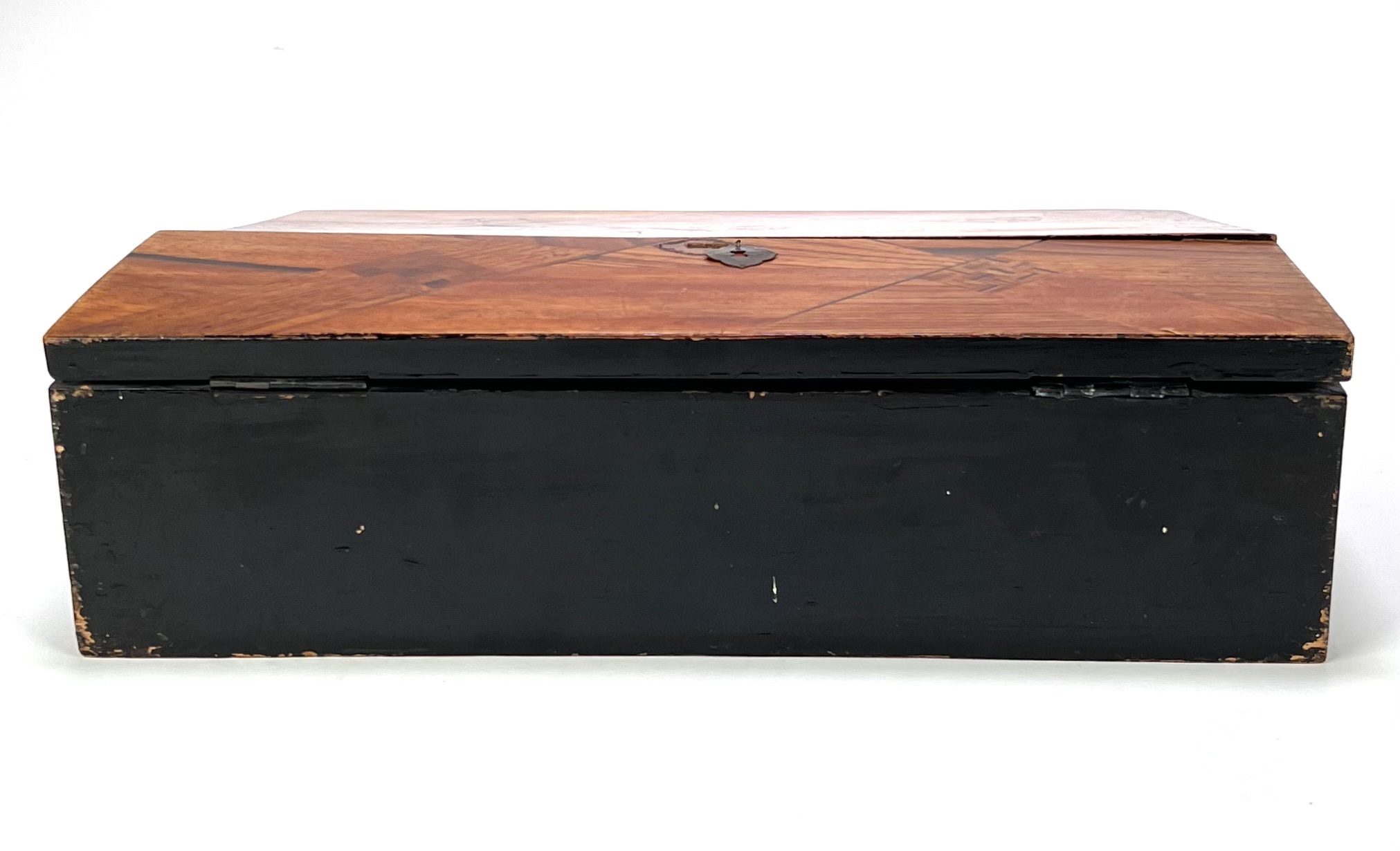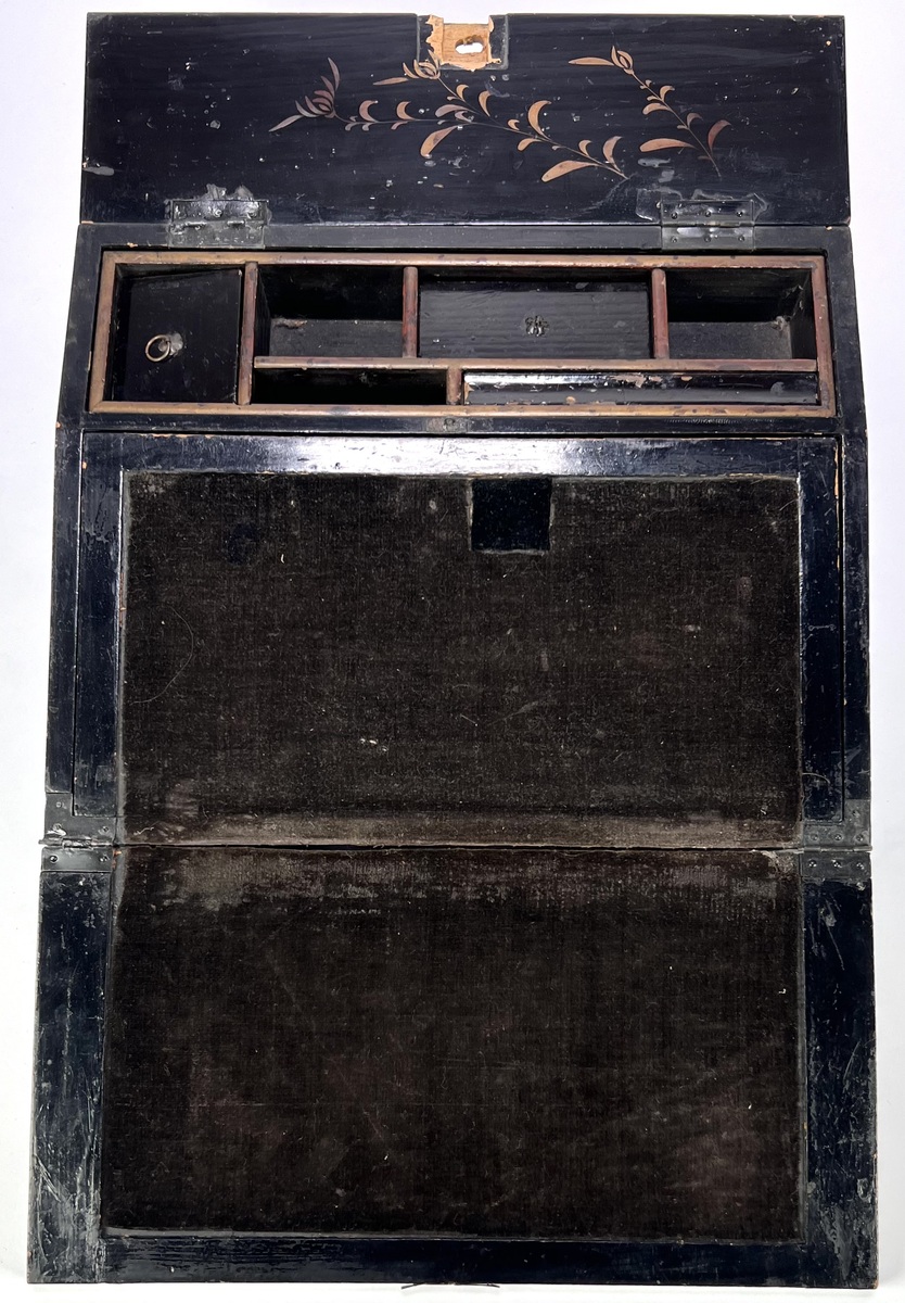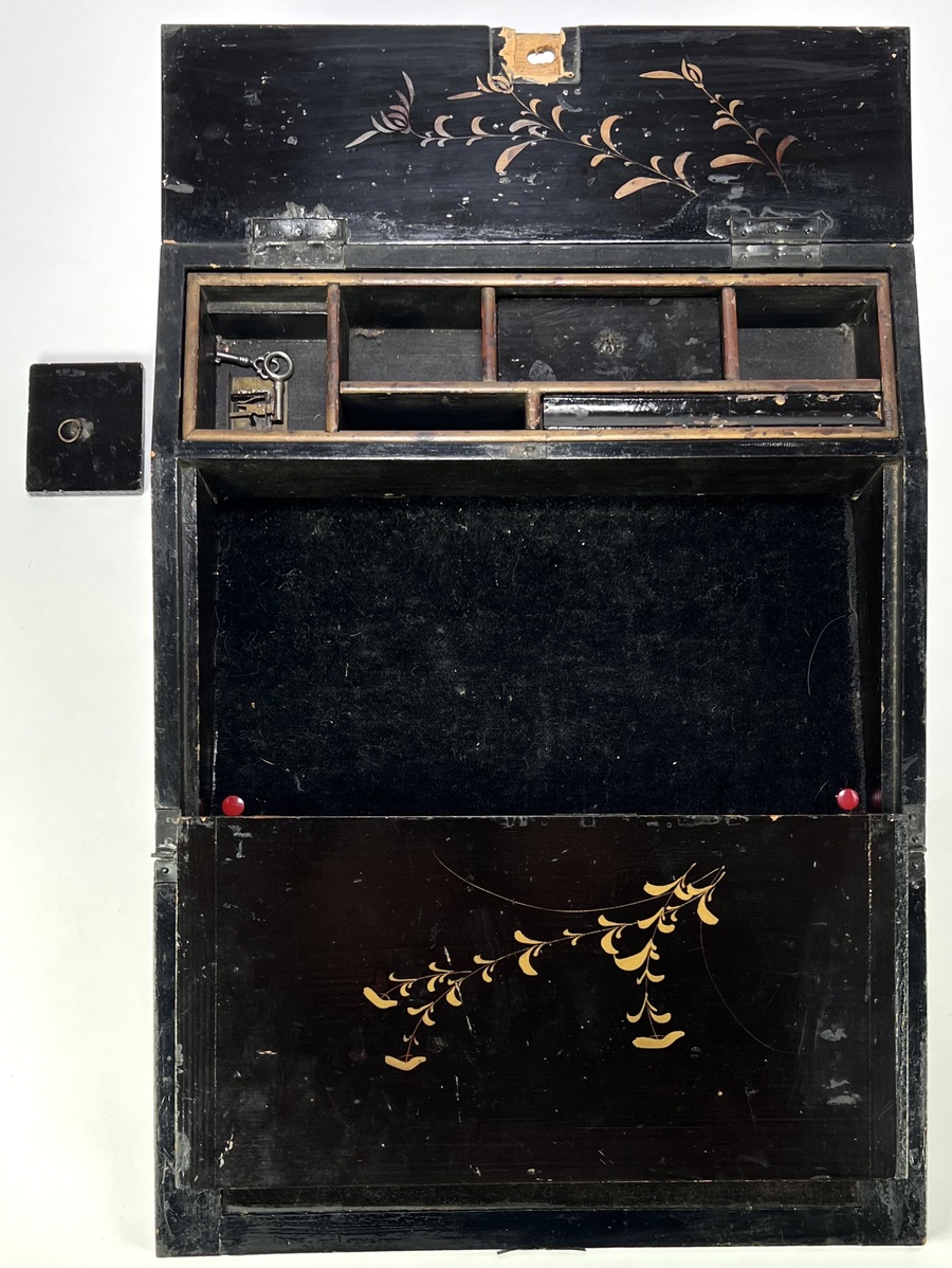 Antieke schrijfkist met een houten kern uit de midden 19e eeuw. Het deksel is gedecoreerd met marqueterie van contrasterende houtsoorten in een geometrisch patroon. De binnenkant is afgewerkt met zwart lakwerk in Japanse stijl en heeft een fluwelen schrijfoppervlak en interne compartimenten. Geïnteresseerd? Bezoek onze kijkdagen op 28, 29 of 30 november van 11:00 tot 17:00 uur! |