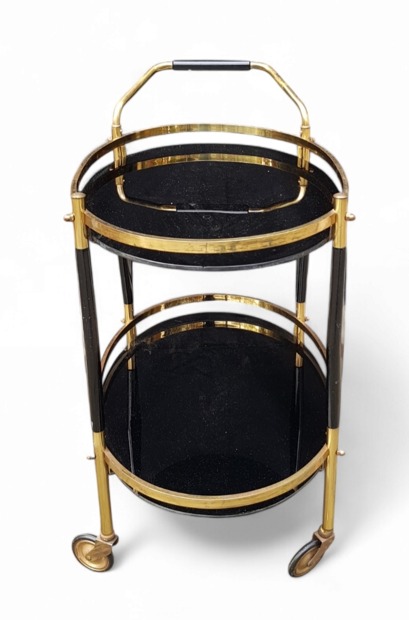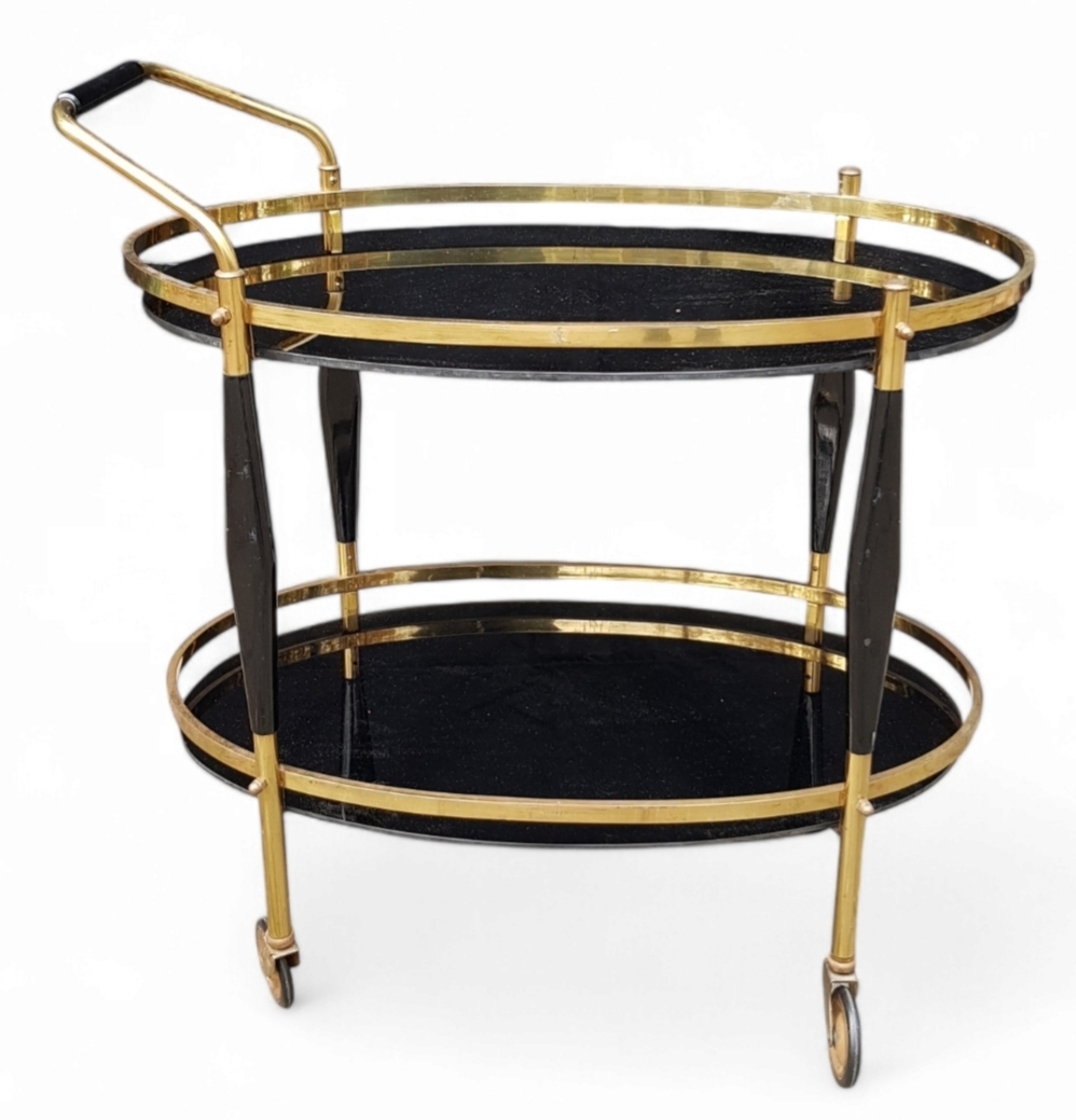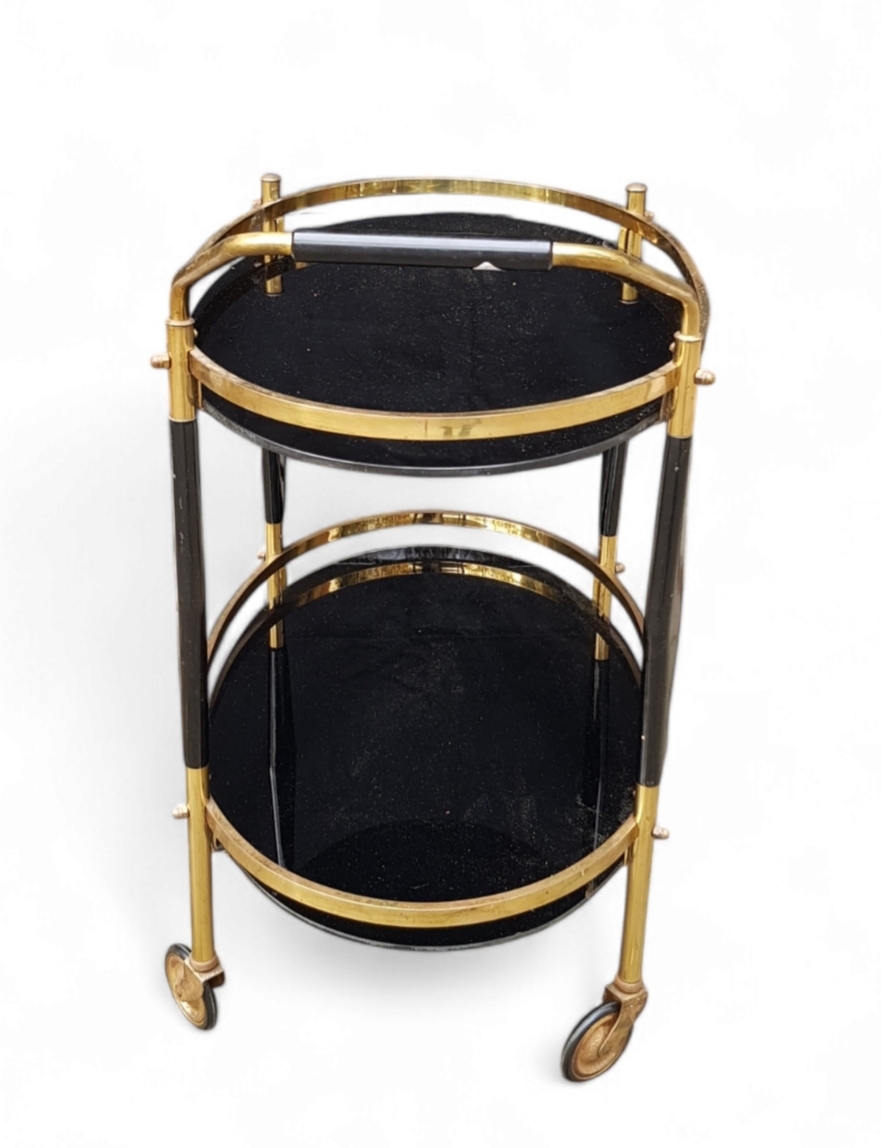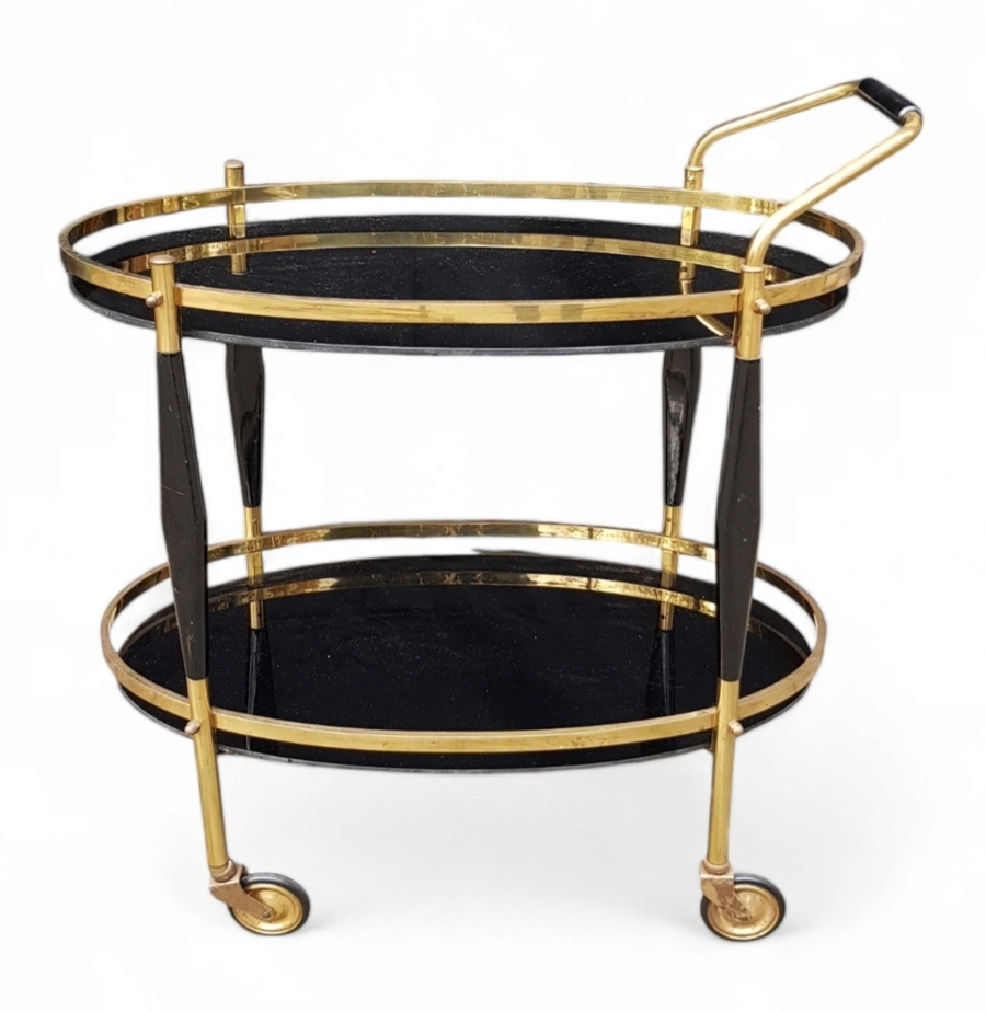 Messing theewagen met zwart glas, midden 20e eeuw