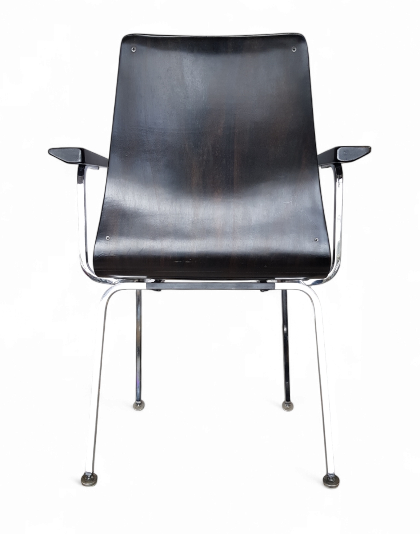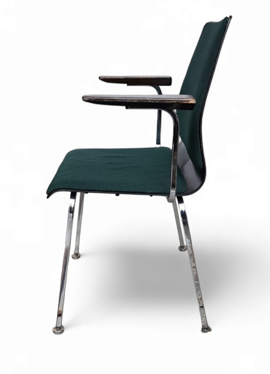Stoel (model SED 45) van Christof Stoll KG, Duitsland, uitgevoerd in Mid-century modern stijl uit circa 1960–1980. De stoel is vervaardigd met een frame van gebogen chroom en een schaal van geperst Pagholz hout, zitting en rugleuning zijn bekleed met donkergroene stof. Wil je direct deelnemen? Plaats vanaf 21 november alvast een schriftelijk bod via onze website! |