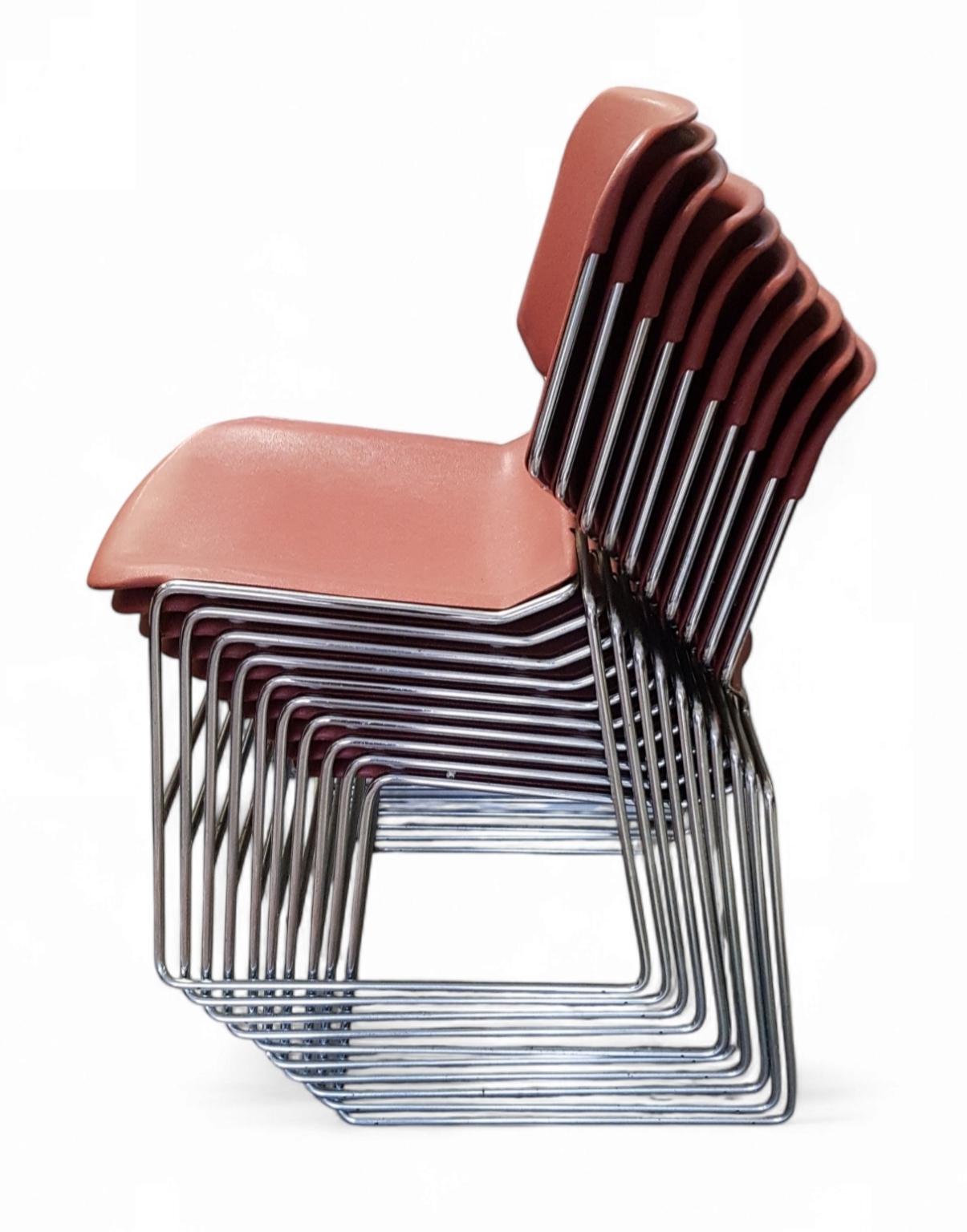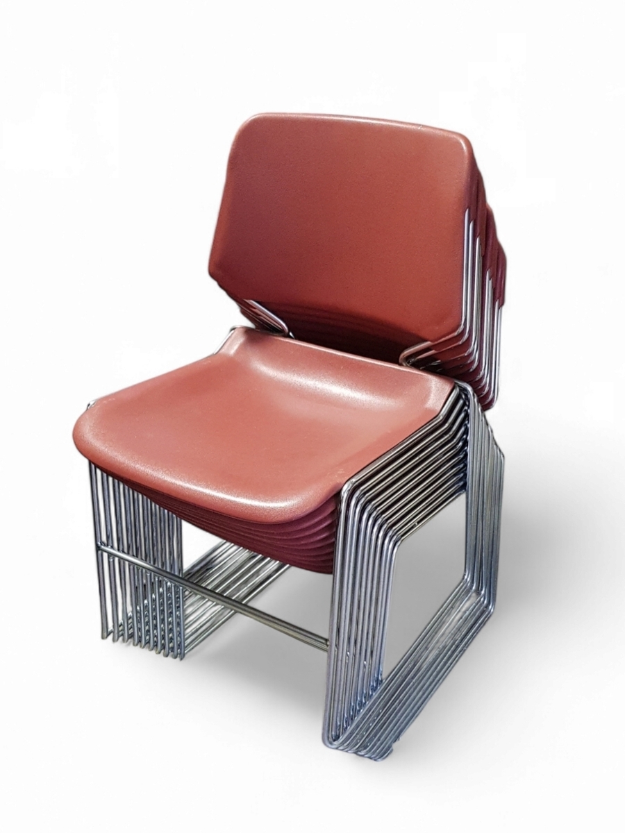 Tien stapelbare stoelen, model Matrix, design van Thomas Tolleson voor het Amerikaanse Krueger, gedateerd jaren 1970. De stoelen in Mid-century modern stijl, zijn vervaardigd uit een verchroomd stalen buisframe, gecombineerd met een terracotta kunststof kuipzitting. Wil je direct deelnemen? Plaats vanaf 21 november alvast een schriftelijk bod via onze website! |