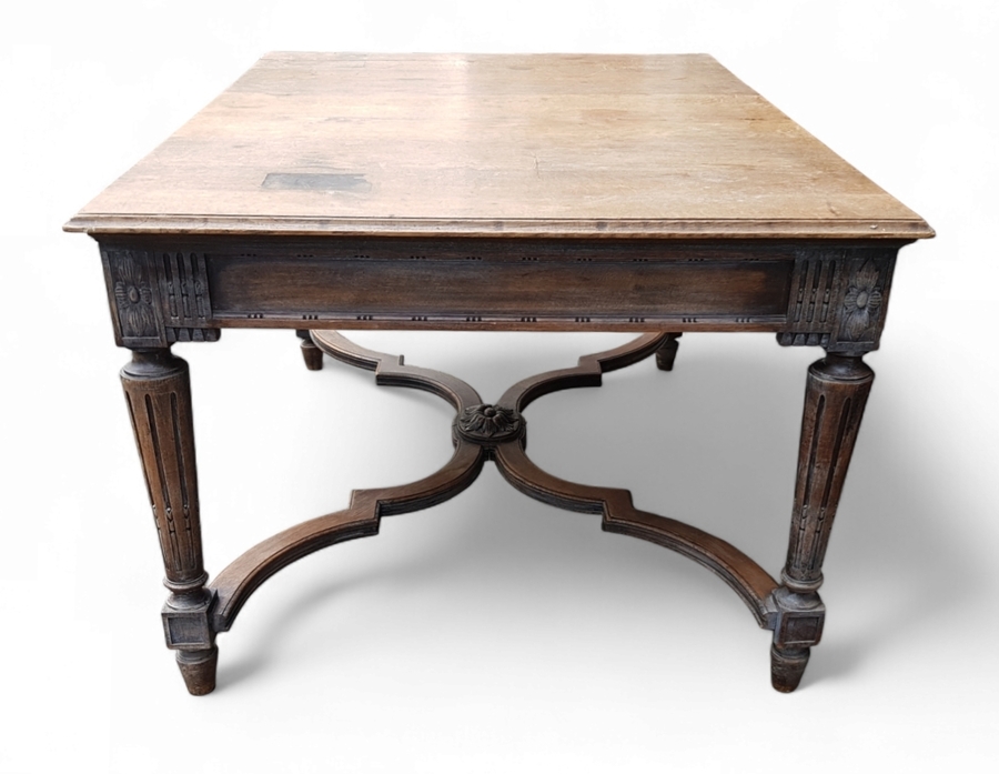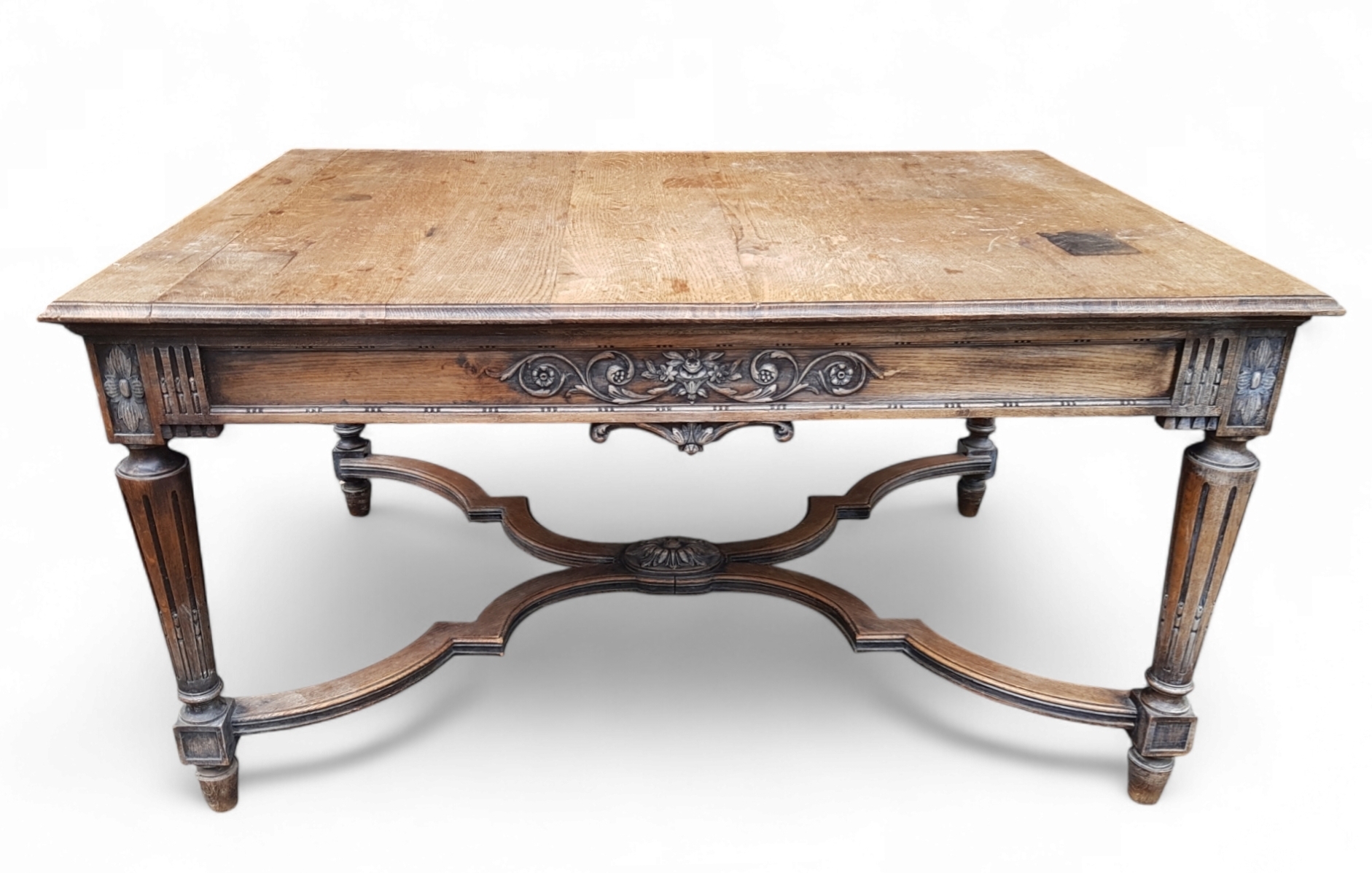 Massief eikenhouten tafel uitgevoerd in de neorenaissance stijl, daterend uit de tweede helft 19e eeuw. De tafel heeft een gekruist onderstel, vier zware gedraaide poten en een regel met rijk houtsnijwerk. Zeker zijn van deelname? Plaats vanaf 21 november een schriftelijk bod online! |