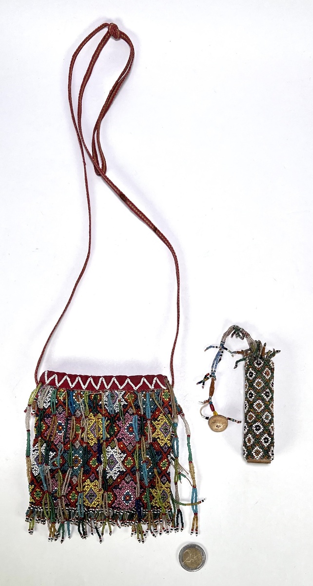 Masai gebruiksvoorwerpen uit Oost-Afrika, een schoudertas en een cilindrische koker, beide vervaardigd met handmatig kralenwerk op een basis van textiel. De tas heeft een veelkleurig dicht geometrisch ruitpatroon en lange kralen franjes aan de onderzijde. Tweede helft 20e eeuw en is typerend voor de traditionele Masai-cultuur. Je bent welkom op onze kijkdagen op 28, 29 en 30 november! |