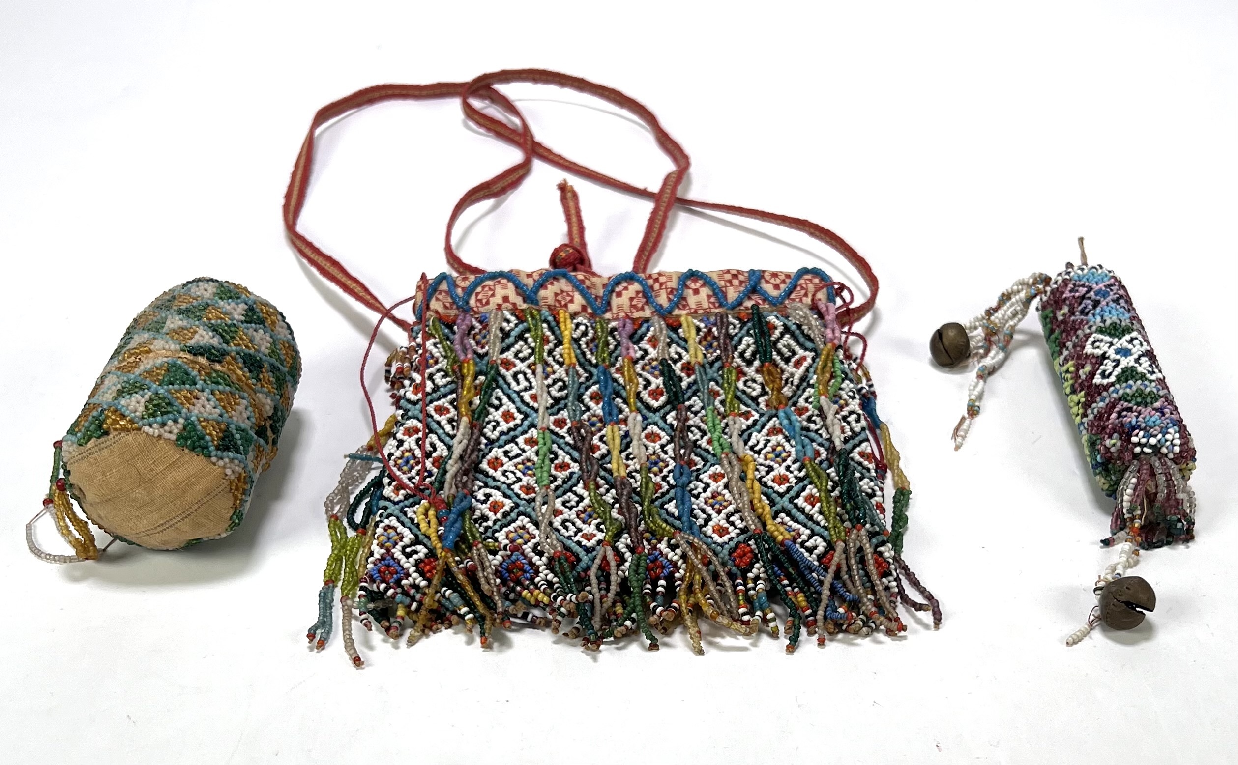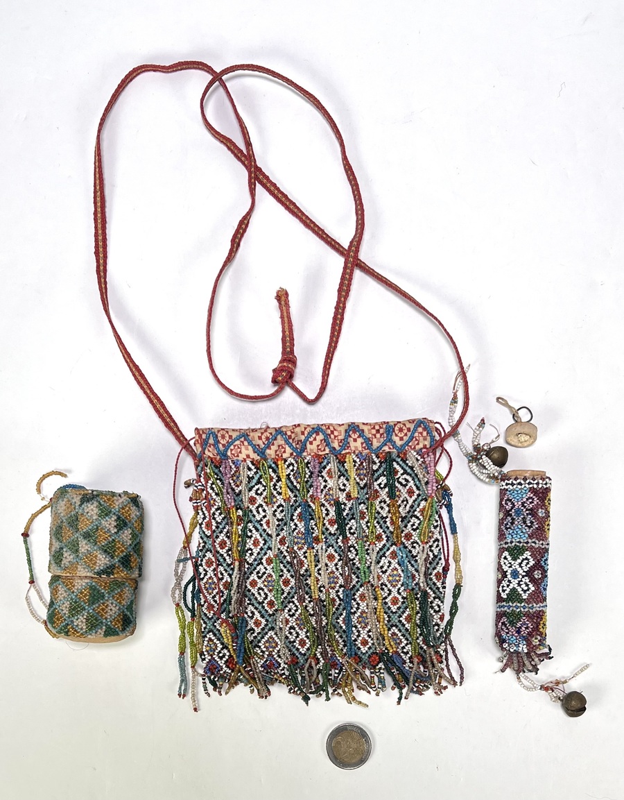 Masai gebruiksvoorwerpen uit Oost-Afrika, een schoudertas en een twee cilindrische kokers, beide vervaardigd met handmatig kralenwerk op een basis van textiel. De tas heeft een veelkleurig dicht geometrisch ruitpatroon en lange kralen franjes aan de onderzijde. Tweede helft 20e eeuw en is typerend voor de traditionele Masai-cultuur. Jouw kans op dit object begint met registreren – bied live of online mee! |
