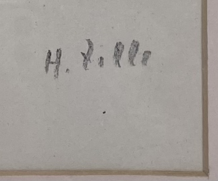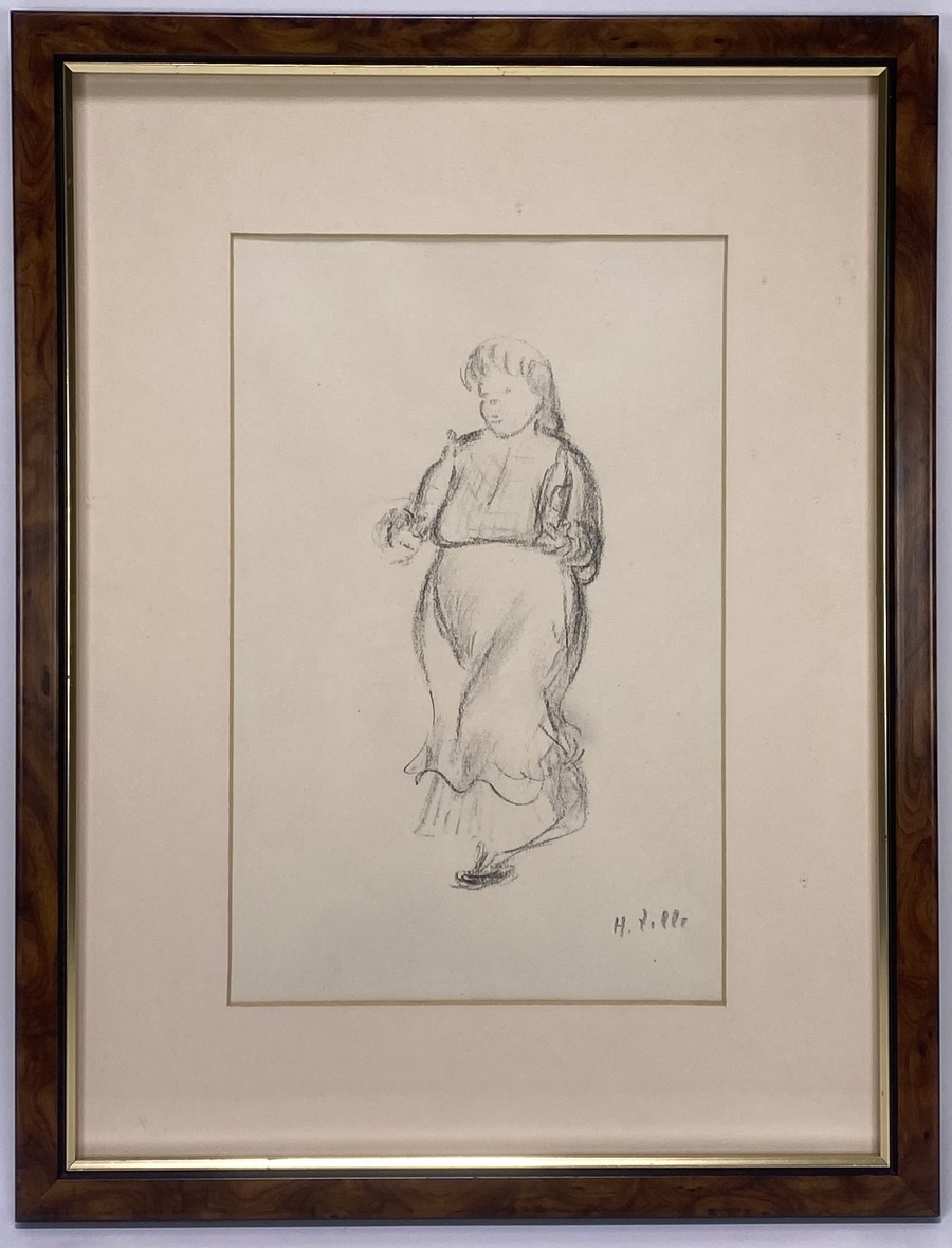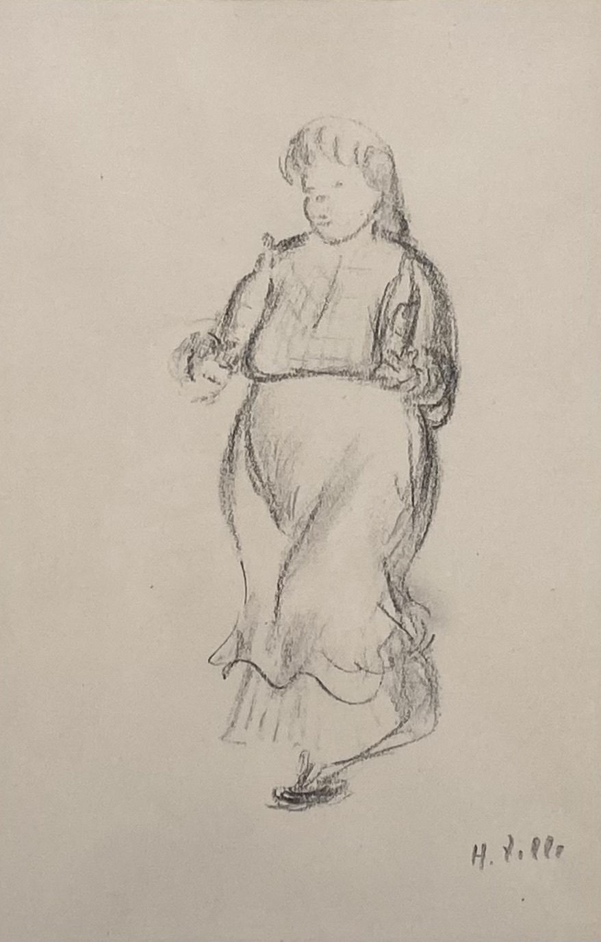 Potloodtekening op papier, voorstellende een staand kind in eenvoudige kleding, uitgevoerd in losse impressionistische stijl. De contouren zijn schetsmatig, met lichte arcering en minimale uitwerking van gelaat en houding. Rechtsonder gesigneerd met “H. Tille”. Registreer nu en bied eenvoudig online mee op deze tekening! |