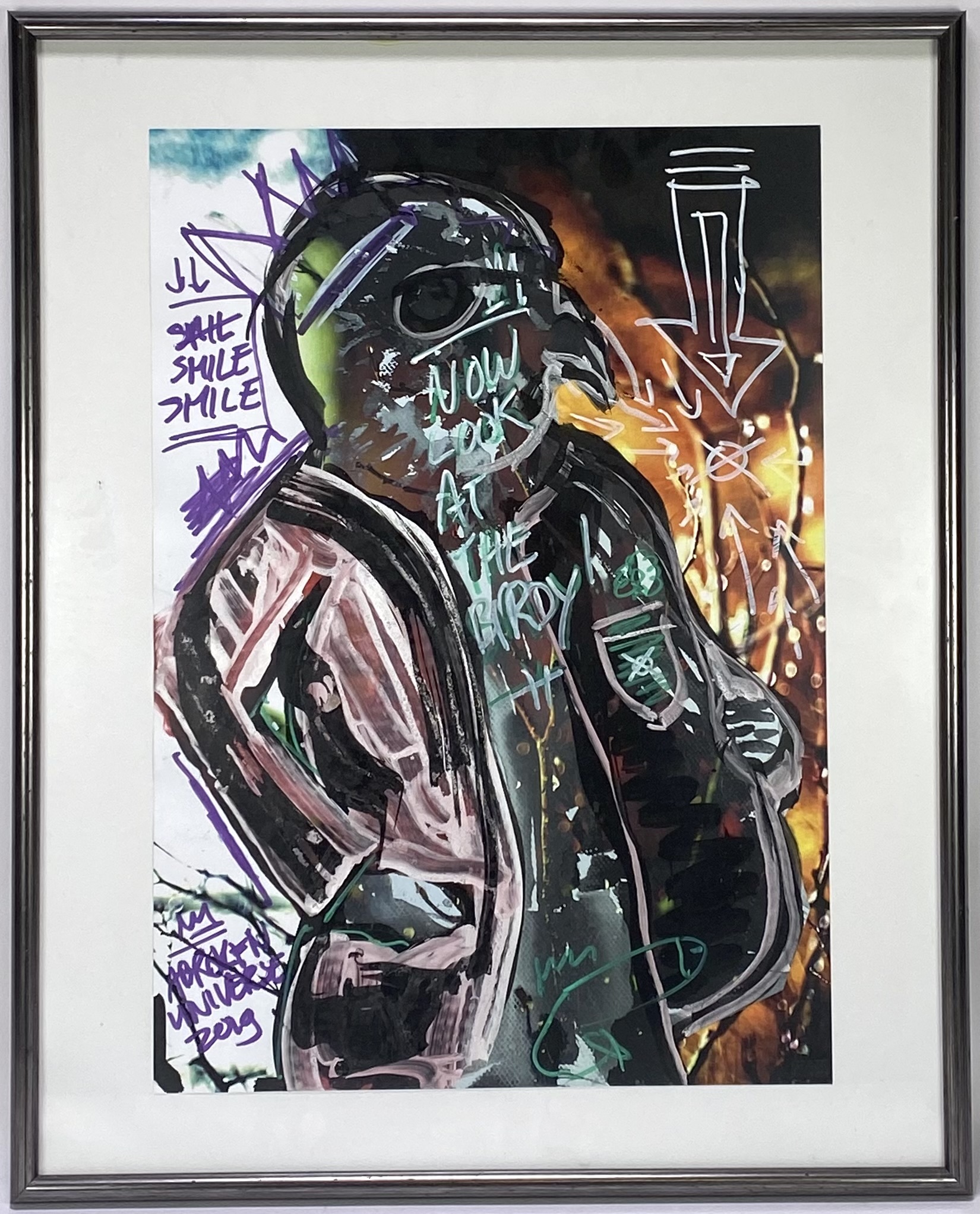 Gemengde techniek op papier door A Broken Universe (Ecuadoraanse kunstenaar, gevestigd in Nederland), uitgevoerd in acryl, spuitverf en inkt over fotoprint, getiteld “Now Look at the Birdy”, gesigneerd en gedateerd 2019. Het werk toont een hybride vogelmensfiguur in expressieve Street Art stijl met tekstuele elementen en graffiti-achtige lijnen. Uitgevoerd in een zilverkleurige lijst. Zeker zijn van deelname? Plaats vanaf 21 november een schriftelijk bod online! |
