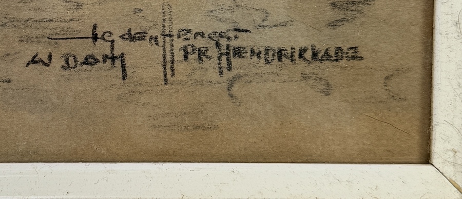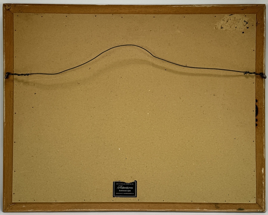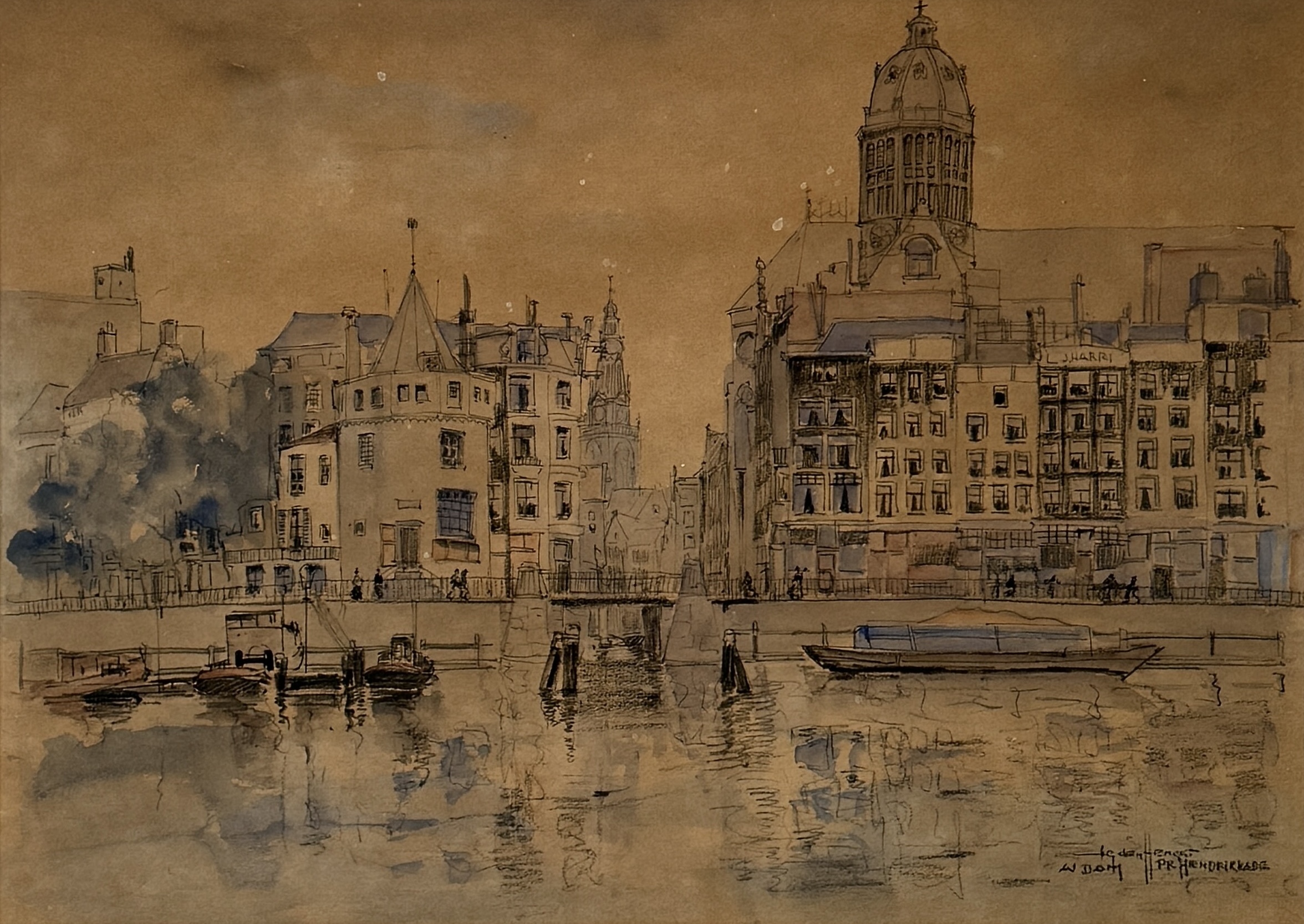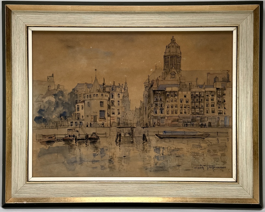 Tekening door J.G. Den Hengst (1904–1983), uitgevoerd in potlood, inkt en aquarel op papier, circa 1940–1960, voorstellend het Prins Hendrikkade te Amsterdam met zicht op de Sint-Nicolaaskerk. Het werk toont een stedelijk haven tafereel met boten, waterreflecties en historische bebouwing. Gesigneerd en getiteld rechtsonder “J.G. den Hengst PR Hendrikkade”, voorzien van goudkleurige lijst. Geïnteresseerd? Bezoek onze kijkdagen op 28, 29 of 30 november van 11:00 tot 17:00 uur! |