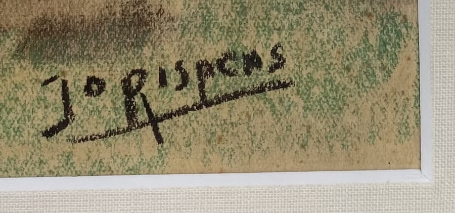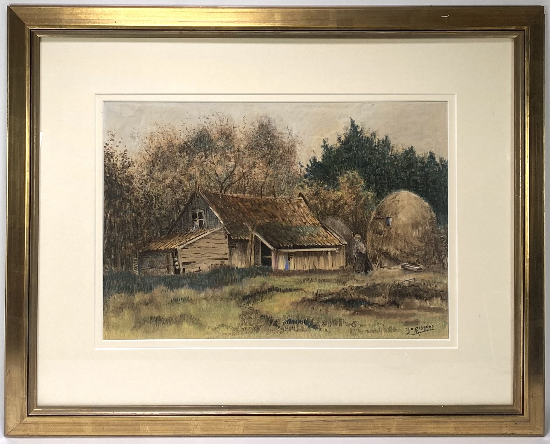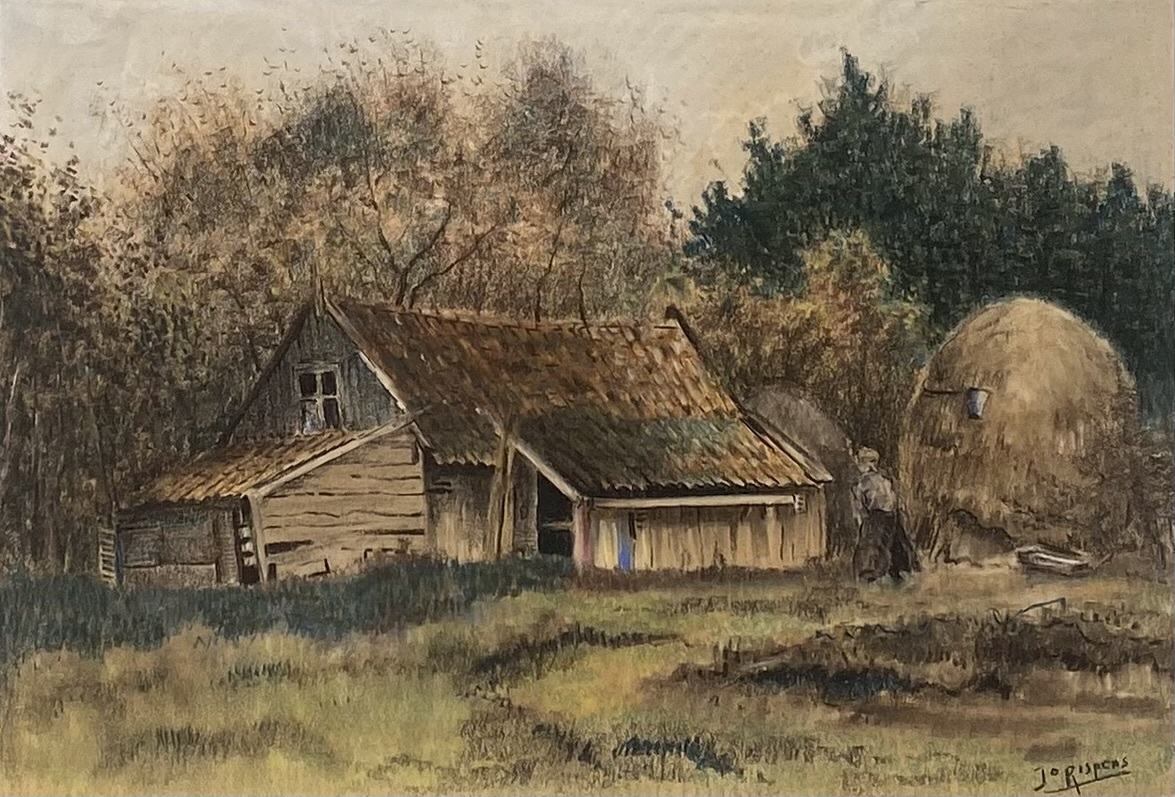 Gouache door Jo Rispens (1914–2002) op papier, circa 1940–1960, in een losse impressionistische stijl. De landelijke voorstelling toont een houten boerderij met een schuur en een hooimijt, omgeven door bomen in herfsttinten. Gesigneerd "Jo Rispens" rechtsonder in zwart. Klaar om te bieden? Registreer je nu en doe mee aan de veiling! |