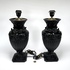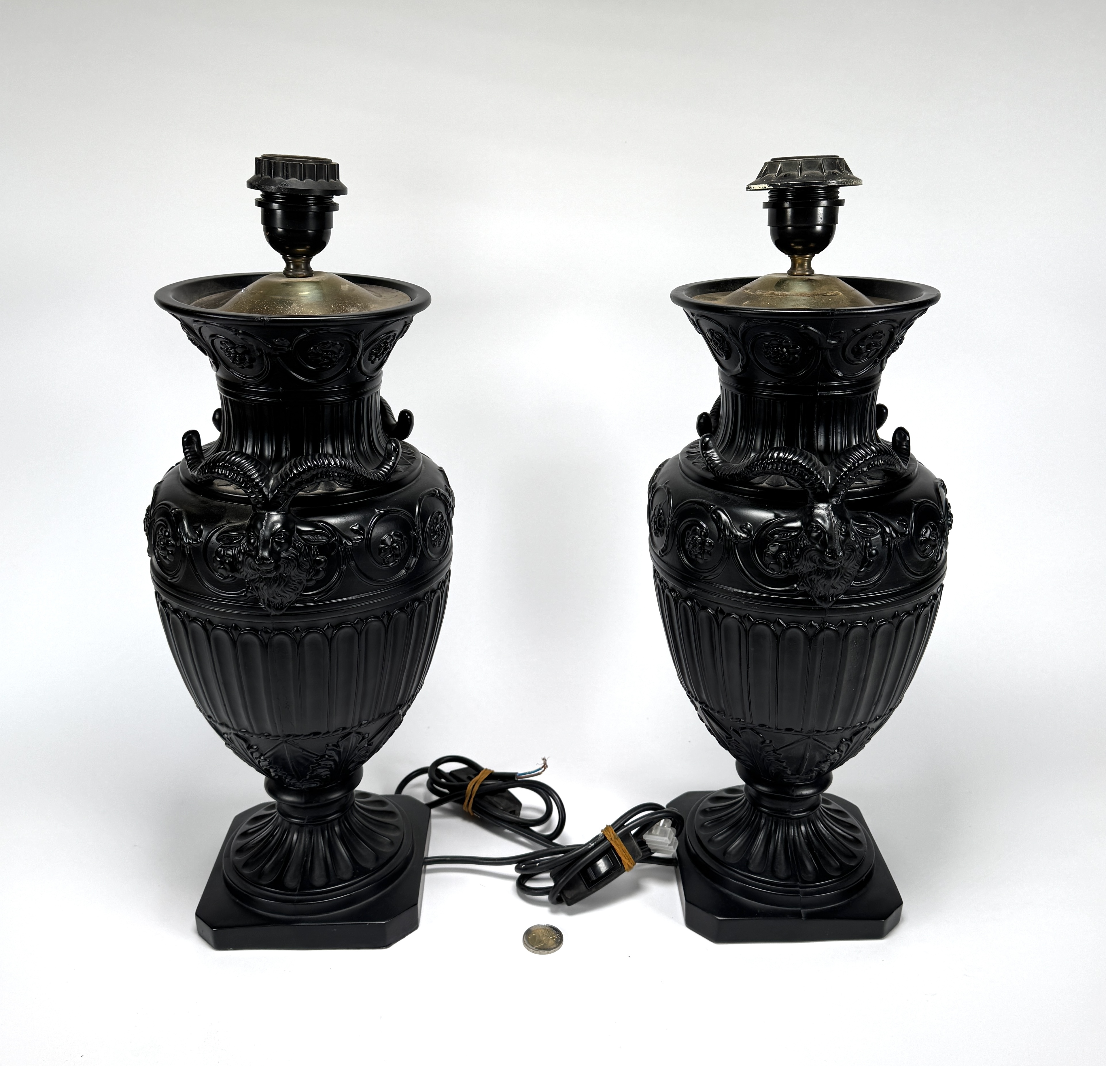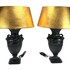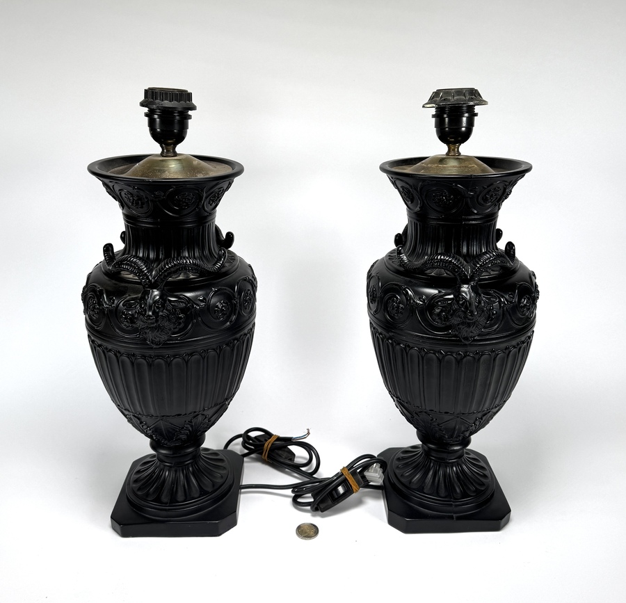 Paar neoklassieke tafellampen in empirestijl, vervaardigd uit zwart gepatineerd metaal met giettechniek. De balustervormige voet is voorzien van lauwerkransen, leeuwenkoppen en cannelures geplaatst op een vierkante sokkel. Afgewerkt met goudkleurige lampenkappen, Europa, midden 20e eeuw. Wil je deze tafellampen in het echt bekijken? Kom naar de kijkdagen op 28, 29 en 30 november! |