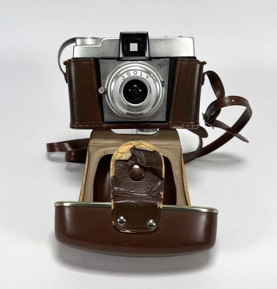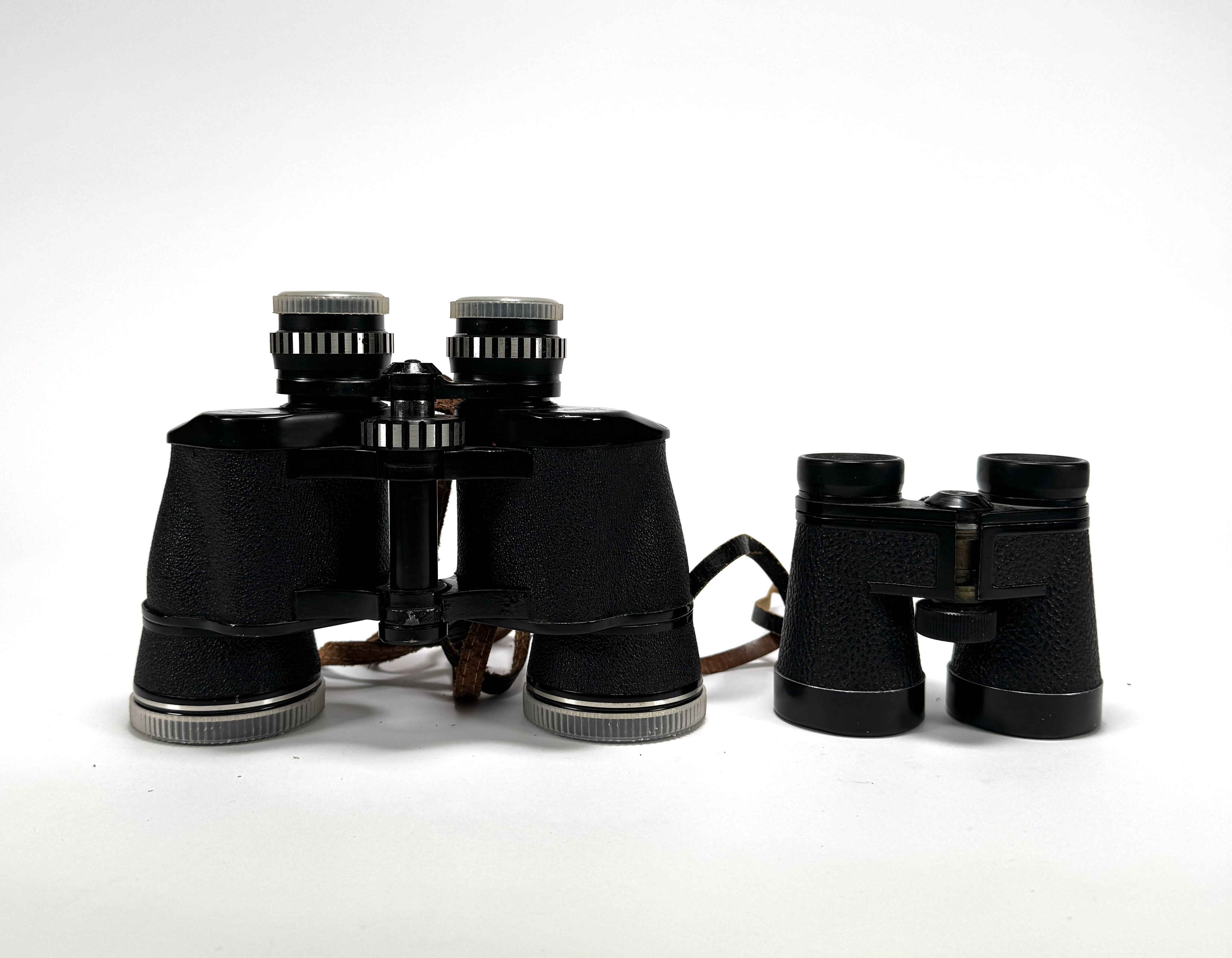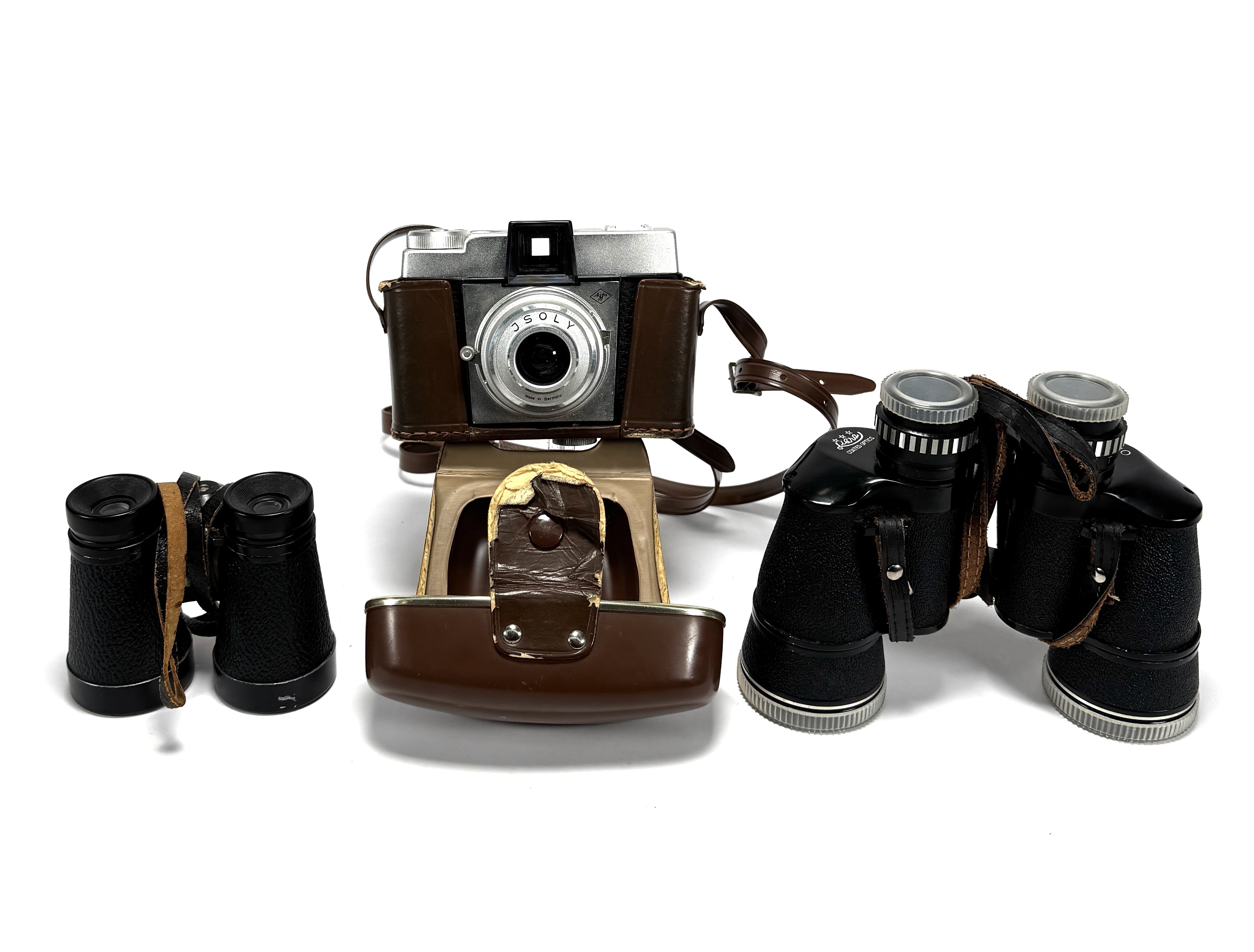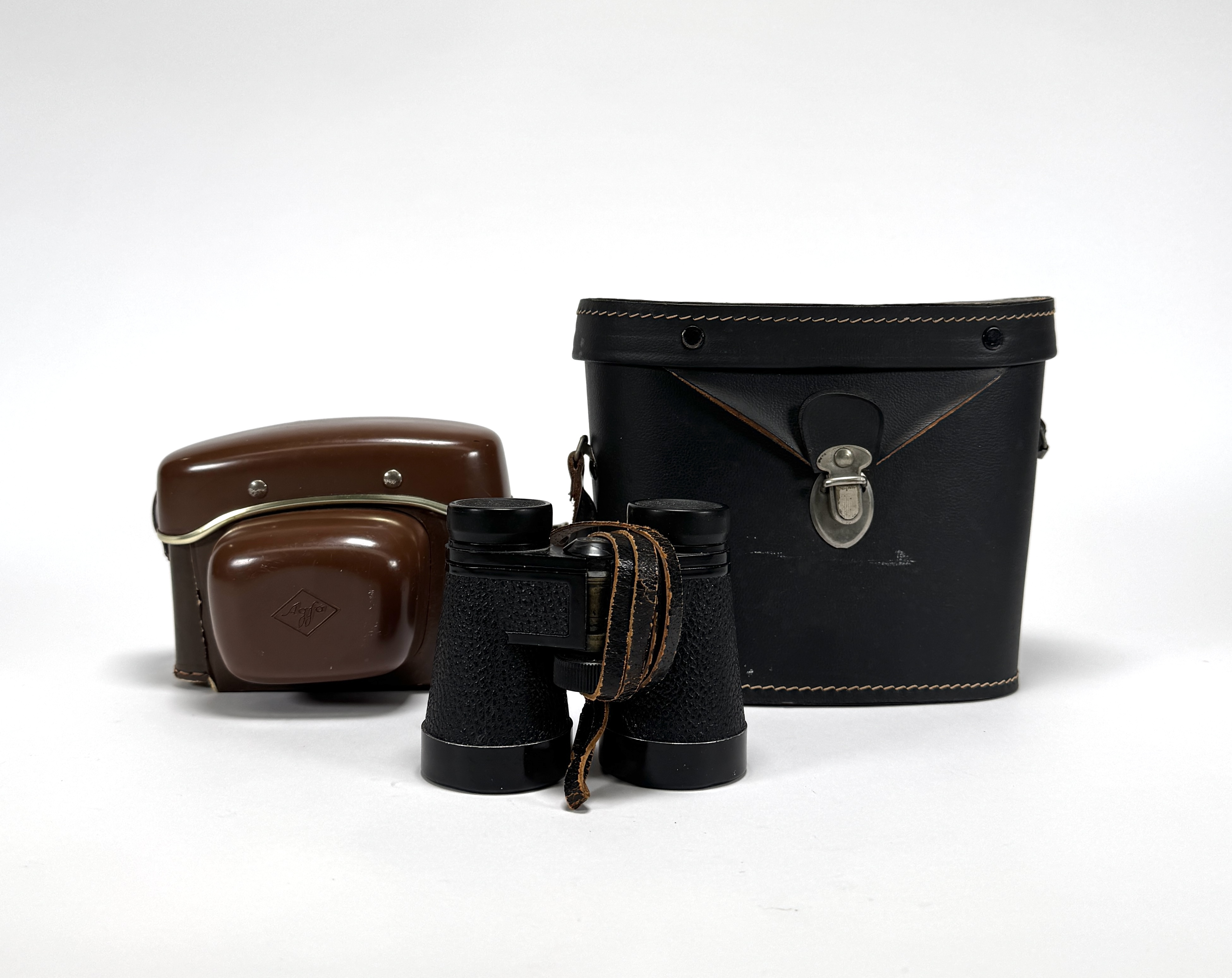 Twee verrekijkers en een camera vervaardigd uit metaal, kunststof en leer, daterend van circa 1955–1975. De kavel omvat een Agfa Isoly camera van Duitse makelij met de oorspronkelijke lederen tas. Daarnaast bevat de kavel twee verrekijkers, waaronder een gemerkt "Libra 7x50", met bijbehorende draagriemen. Kom langs tijdens de kijkdagen (28 t/m 30 november) en ontdek dit kavel zelf! |