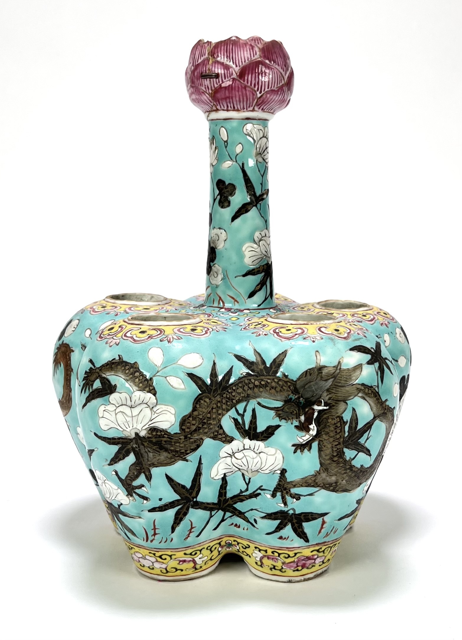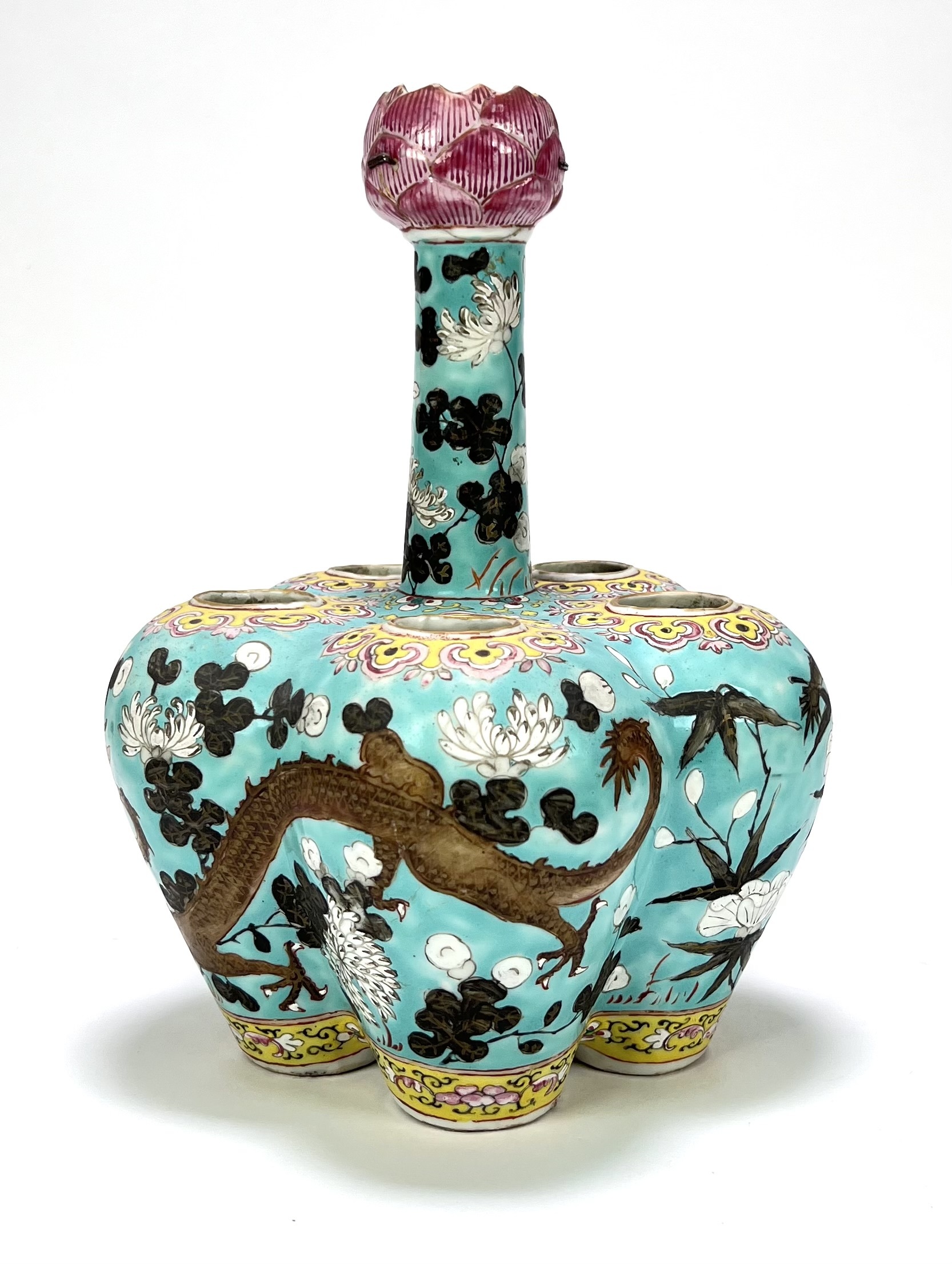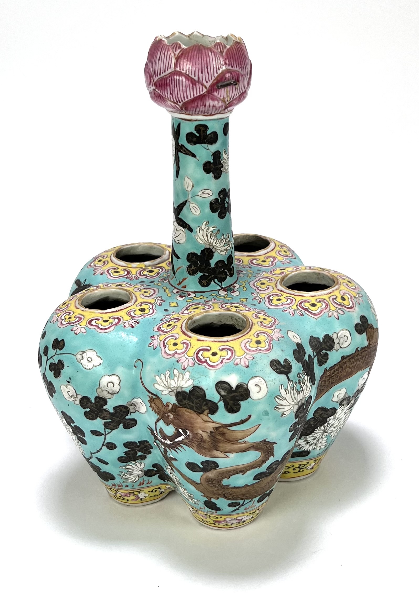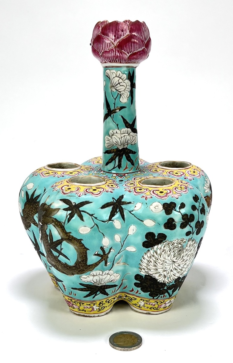 Porseleinen famille rose vaas met vijf tuiten, uitgevoerd in de late Qing-dynastie, ca. eind 19e eeuw, China. Handbeschilderd met meerkleurig emaildecor van vliegende draken, bloeiende chrysanten en takken tegen turquoise fond. De bovenrand in meer lobbige vorm met een lotusbloem kelk aan de top met roze glazuur. Zeker zijn van deelname? Plaats vanaf 21 november een schriftelijk bod online! |