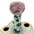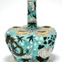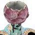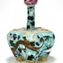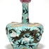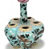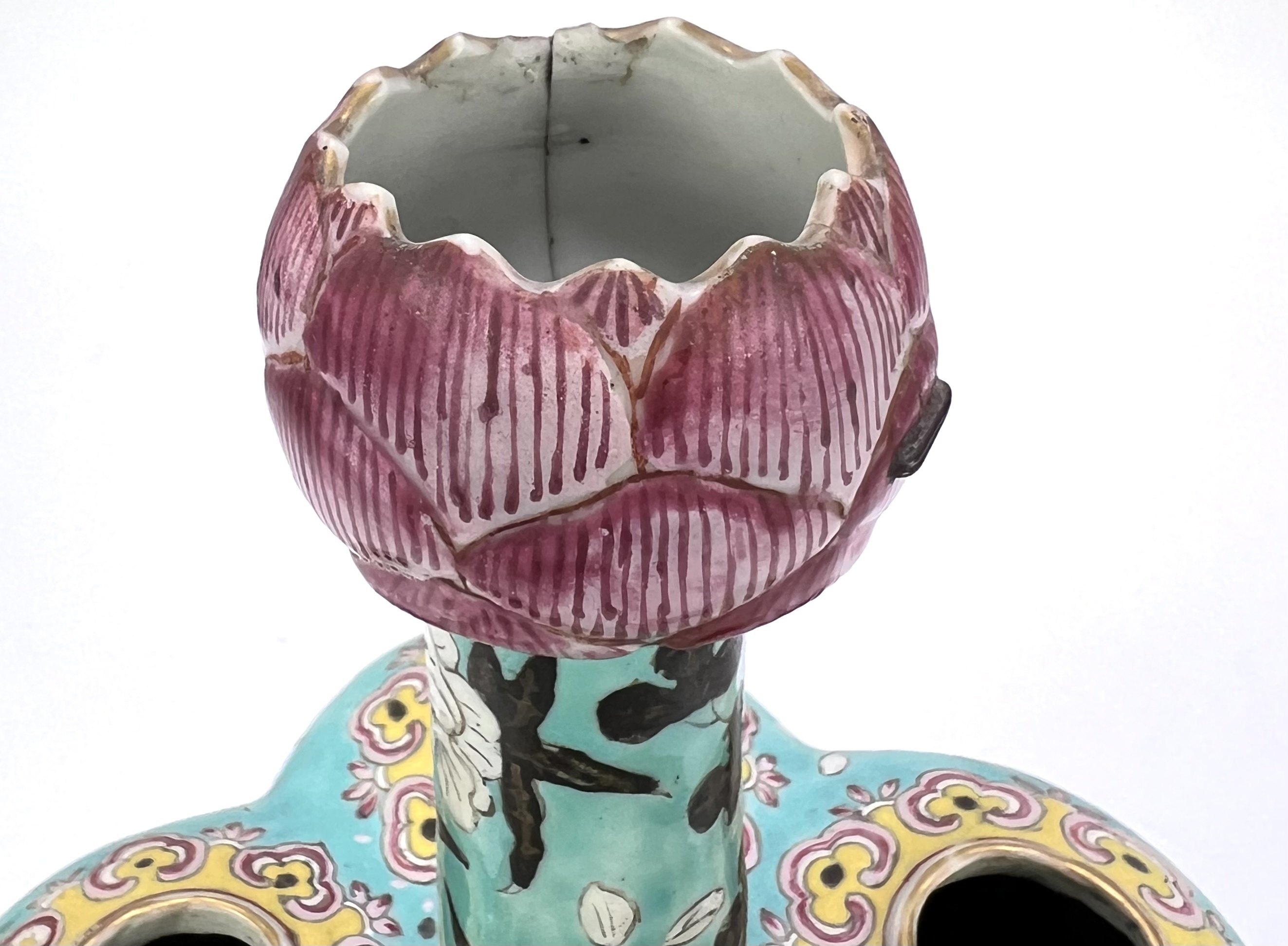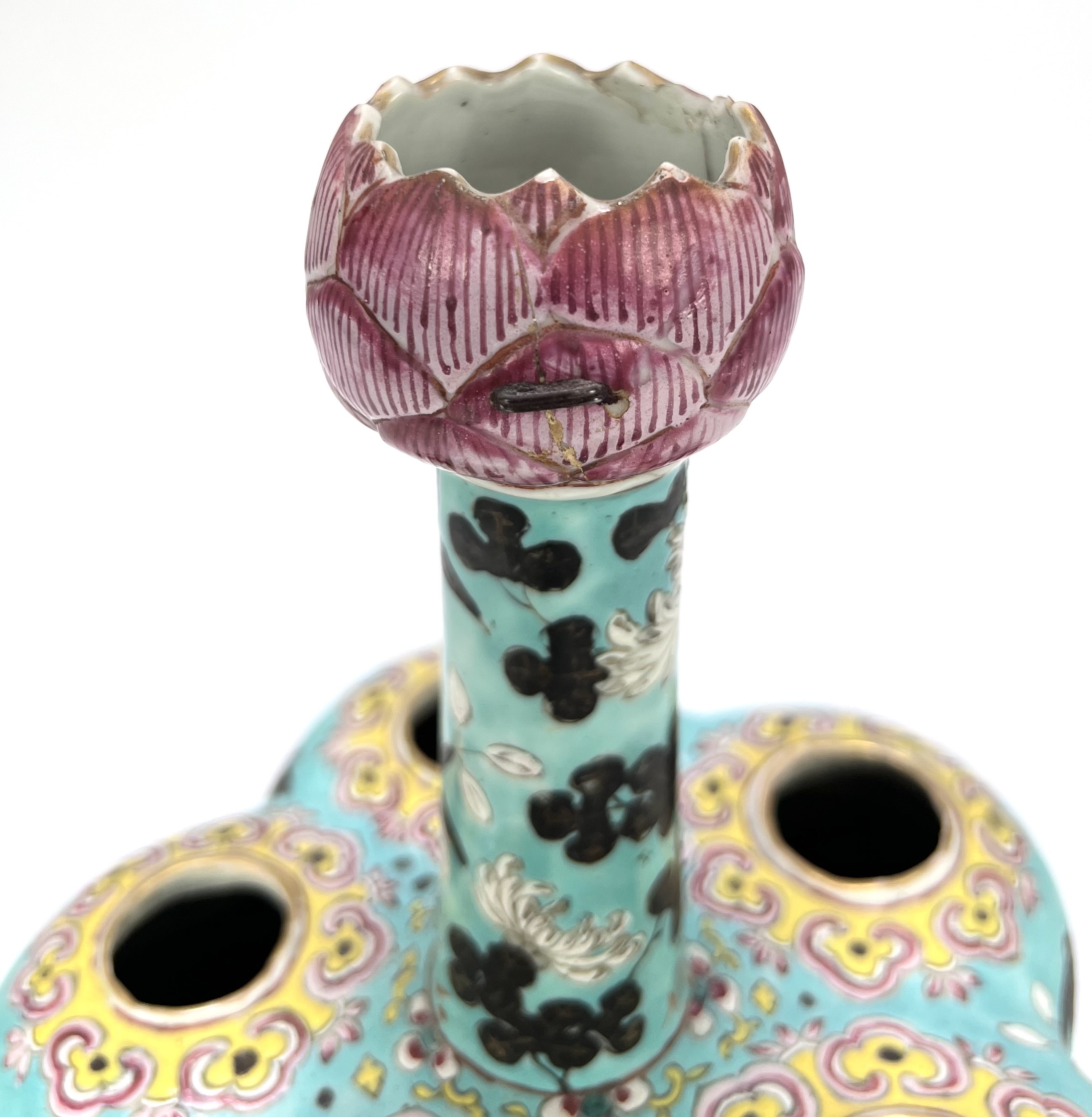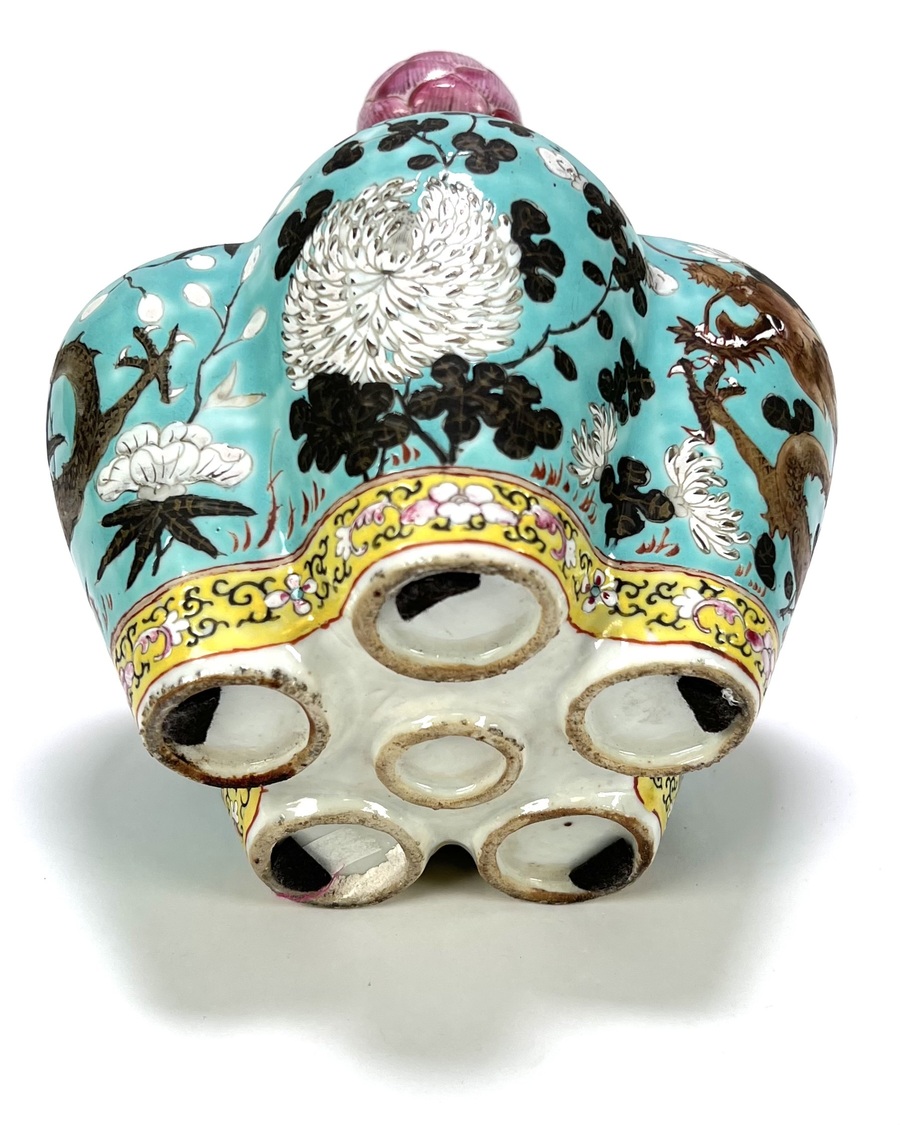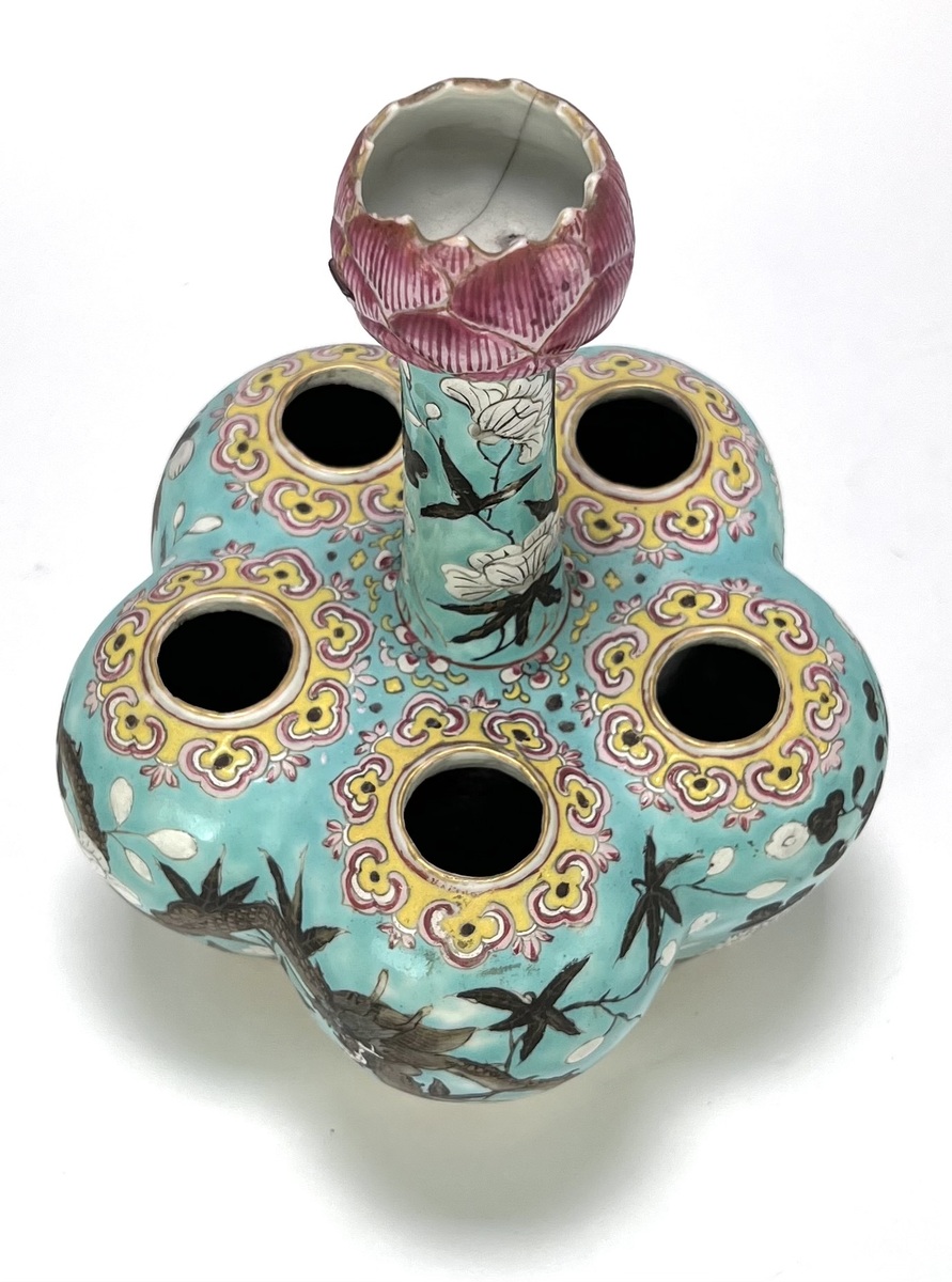 Porseleinen famille rose vaas met vijf tuiten, uitgevoerd in de late Qing-dynastie, ca. eind 19e eeuw, China. Handbeschilderd met meerkleurig emaildecor van vliegende draken, bloeiende chrysanten en takken tegen turquoise fond. De bovenrand in meer lobbige vorm met een lotusbloem kelk aan de top met roze glazuur. Zeker zijn van deelname? Plaats vanaf 21 november een schriftelijk bod online! |