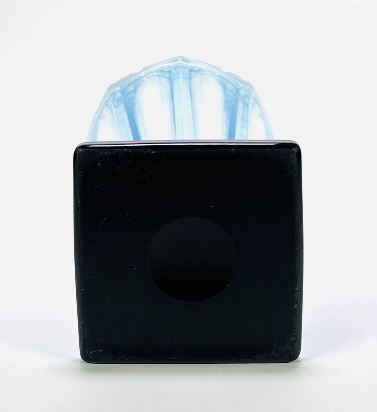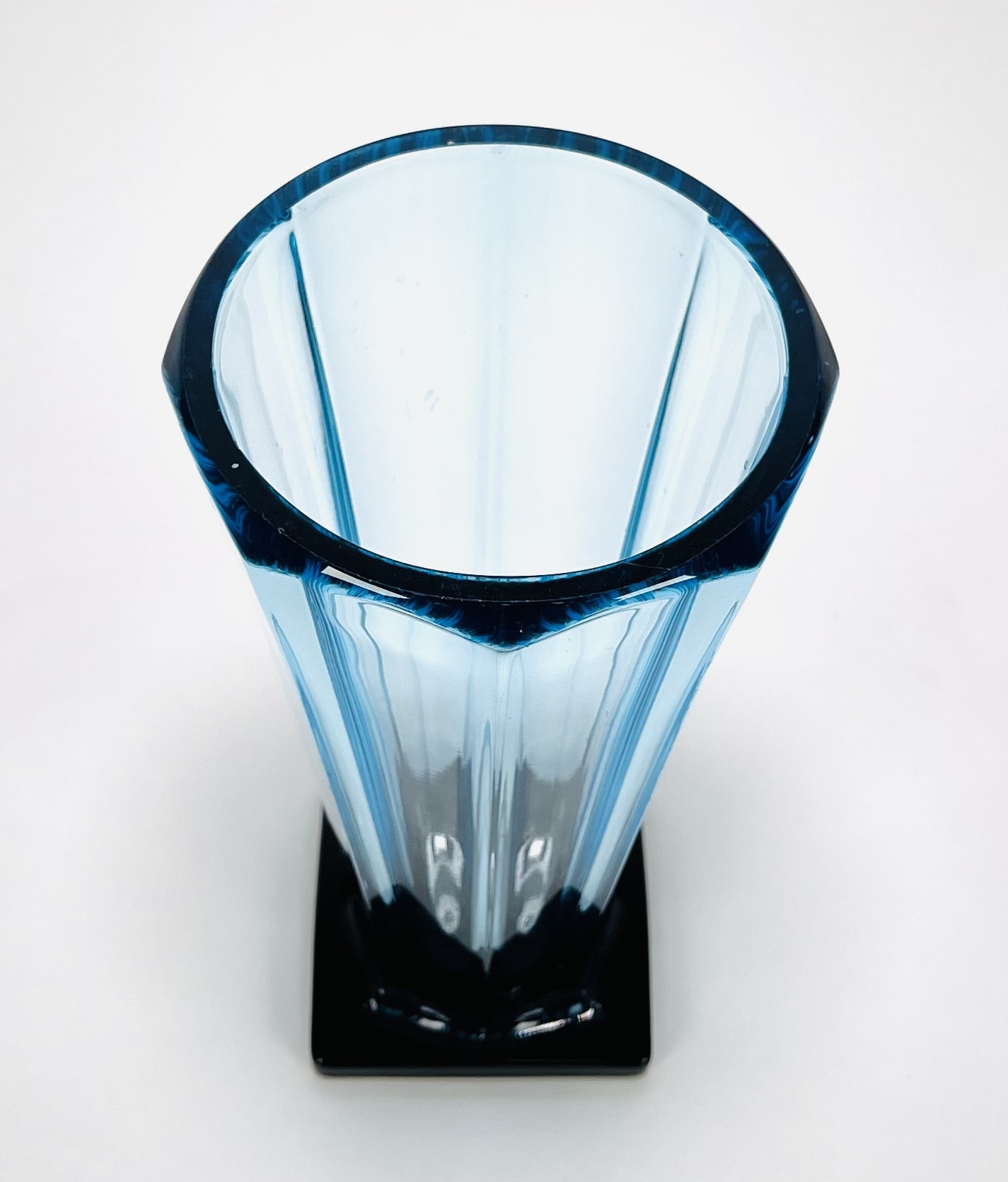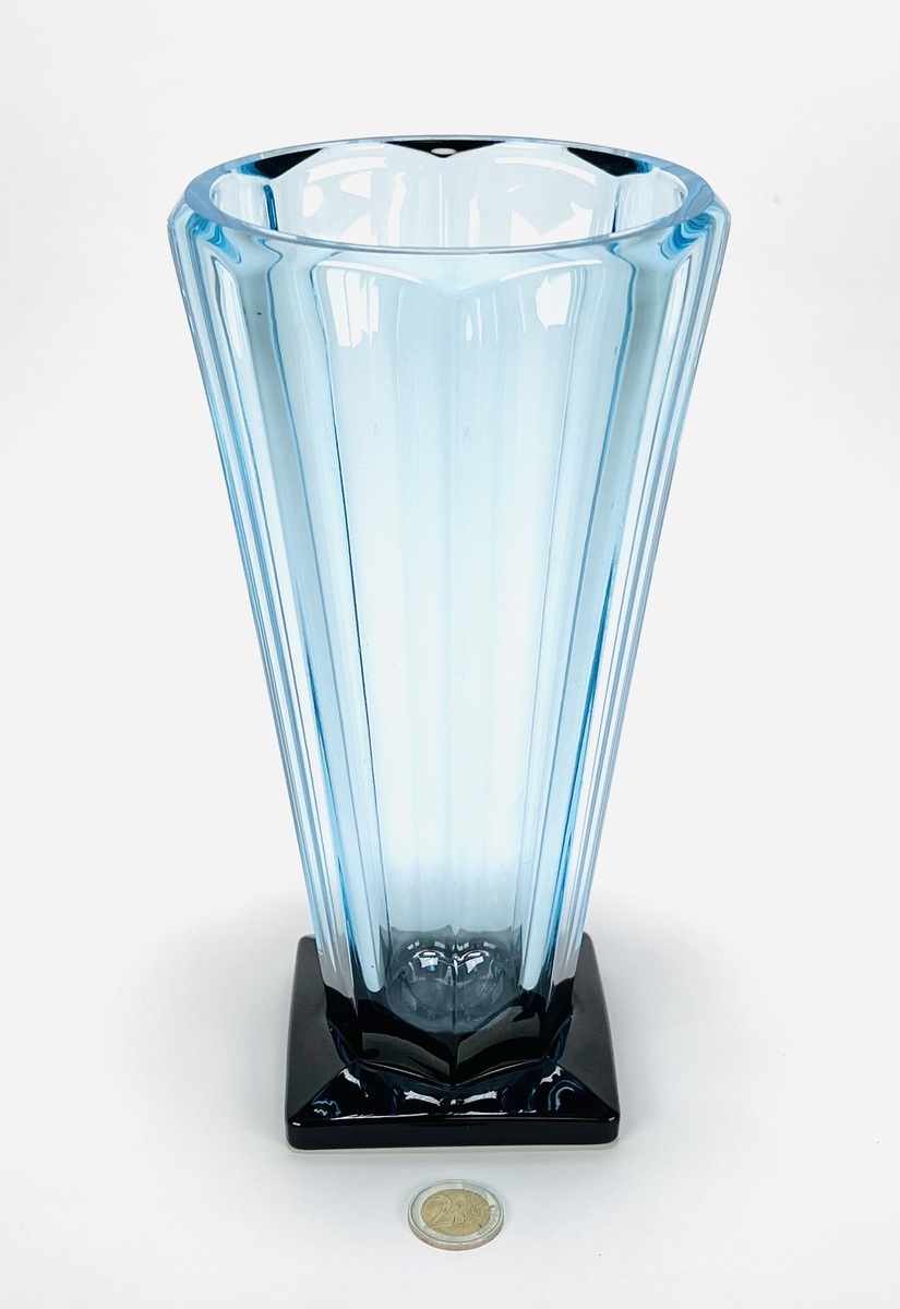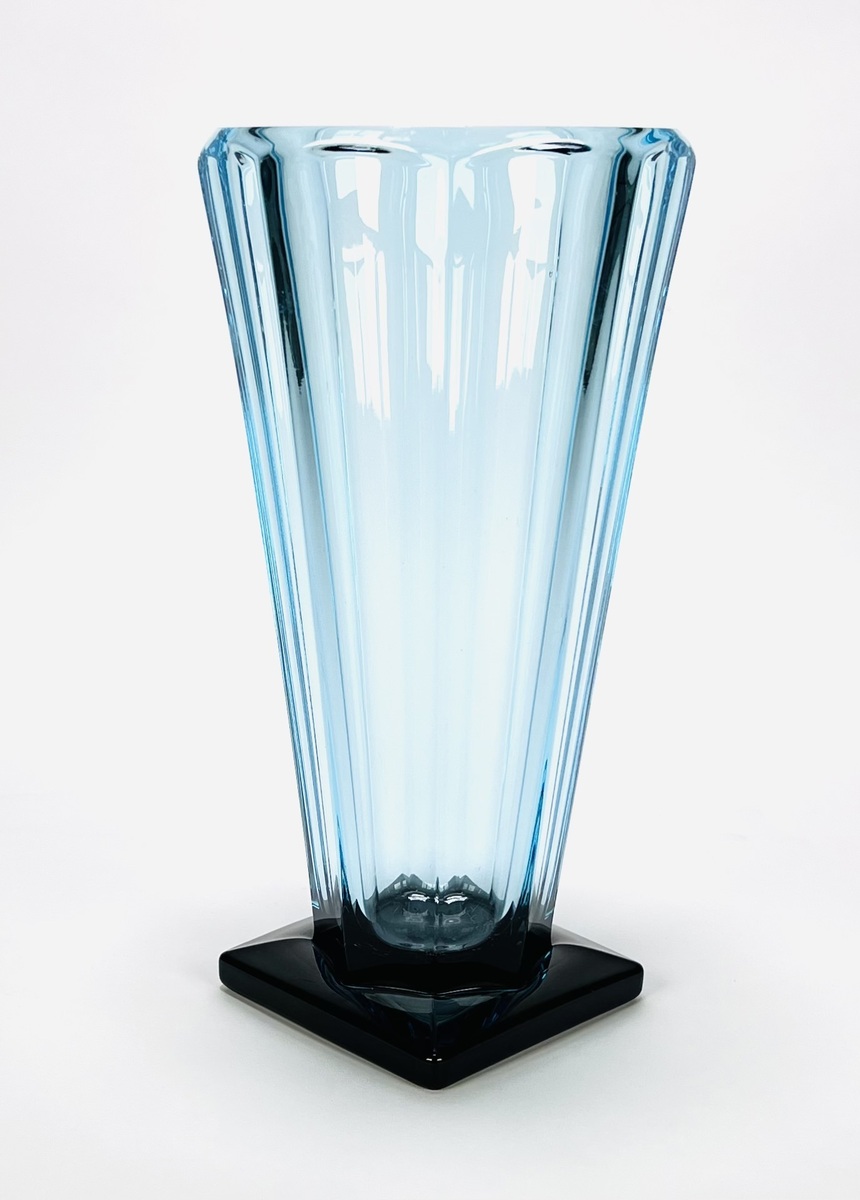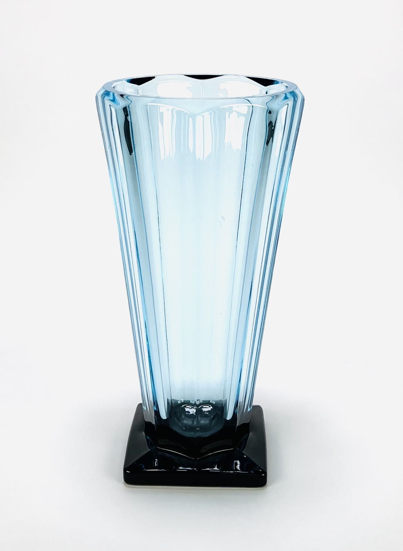 Art Deco vaas van persglas, vervaardigd in Europa omstreeks 1930. Het vaas toont een hoog conisch model met verticaal gefacetteerde wand, uitgevoerd in transparant blauw glas met zwart vierkant voetstuk. De techniek is kenmerkend voor seriële glasproductie uit de interbellumperiode. Herkomst vermoedelijk Tsjecho-Slowakije. Geïnteresseerd? Bezoek onze kijkdagen op 28, 29 of 30 november van 11:00 tot 17:00 uur! |