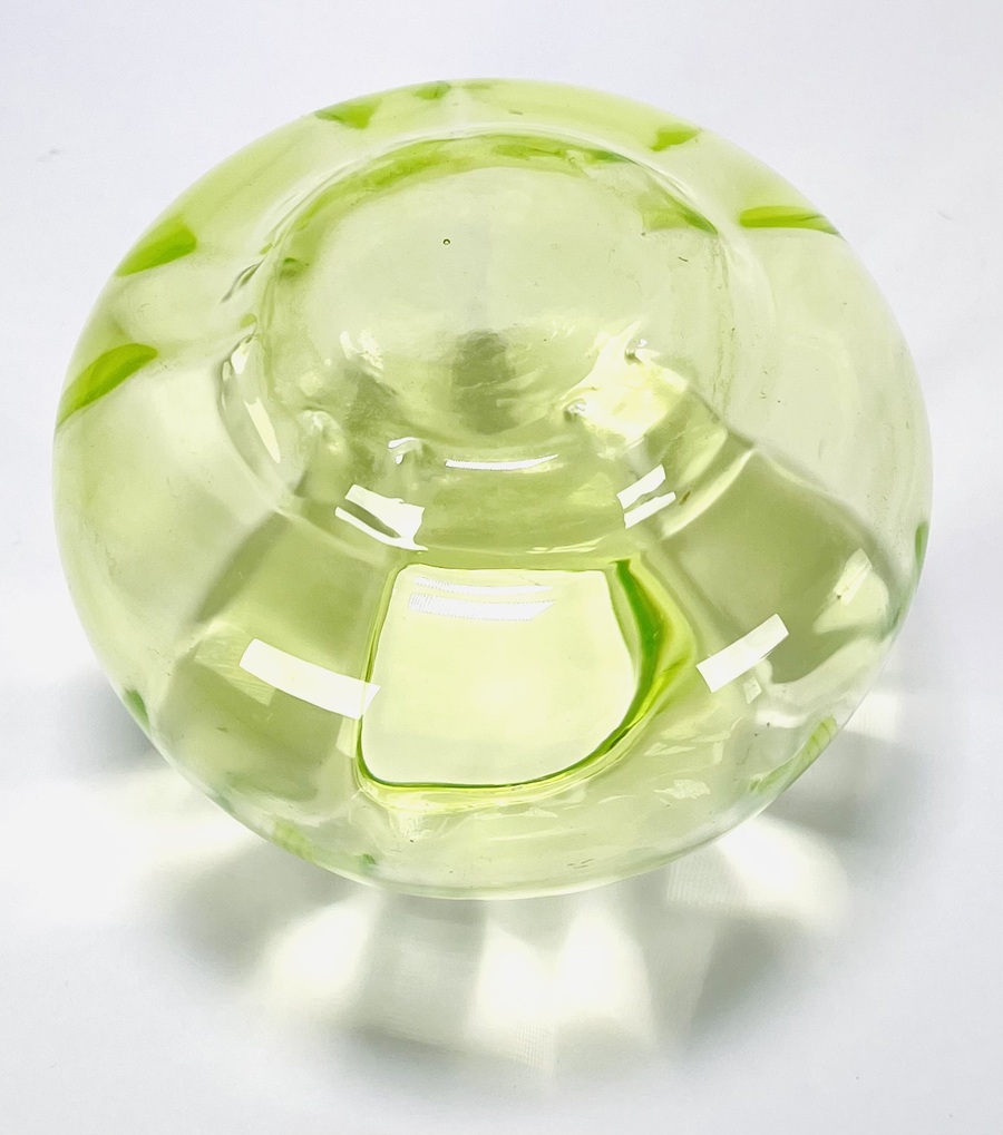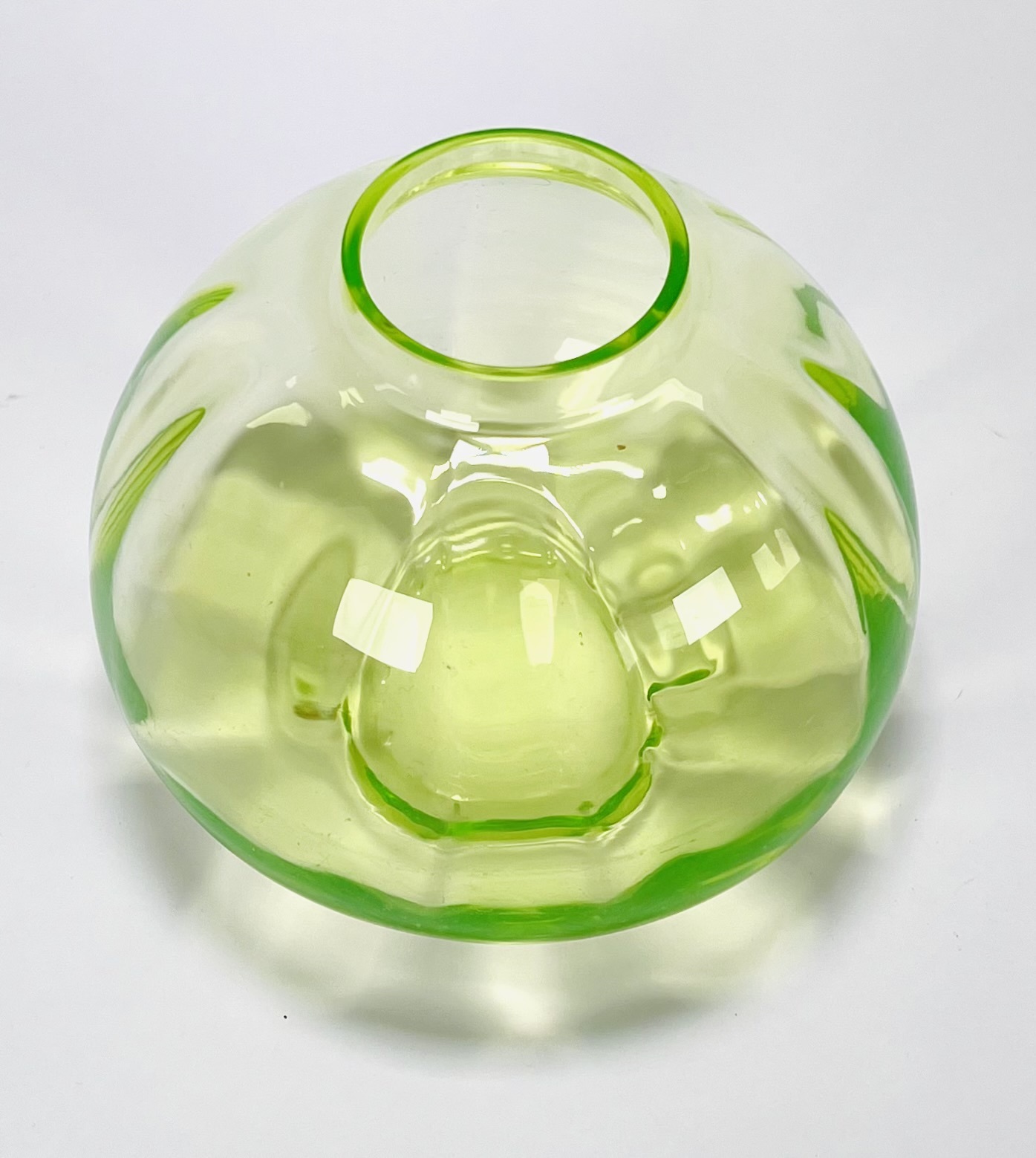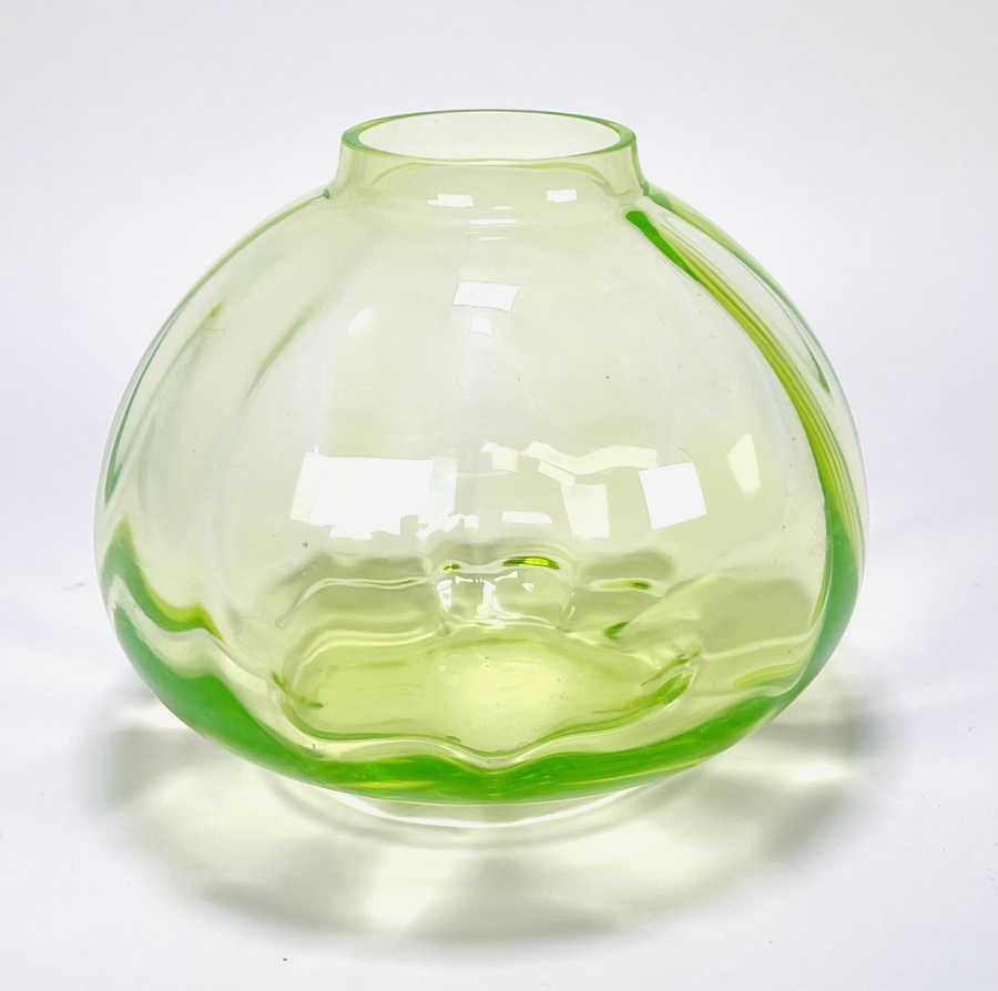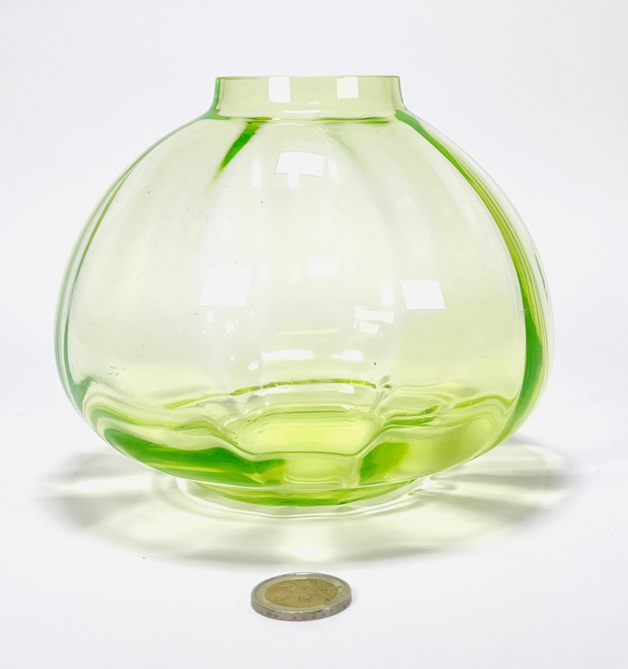 Glazen vaas, model "Mira", ontwerp W.J. Rozendaal (1899–1981) voor Kristalunie Maastricht, ontworpen in 1931. De vaas is uitgevoerd in mondgeblazen uraniumglas met verticale optiek ribben. De bolle vormgeving en de strakke hals zijn kenmerkend voor de stijl van de Nieuwe Zakelijkheid in Nederland. Geïnteresseerd? Bezoek onze kijkdagen op 28, 29 of 30 november van 11:00 tot 17:00 uur! |