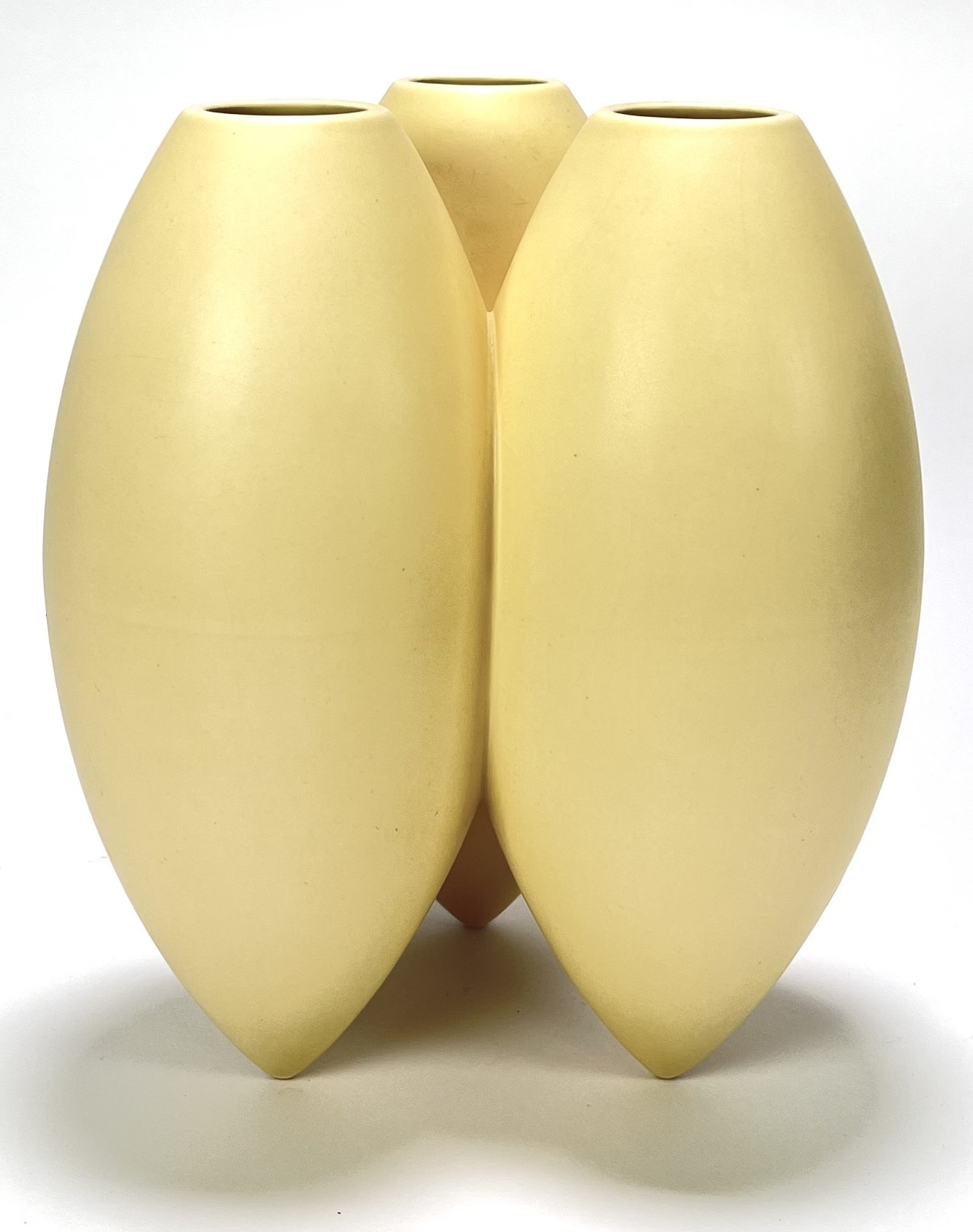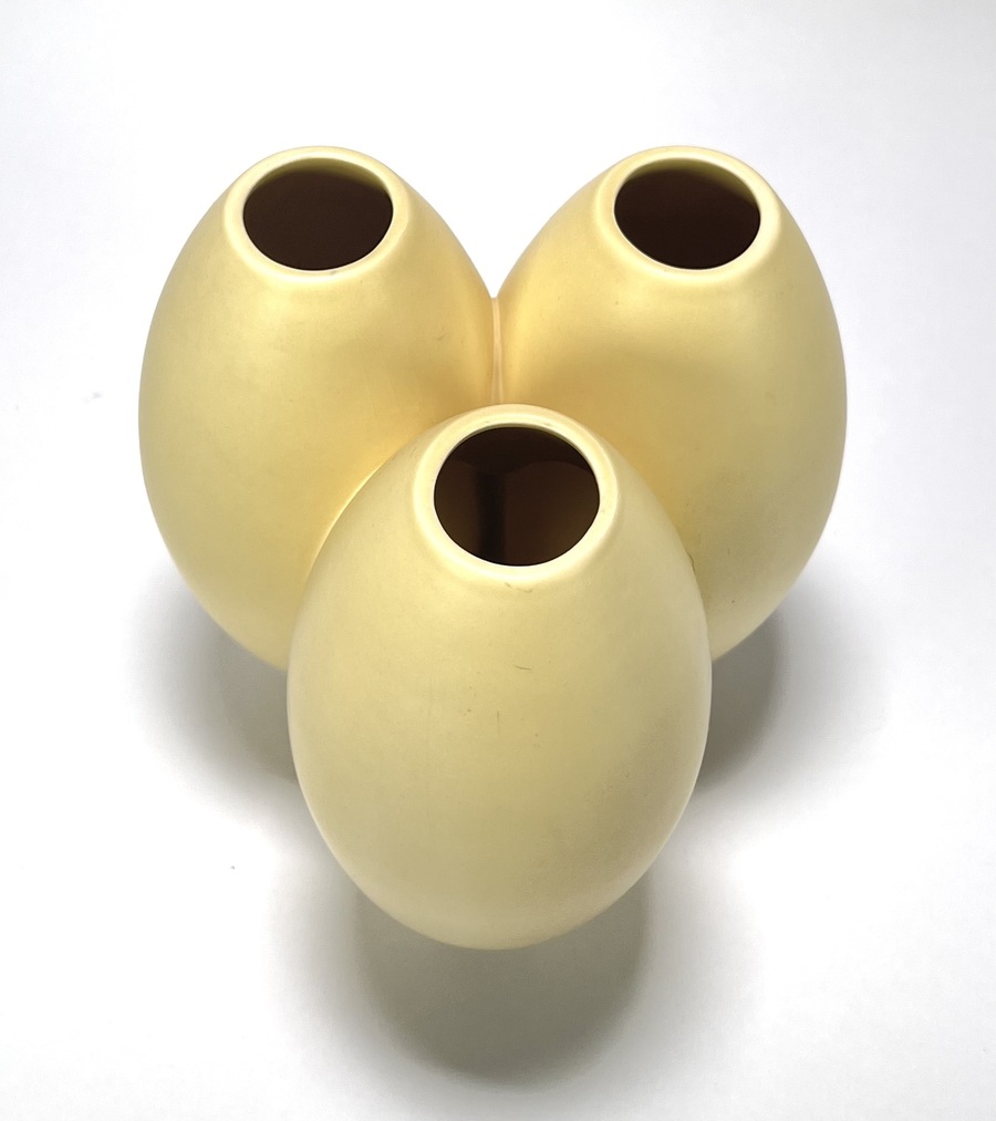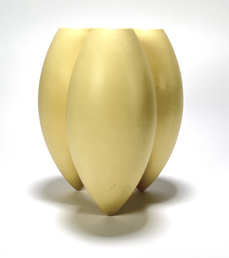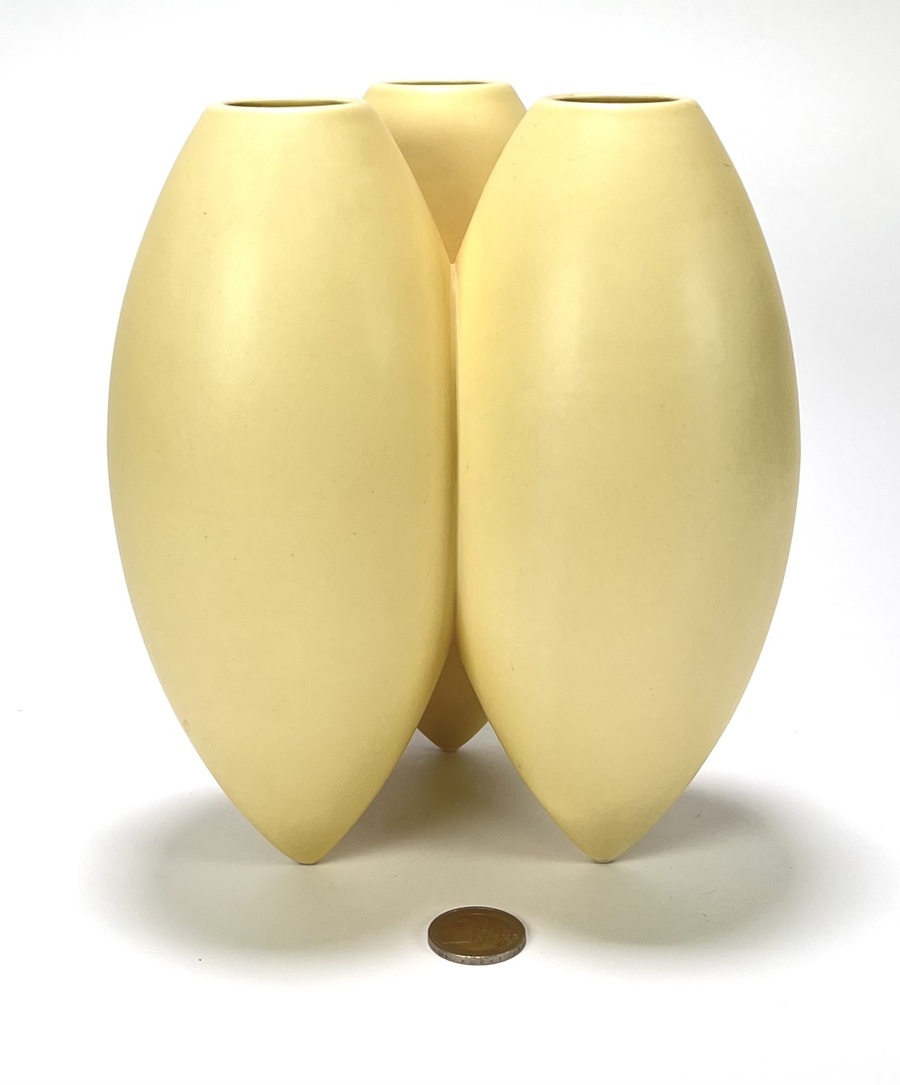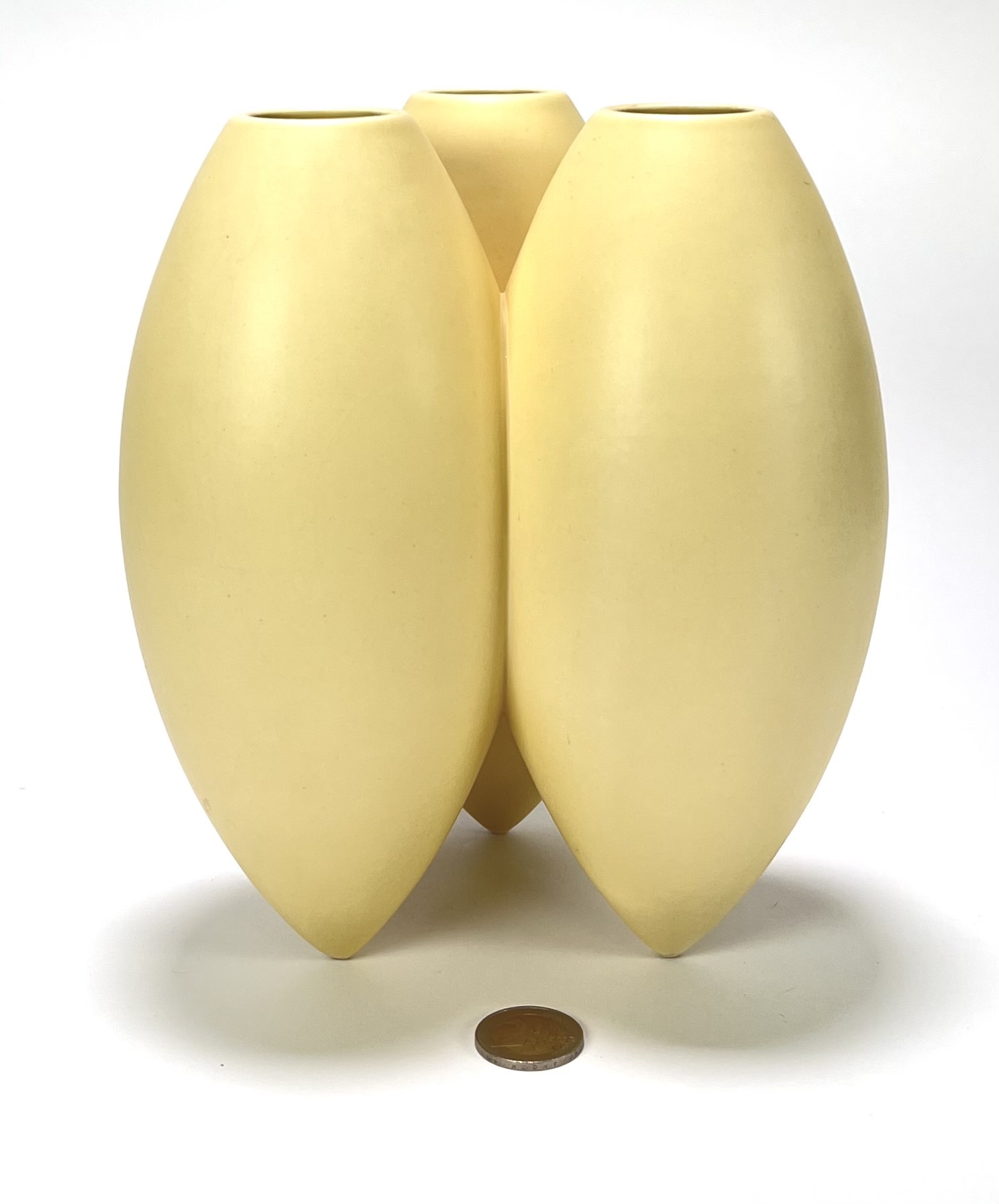 Moderne vaas van keramiek met een strakke, matte gele glazuur, bestaande uit drie samengevoegde eivormige modules met een minimalistische en organische vorm. De vaas is een modulair design en dateert eind 20e eeuw, geproduceerd door de Nederlandse werkplaats Cor Unum 's-Hertogenbosch. Wil je direct deelnemen? Plaats vanaf 21 november alvast een schriftelijk bod via onze website! |