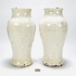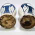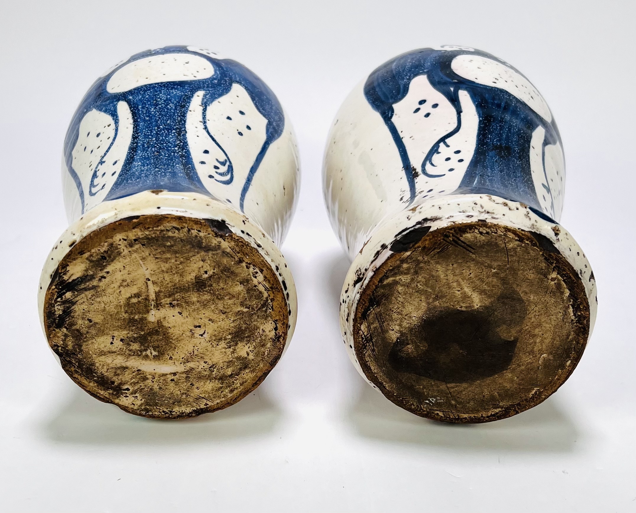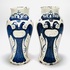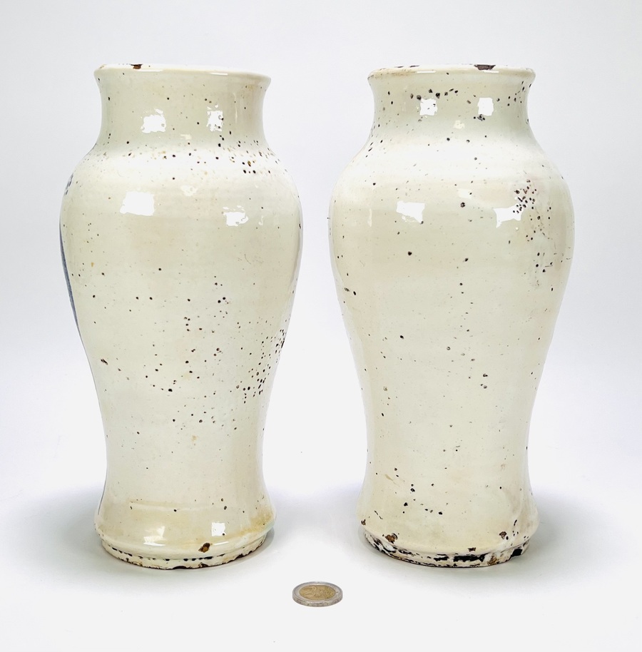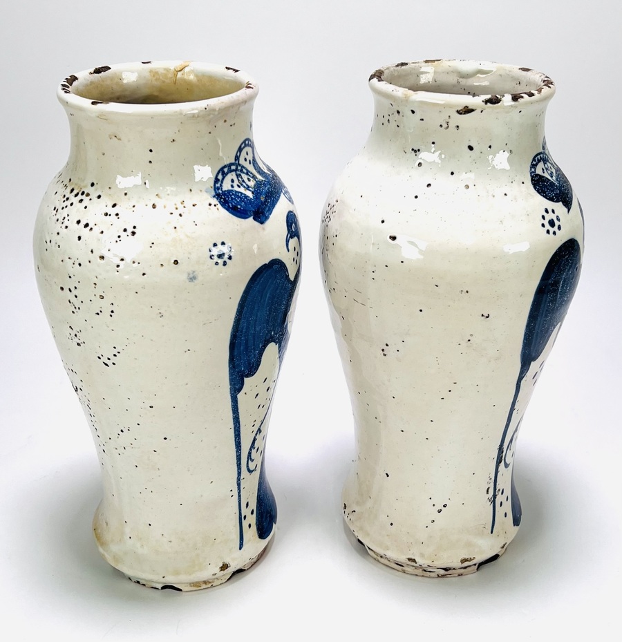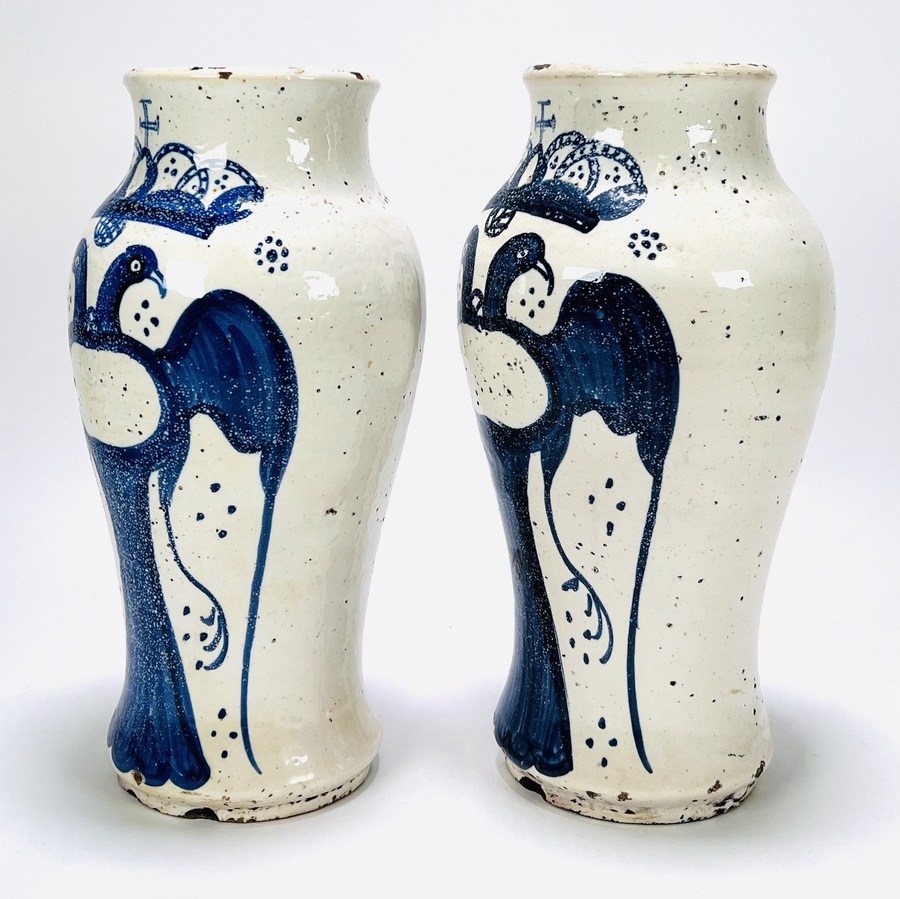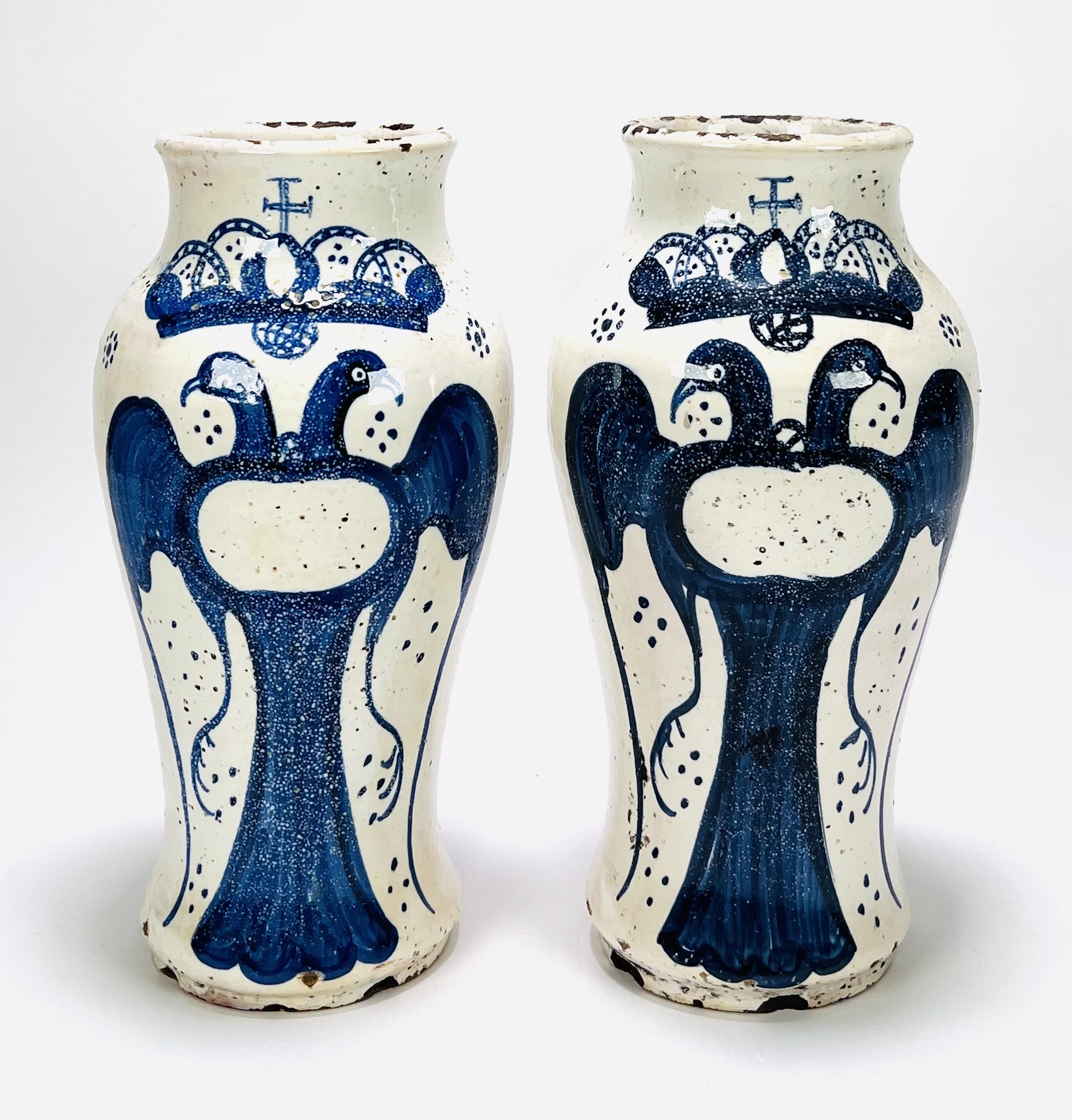 Paar keramische vazen, faïence/majolica, vervaardigd middels handbeschildering op een tingeglazuurde aardewerk corpus in de Spaanse traditie. De vazen dateren uit de periode circa 1880–1910 en zijn gedecoreerd met de dubbelkoppige adelaar en een kruismotief in kobaltblauw. De ongeglazuurde voet en de stijl zijn kenmerkend voor Europees ambachtelijk werk en zijn replica's van historische potten uit de 17e eeuw. Je bent welkom op onze kijkdagen op 28, 29 en 30 november! |