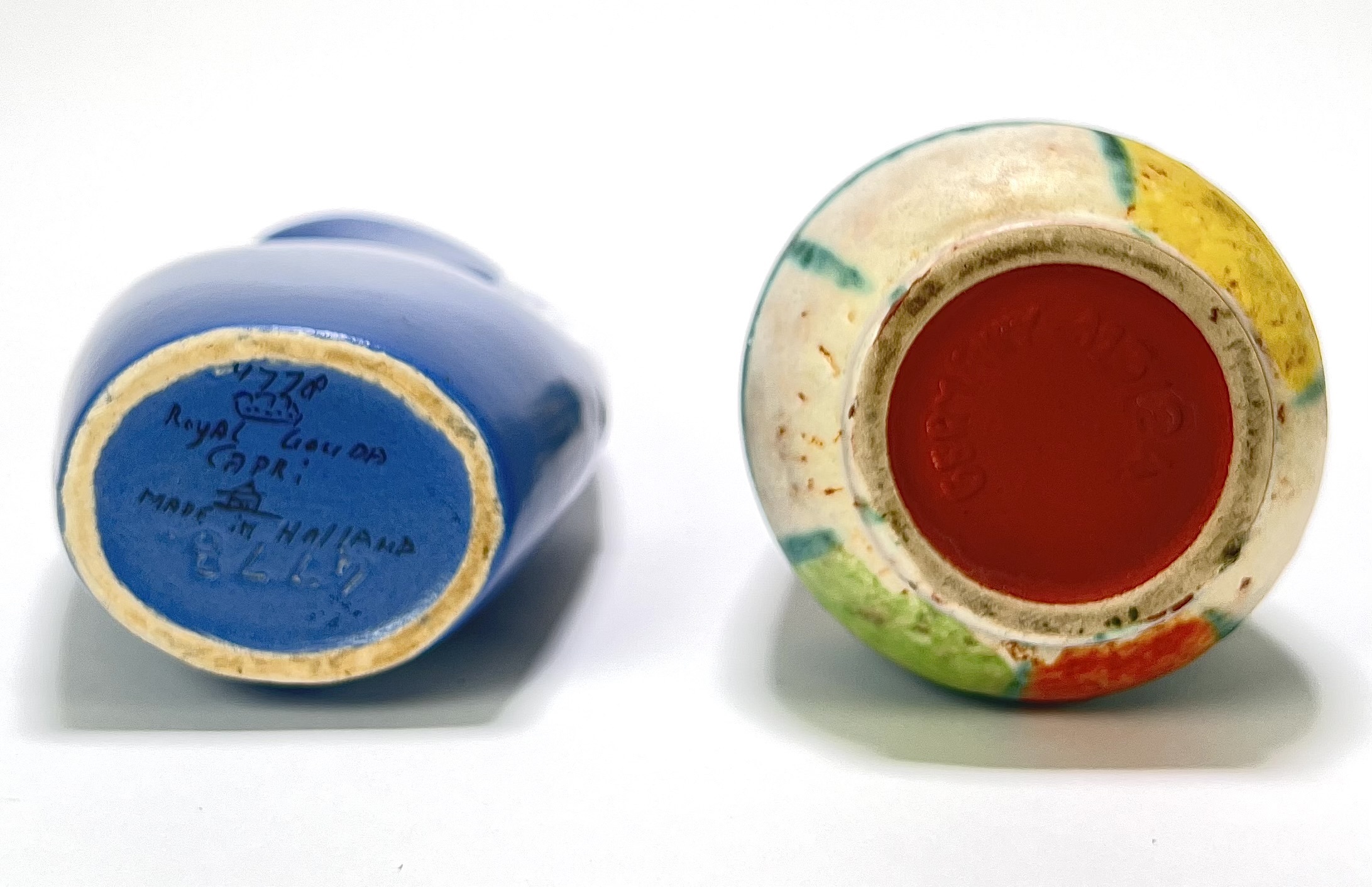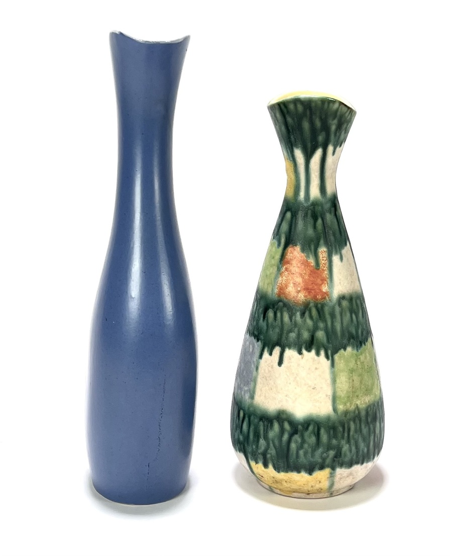 Keramische vaas en schenkkan in de Mid-century modern stijl, daterend midden 20e eeuw, Blauwe kan gemarkeerd met Royal Goedewaagen en made in Holland maar onbekend als productie, later toegevoegd, niet authentiek. Vaas West-Duits keramiek met een geruit patroon en abstract druipglazuur. Zeker zijn van deelname? Plaats vanaf 21 november een schriftelijk bod online! |
