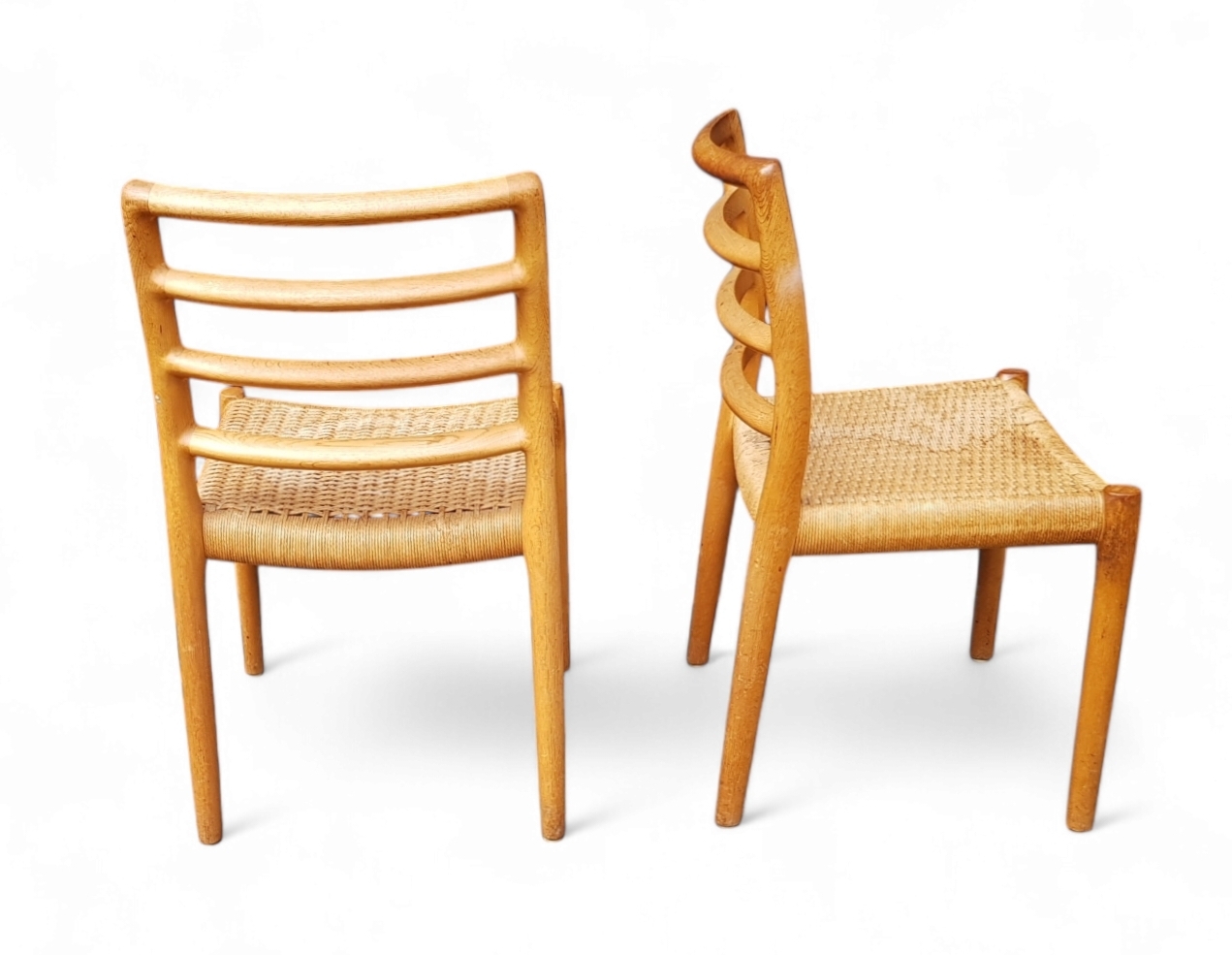 Vier eetkamerstoelen model 85, ontworpen door Niels Otto Møller (1920–1982) in 1964, geproduceerd door J.L. Møllers Møbelfabrik in Denemarken. Deze Scandinavische Mid-century modern stoelen zijn uitgevoerd in massief hout, de rugleuning bevat gebogen rugstijlen, met vier horizontale dwarsbalken en heeft een handgeweven zitting van koord. Je bent welkom op onze kijkdagen op 28, 29 en 30 november! |