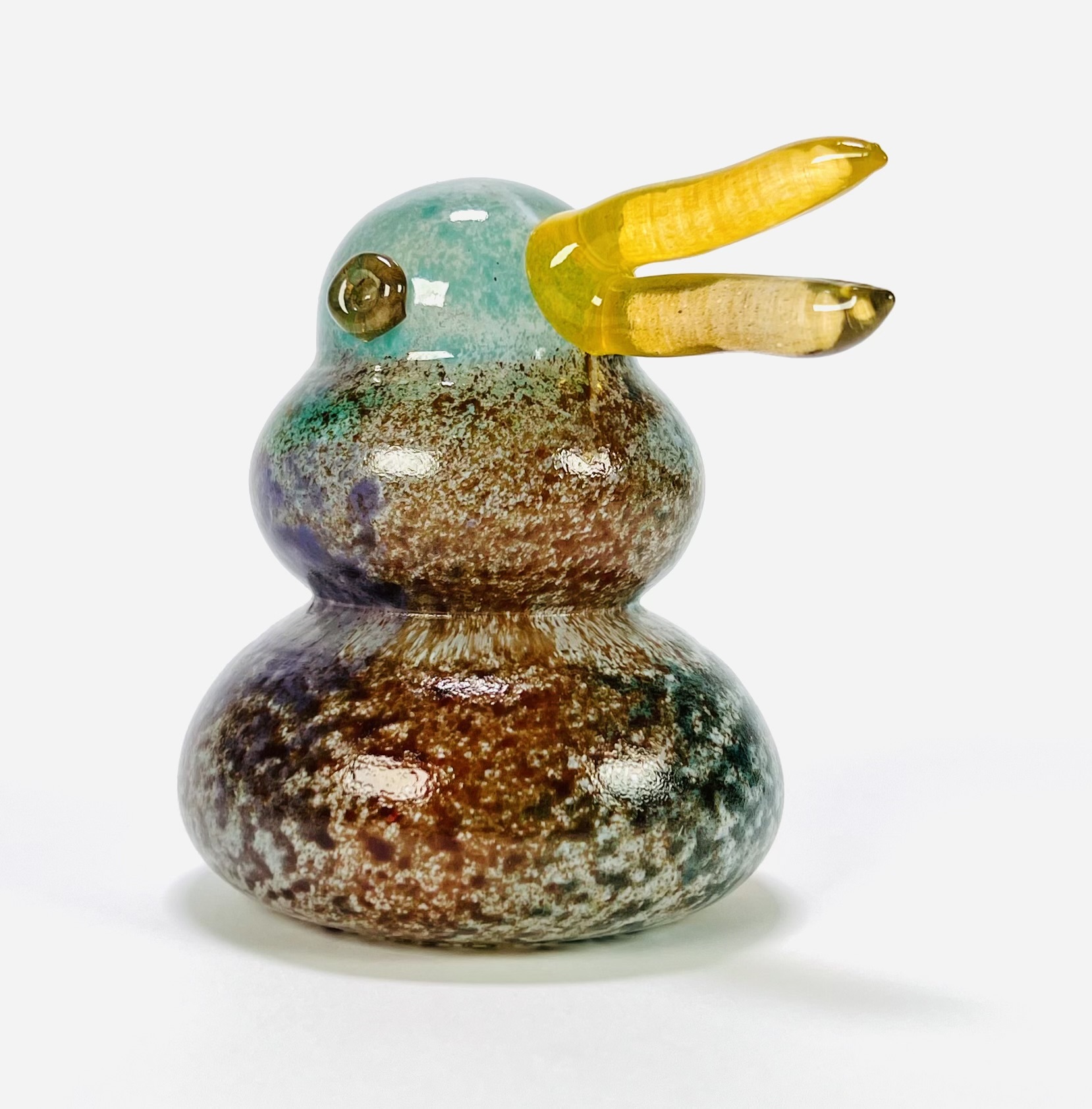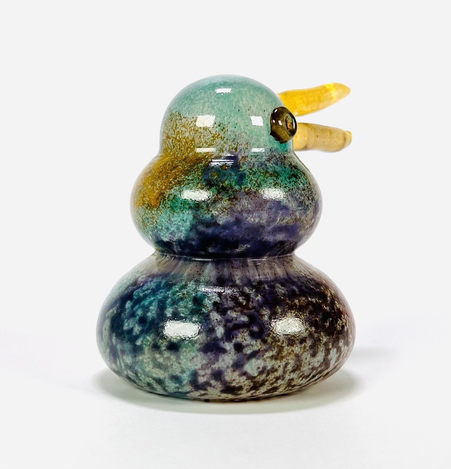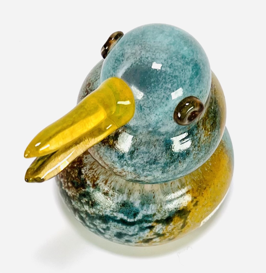 Glazen vogel, ontwerp Kjell Engman (1946) voor Kosta Boda, Zweden, eind 20e eeuw. Handgeblazen glas in blauwgroen en okergeel met optische luchtbel. Vrij geblazen vorm met aangezette snavel en ogen, voorzien van origineel Kosta Boda sticker. Uitgevoerd in de expressieve Scandinavische postmoderne glaskunsttraditie. Registreer nu en bied eenvoudig online mee op dit glasobject! |