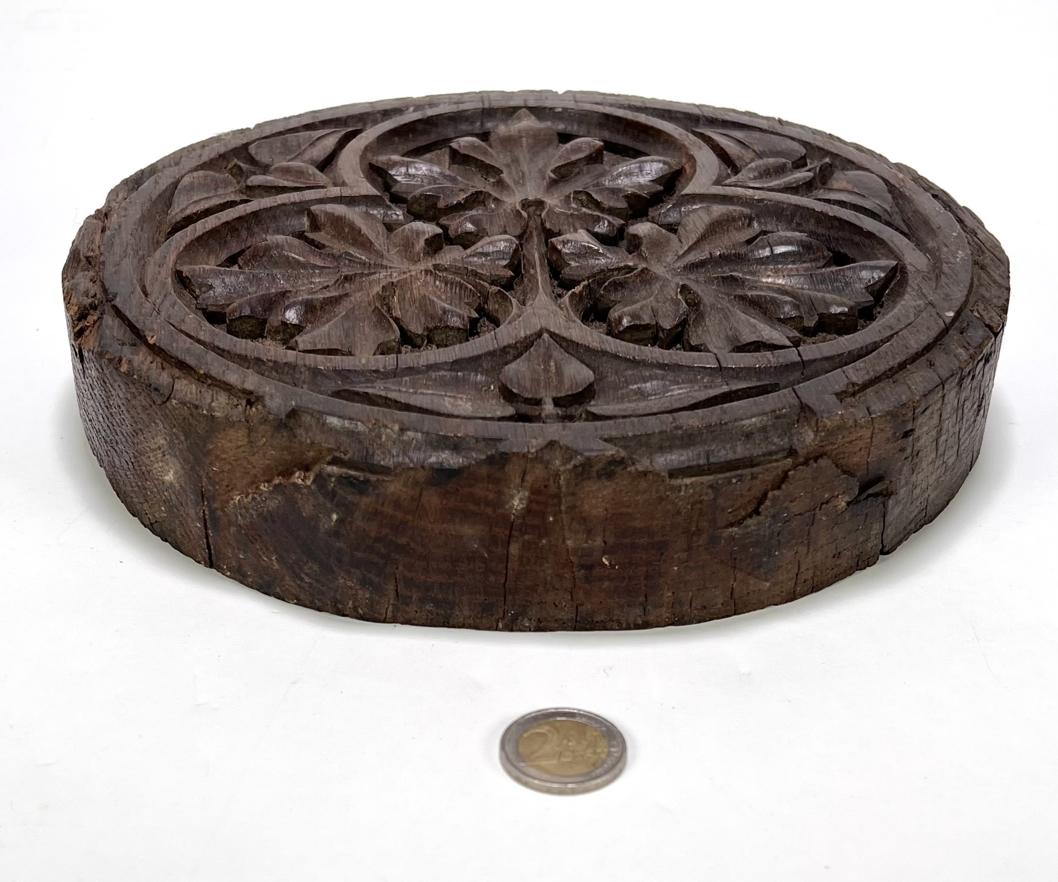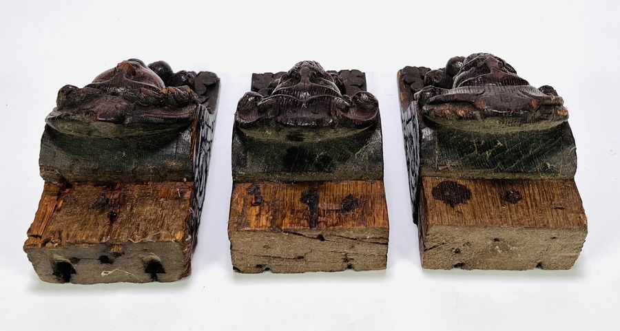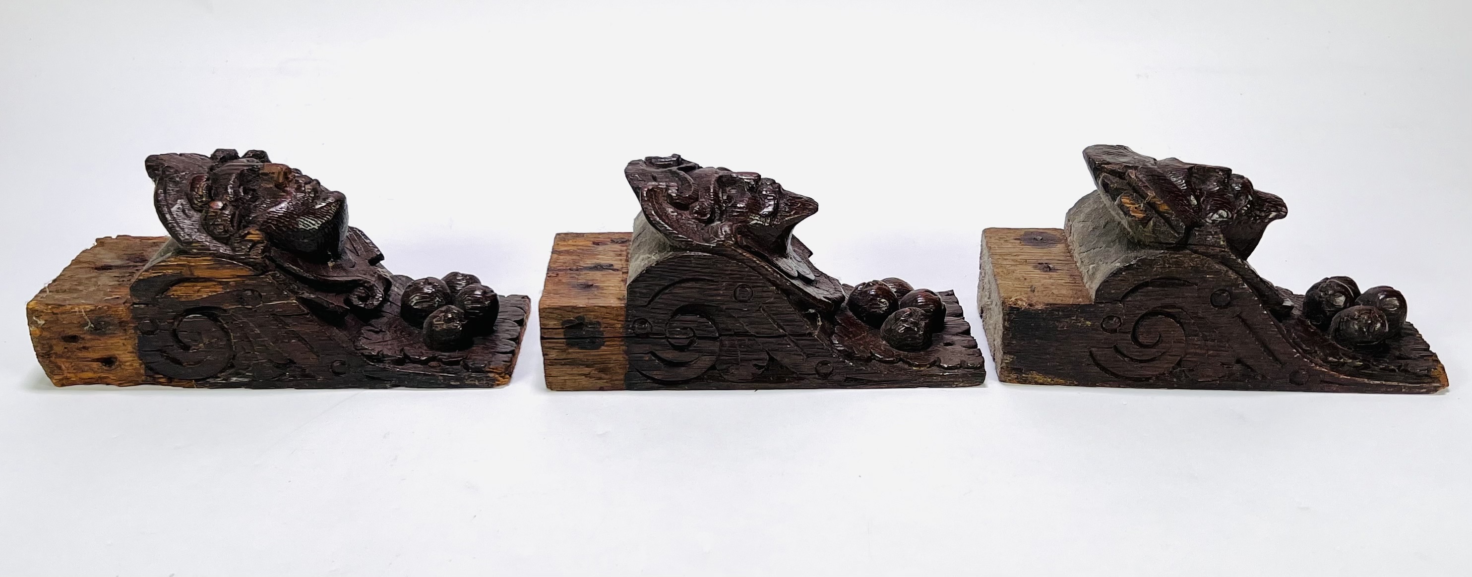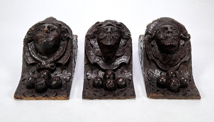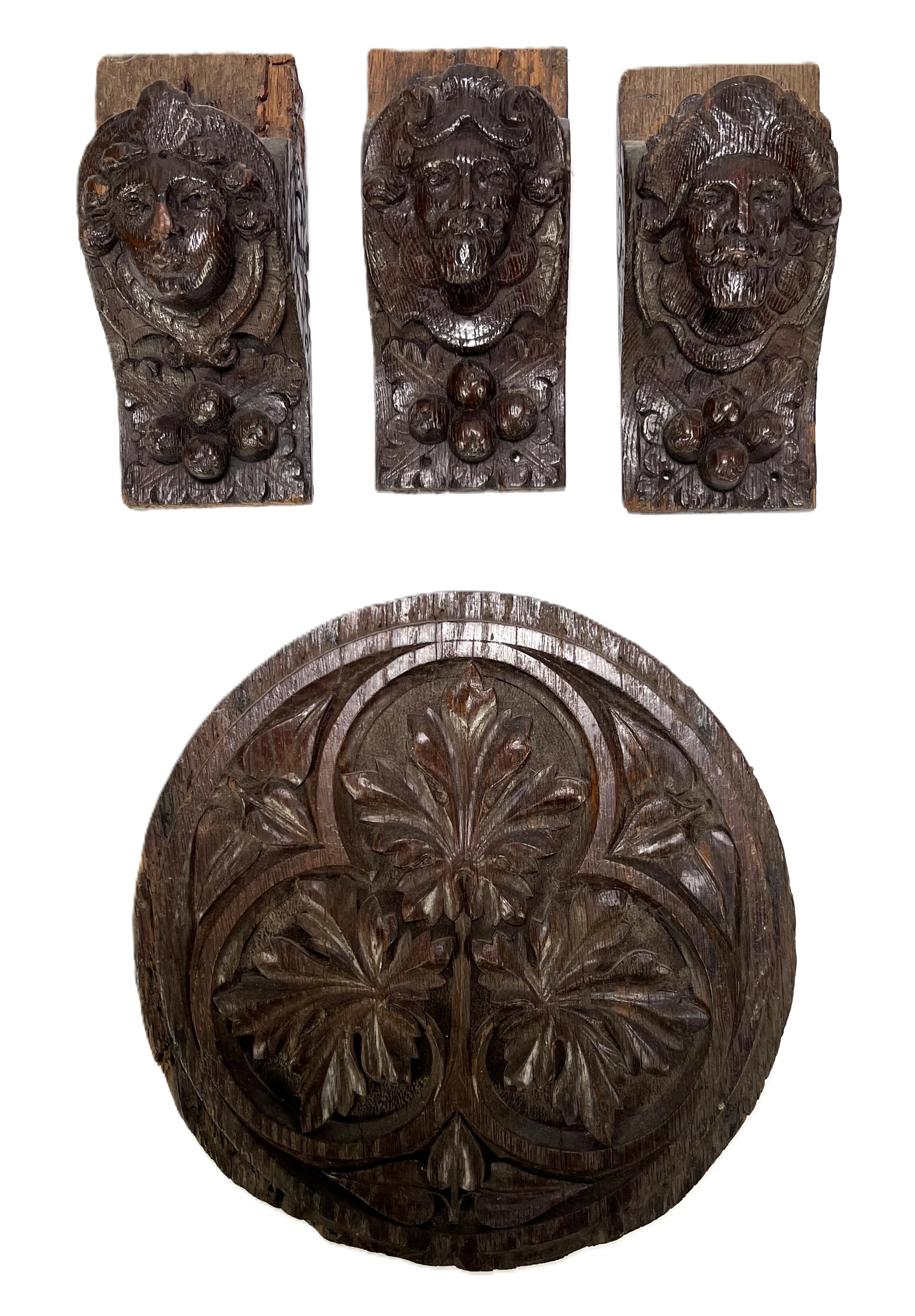 Vier antieke houtsnijwerken, circa 1850–1900, uitgevoerd in hardhout met een donker gebeitste afwerking. Het lot omvat drie neorenaissance consoles met figurale hoofden en botanisch reliëf en één rond neogotisch medaillon met driebladig (trefoil) motief. De stukken zijn Europees van herkomst en werden gebruikt als architecturale of meubeldecoratie. Jouw kans op deze houtsnijwerken begint met registreren – bied live of online mee! |