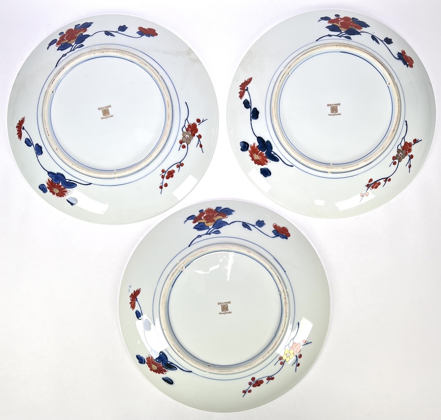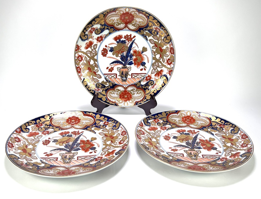 Drie ronde porseleinen Imari borden uit Japan, vervaardigd in de Arita-regio voor de exportmarkt. De borden dateren uit de midden 20e eeuw, met decoratie in onderglazuur blauw en overglazuur rood. De centrale bloemenvaas en de randen zijn traditioneel versierd. Voeg deze borden toe aan je verzameling en doe een bod! |