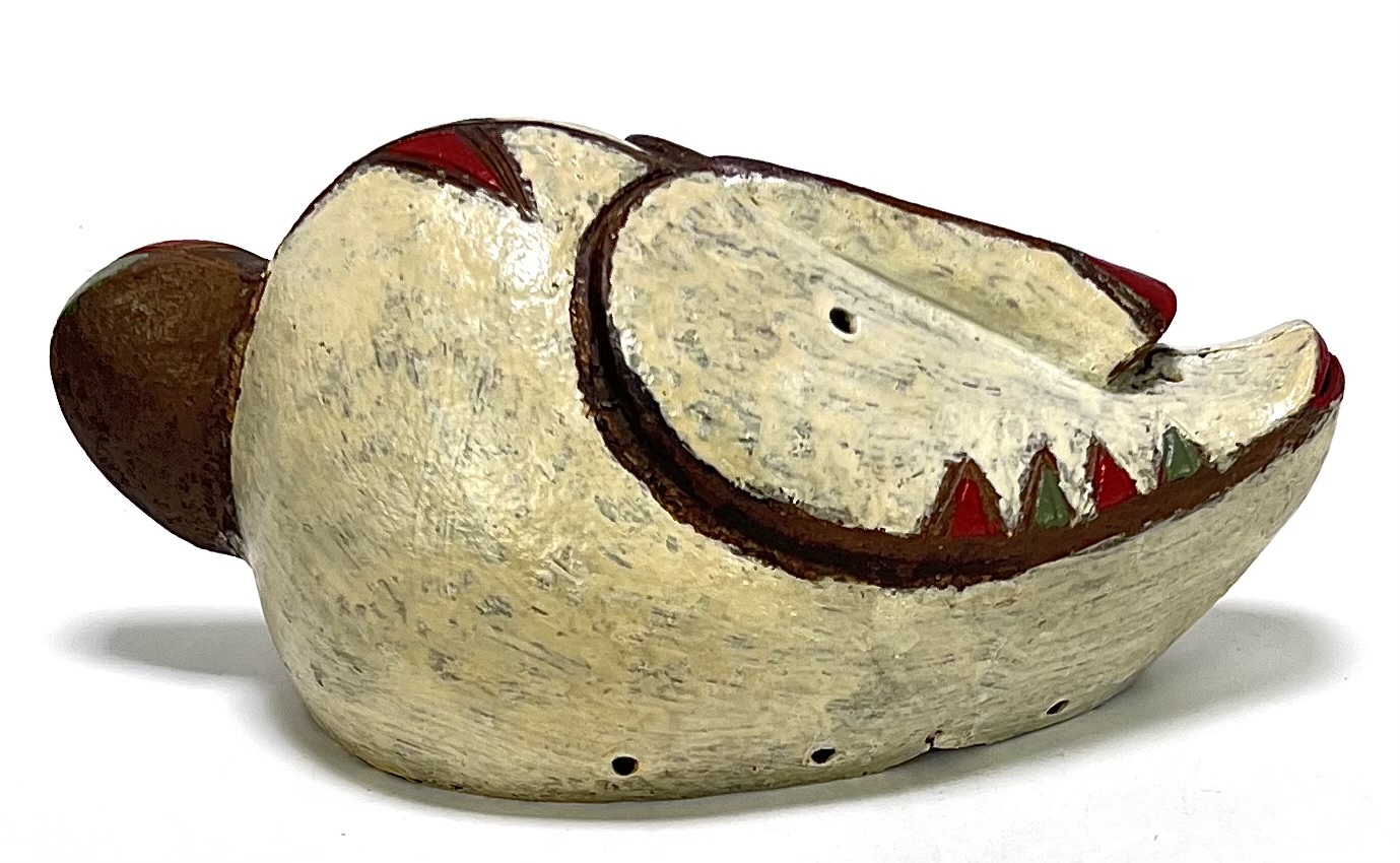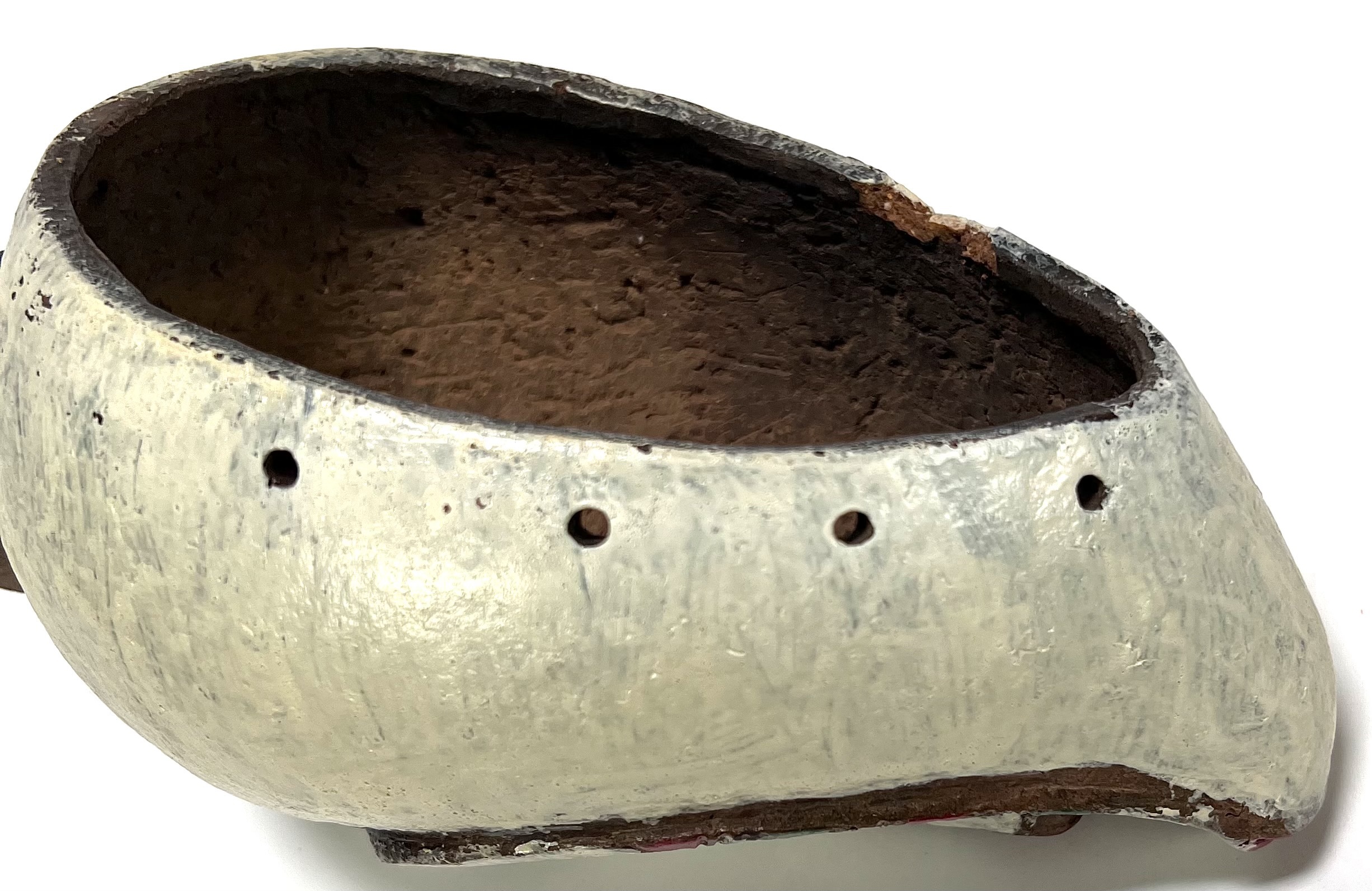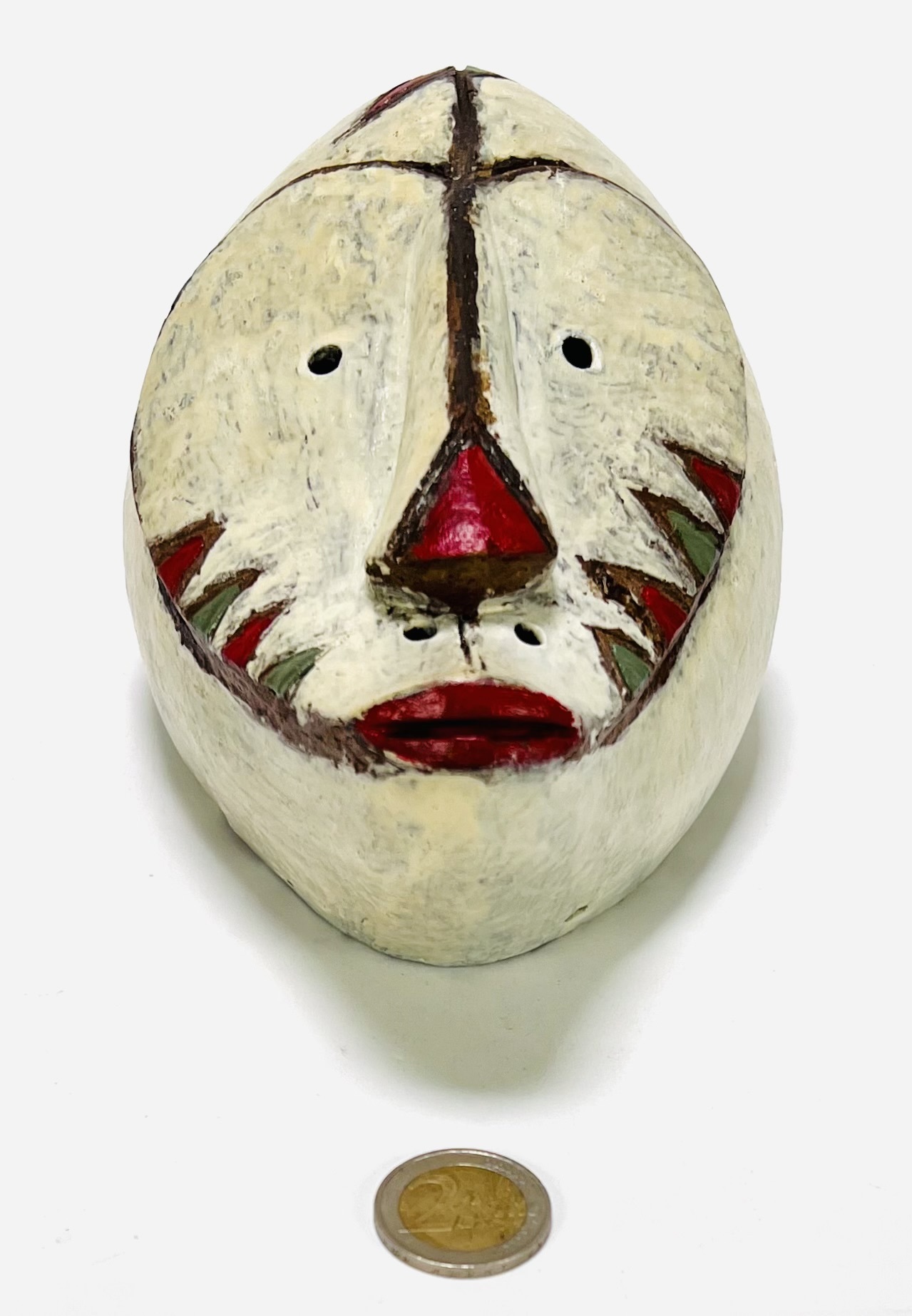 Keramisch Punu wandmasker uit Gabon, midden 20e eeuw, vervaardigd uit gebakken klei en beschilderd met polychrome pigmenten in wit, rood, groen en zwart. Het masker toont een ovaal gezicht met smalle ogen, driehoekige geometrische decoratie en doorboringen langs de rand voor bevestiging. Het diende als ritueel object binnen de context van de Punu cultuur. Kom langs tijdens de kijkdagen (28 t/m 30 november) en ontdek dit wandmasker zelf! |