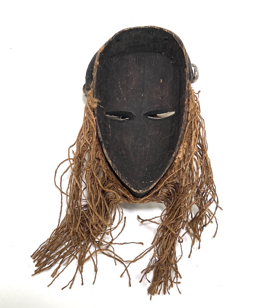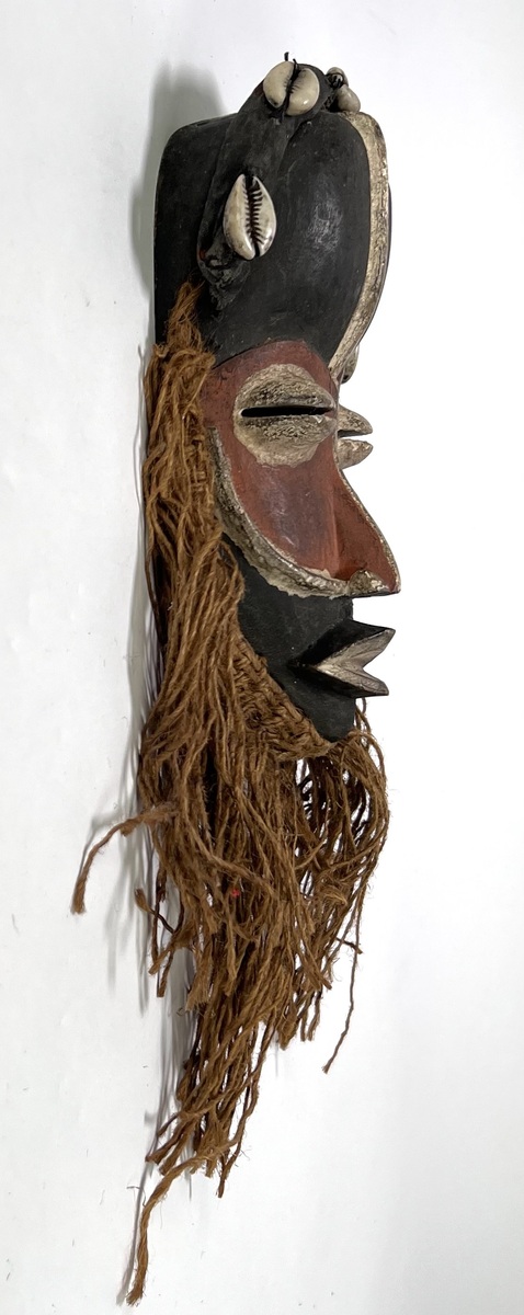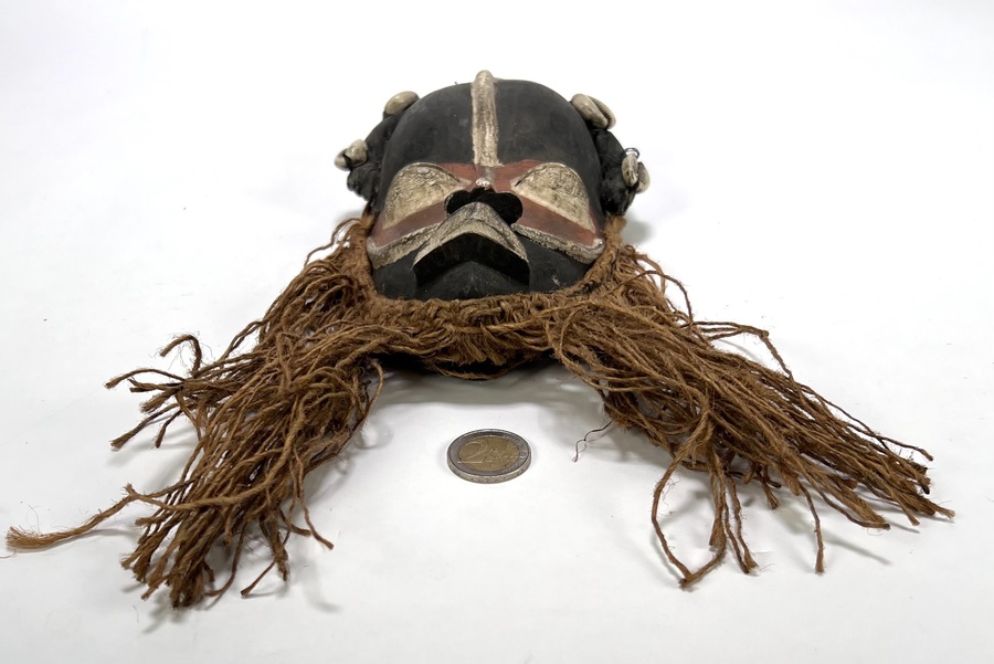 Houten masker uit West-Afrika, tweede helft 20e eeuw. Handgesneden en gepolychromeerd in rood, wit en zwart met decoratie van kaurischelpen en een baard van plantaardige bastvezels. De gestileerde gelaatstrekken verwijzen naar spirituele kracht en rituele introspectie. Masker werden gebruikt bij initiatie- en voorouderceremonies binnen Pende cultuur Kongo. Registreer je nu en bied eenvoudig online mee op dit masker! |
