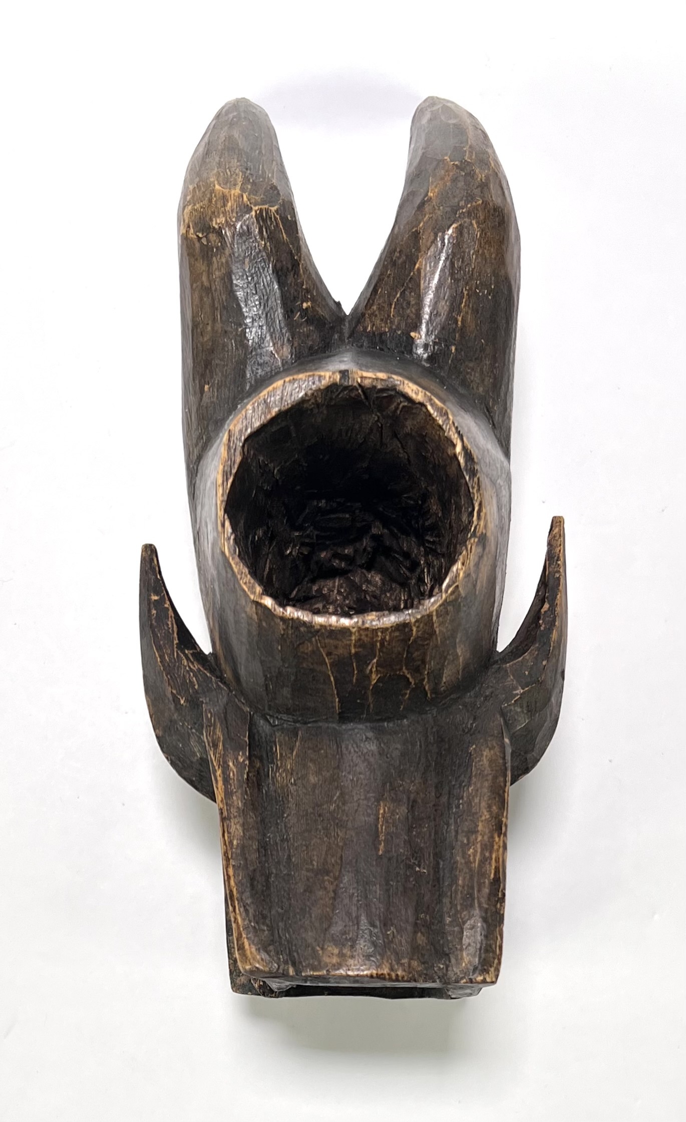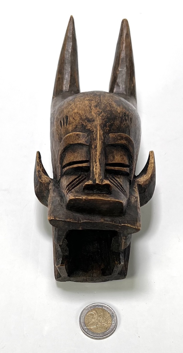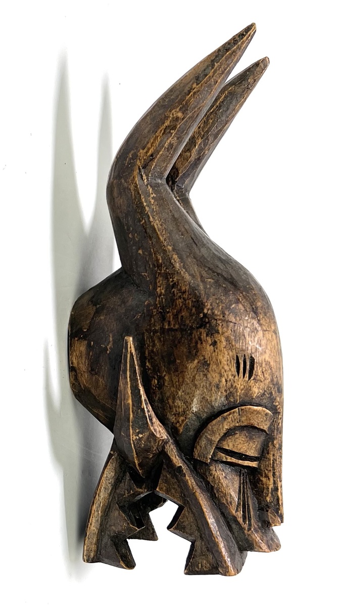 Houten wandmasker uit Mali, midden 20e eeuw, toegeschreven aan de Bambara cultuur binnen de N’tomo traditie. Gesneden uit hardhout met donkere patina en twee hoge hoornvormige uitsteeksels, symbool voor spirituele transitie. Handmatig vervaardigd in houtsnijwerk, met geometrisch gelaat en gesloten ogen, traditioneel gebruikt bij initiatie- en overgangsrituelen. Klaar om te bieden? Registreer je nu en doe mee aan de veiling! |