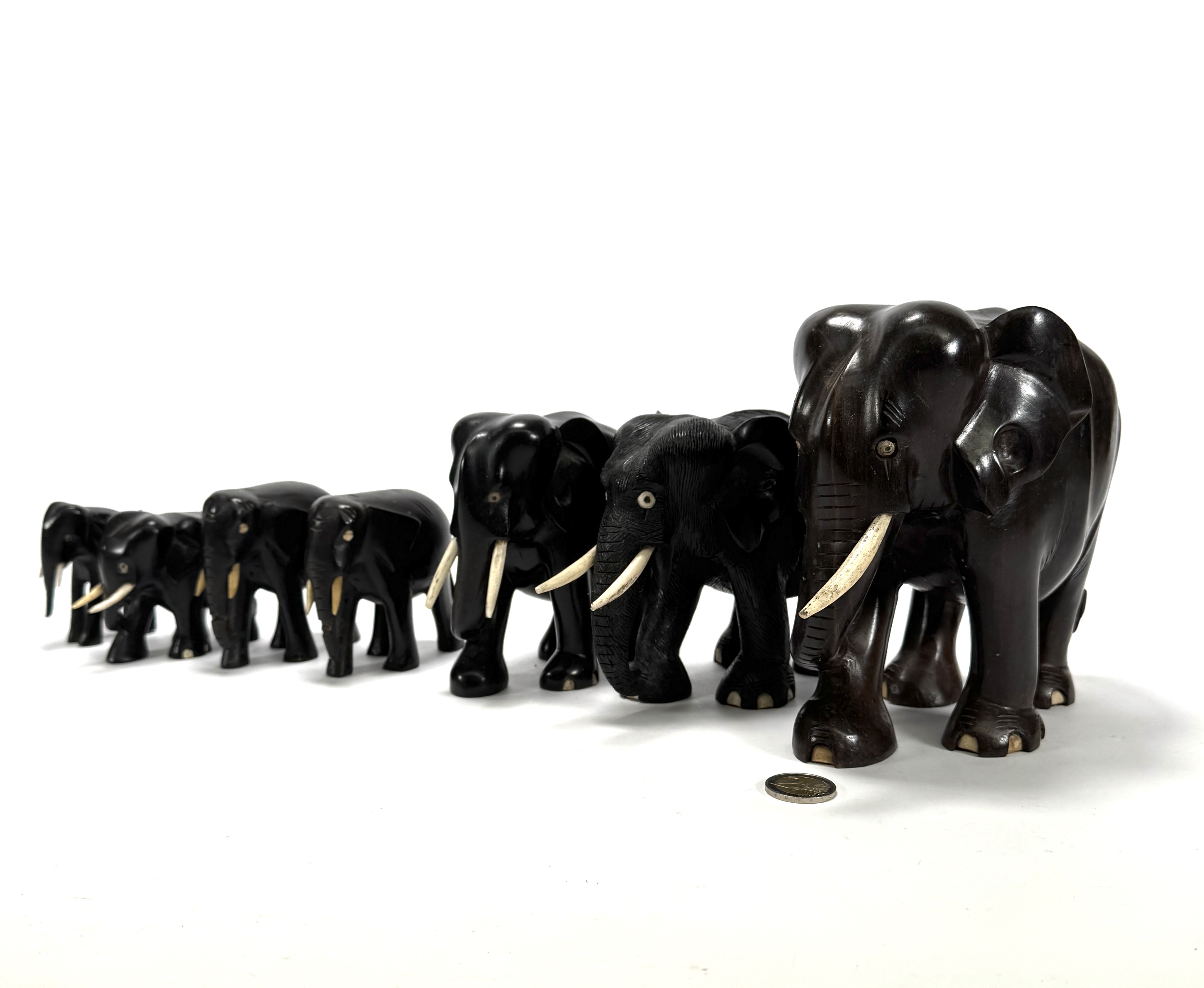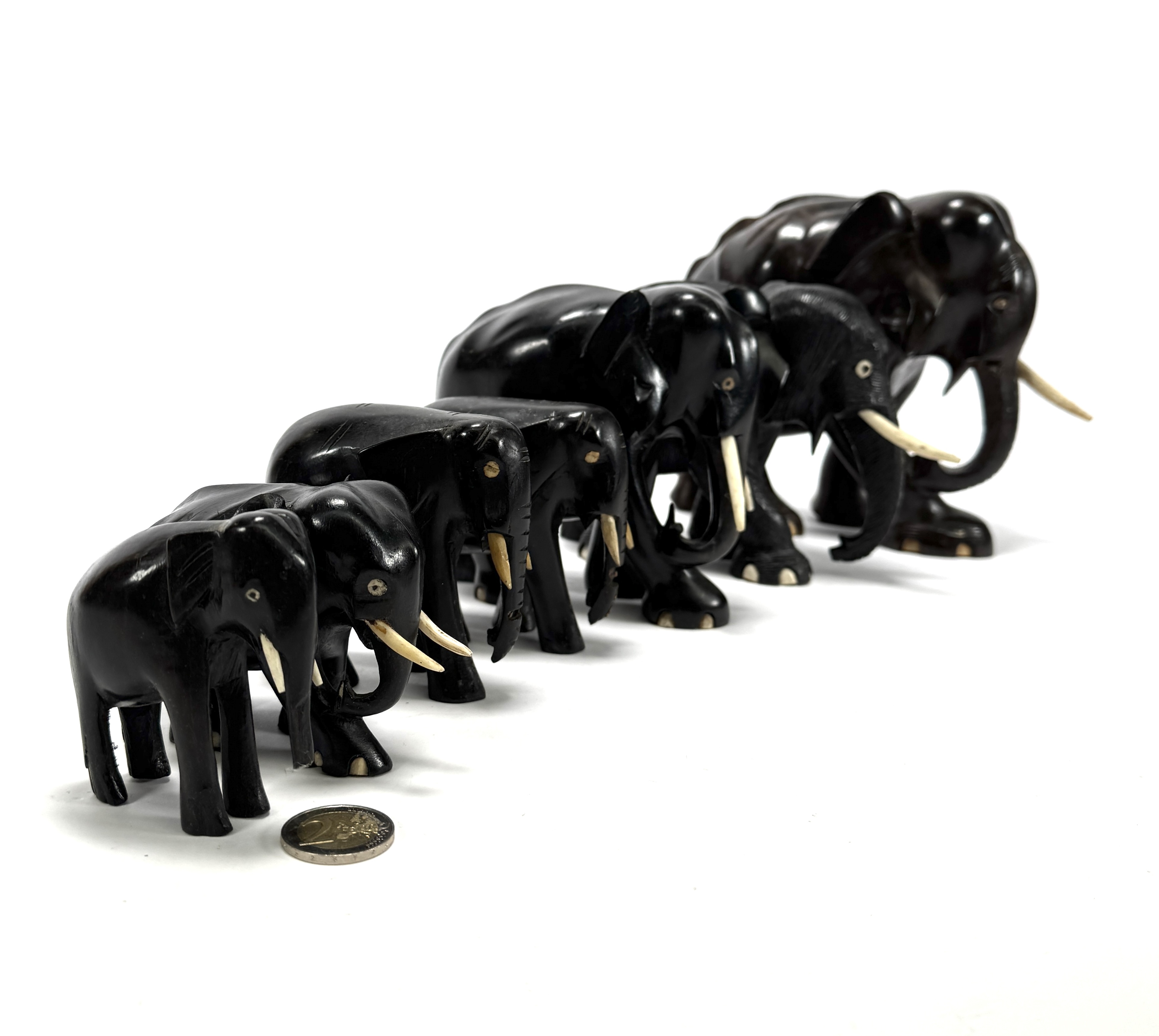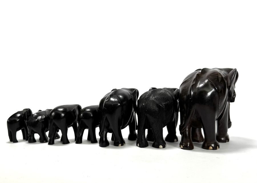 Zeven Afrikaanse olifanten, uitgevoerd in hout met houtsnijwerk, tweede helft 20e eeuw. De beeldjes variëren in formaat en tonen naturalistisch uitgewerkte details zoals oren, poten en slagtanden uitgevoerd in been. De groep is gestileerd als een olifantenfamilie, met wisselende houtsoorten in donker- en lichtbruine tinten. Geïnteresseerd? Bezoek onze kijkdagen op 28, 29 of 30 november van 11:00 tot 17:00 uur! |