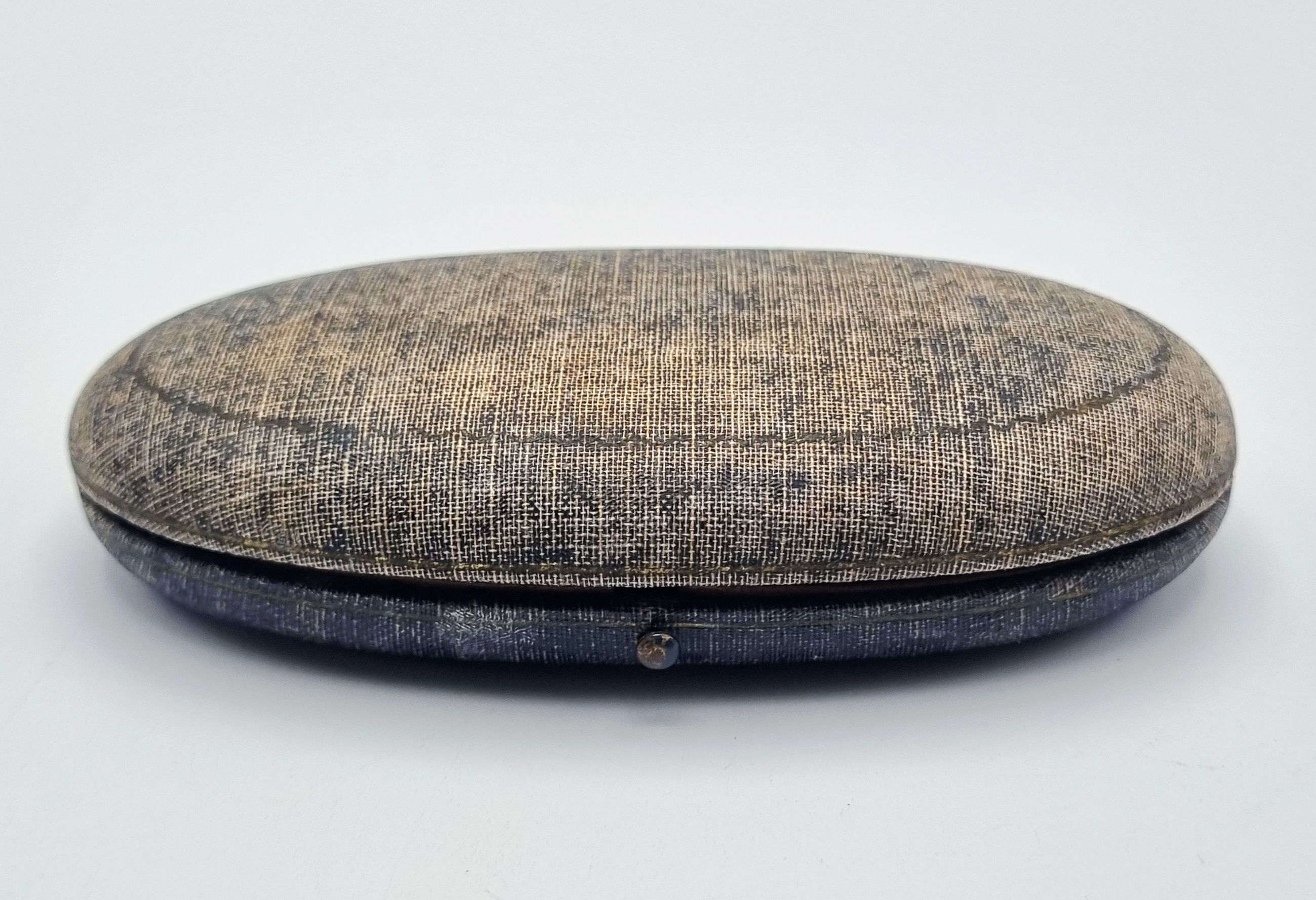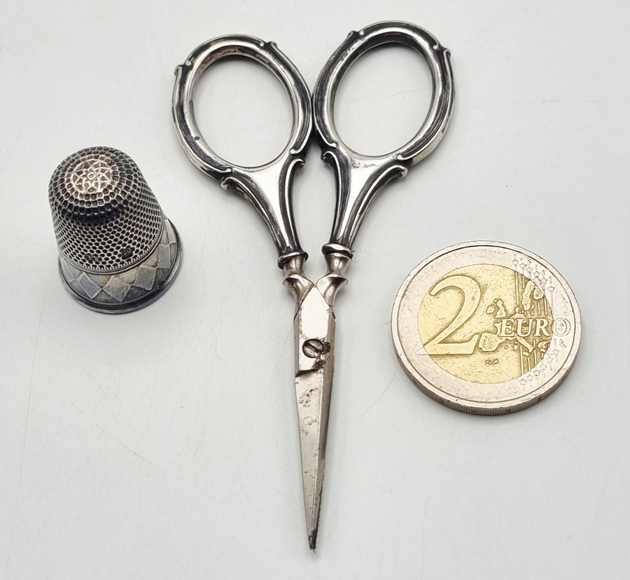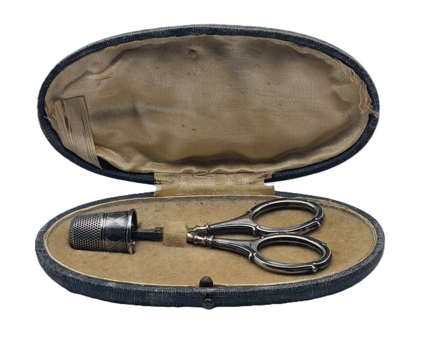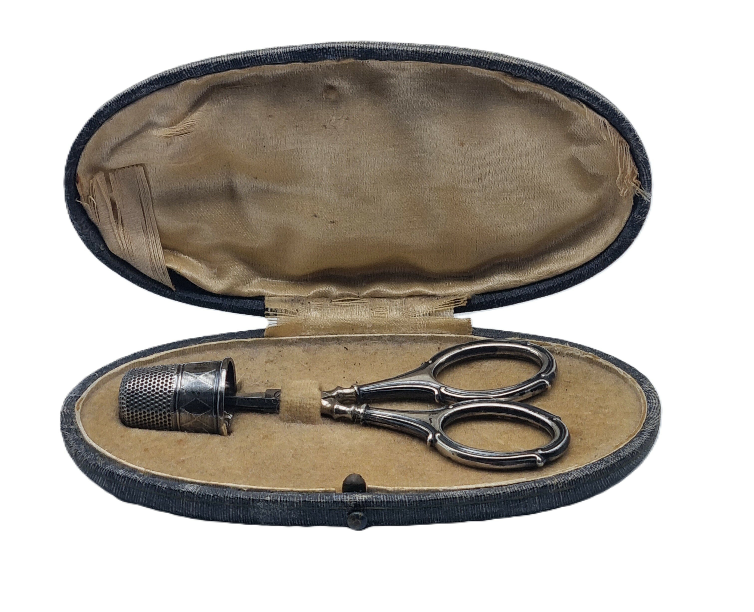 Ovale foedraal met naaigerei uit de eerste kwart 20e eeuw, Europa, bekleed met gespikkeld textiel en gevoerd met satijn. De set is een mariage en bevat een sierlijke zilveren schaarheft gemerkt 835/1000, met stalen snijbladen, en een zilveren vingerhoed gemerkt 925/1000. Registreren nu en bied eenvoudig online mee op dit naaigerei! |