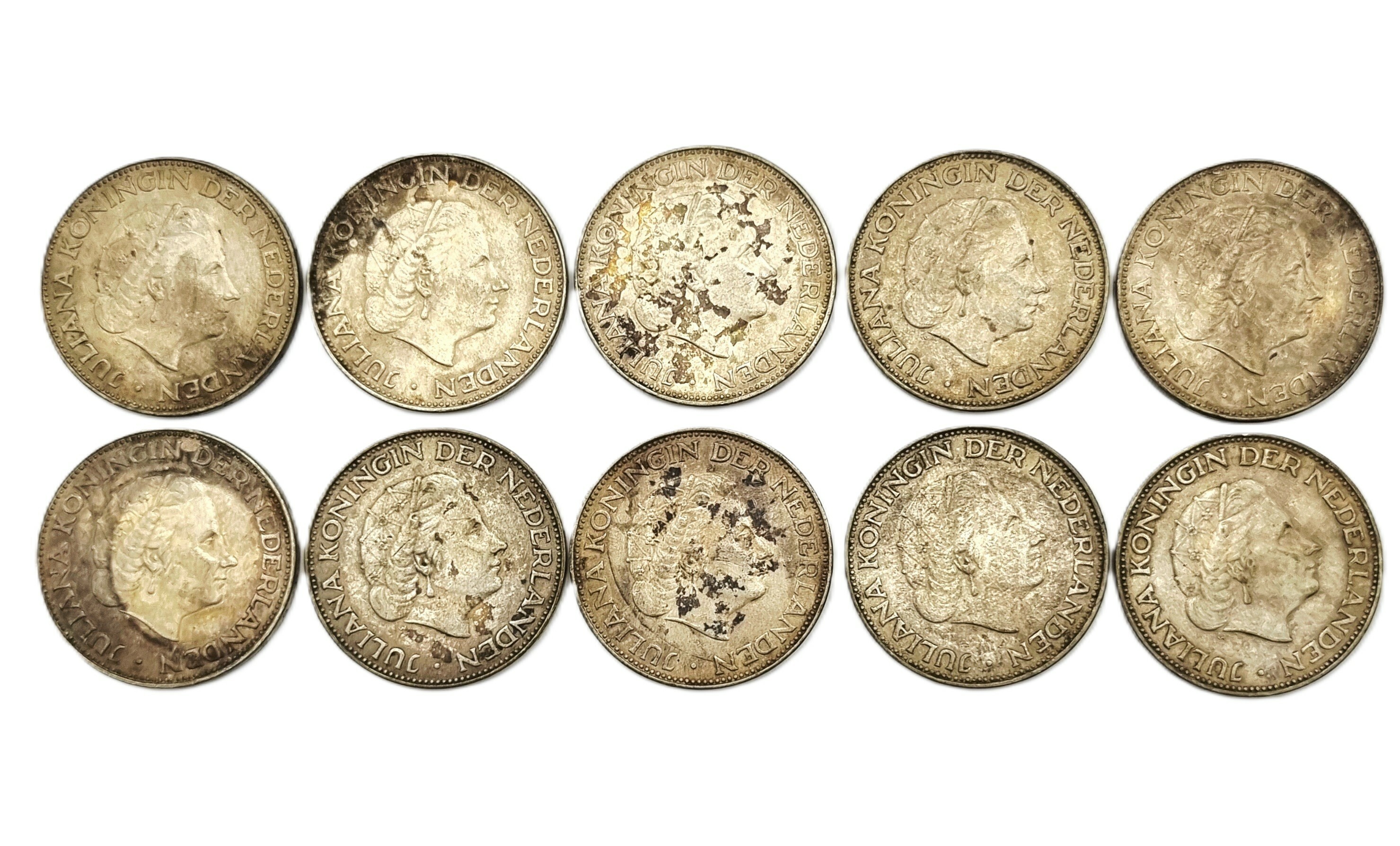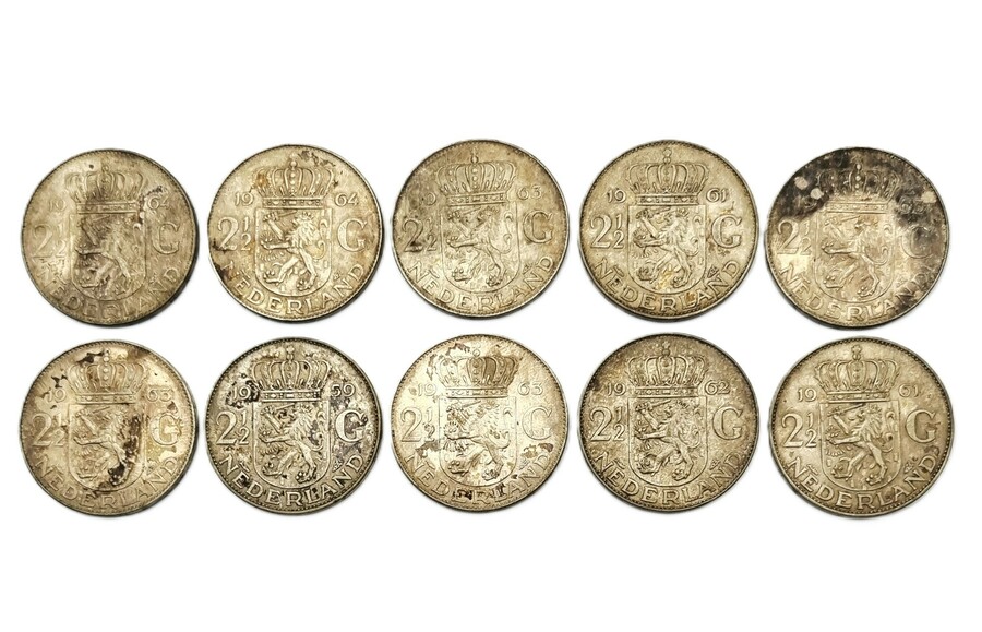 Lot van tien zilveren rijksdaalders, 2½ gulden, van Koningin Juliana, geslagen in Nederland tussen 1959 en 1964. De munten zijn geslagen in 720/1000 zilver en tonen het portret van Juliana en het gekroonde Rijkswapen op de keerzijde. Registreren nu en bied eenvoudig online mee op dit object! |