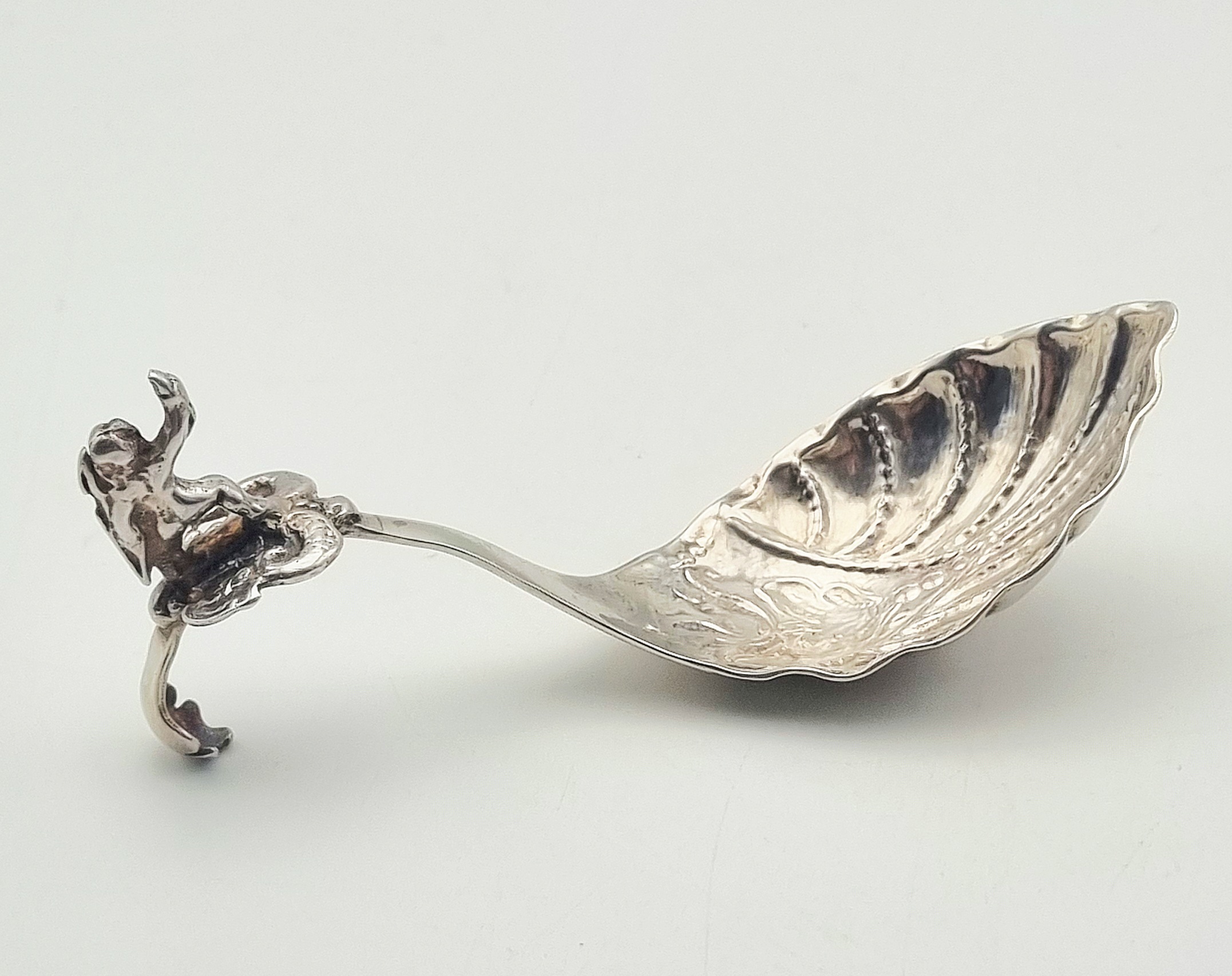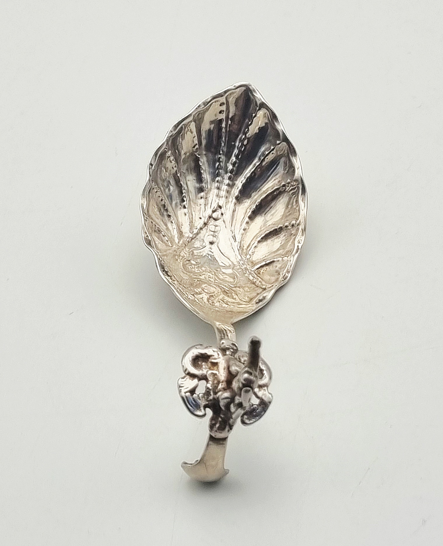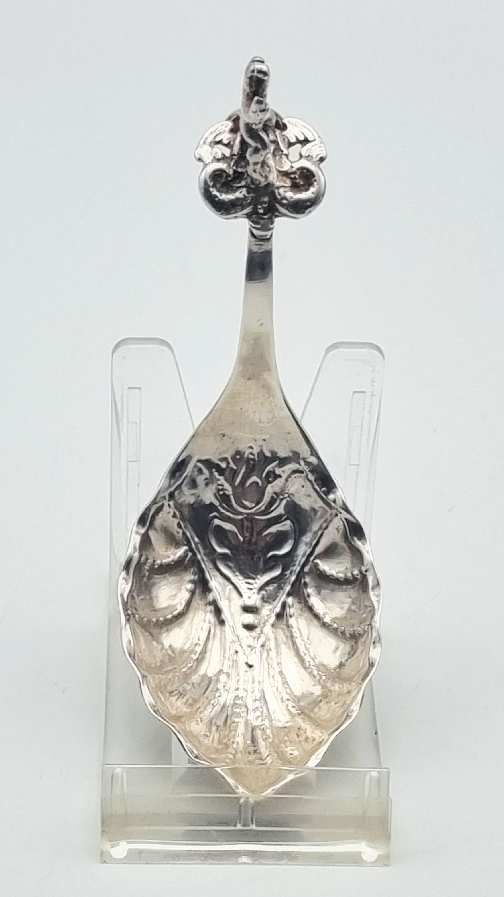 Een zilveren roomlepel in de late rococo stijl, gedateerd in het midden van de 18e eeuw, Nederland. De roomlepel is vervaardigd door gieten en ciseleren met een dynamische figuratie van een mythologische figuur op het uiteinde van de steel. De lepelbak vertoont een asymmetrisch schelpvormig ornament, kenmerkend voor de rococo esthetiek. Wil je de roomlepel in het echt bekijken? Kom naar de kijkdagen op 28, 29 en 30 november! |