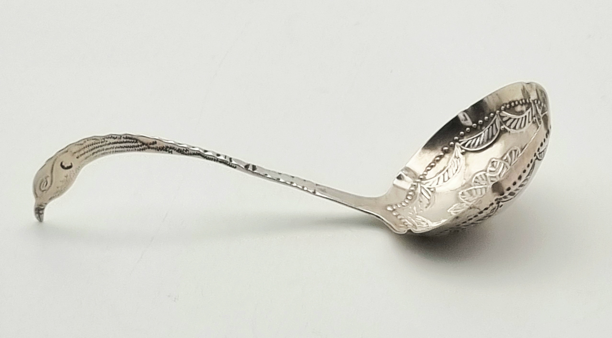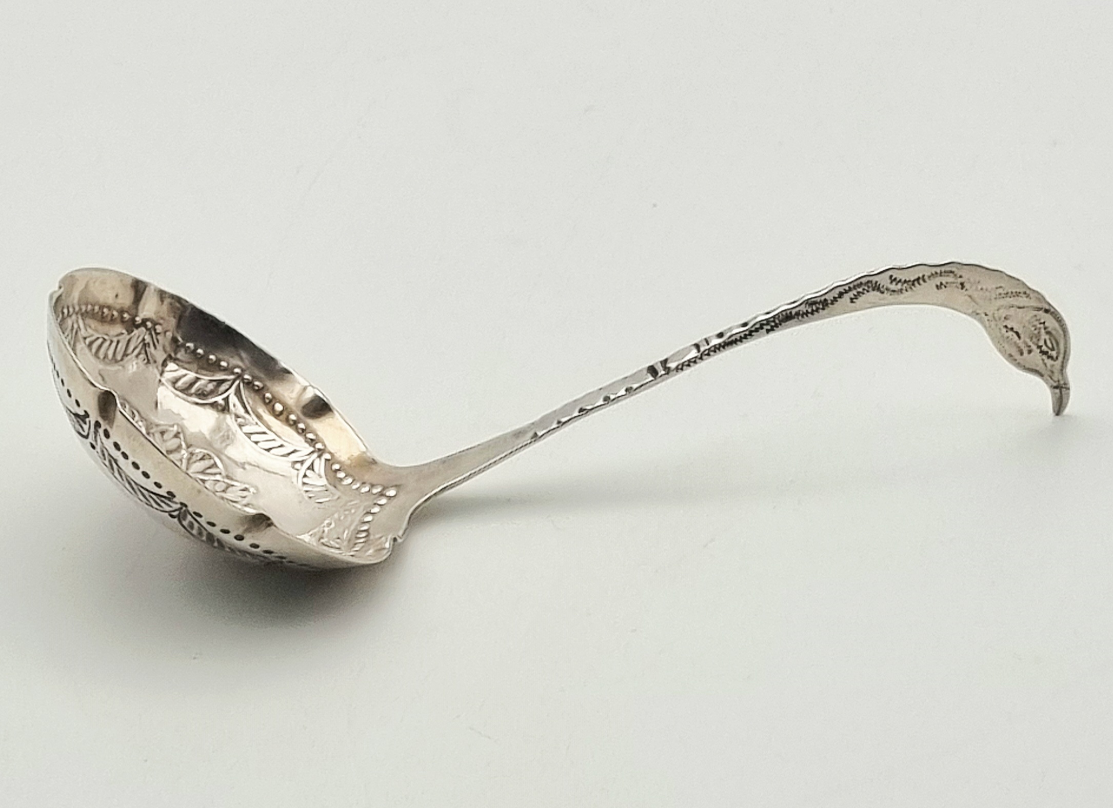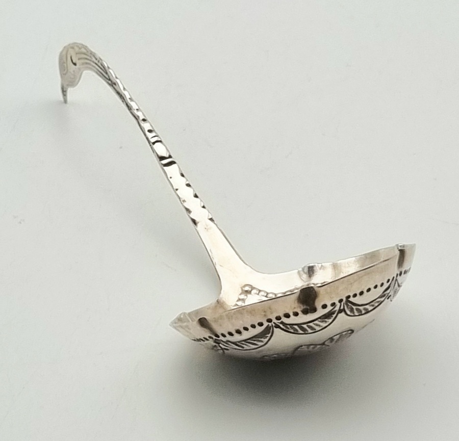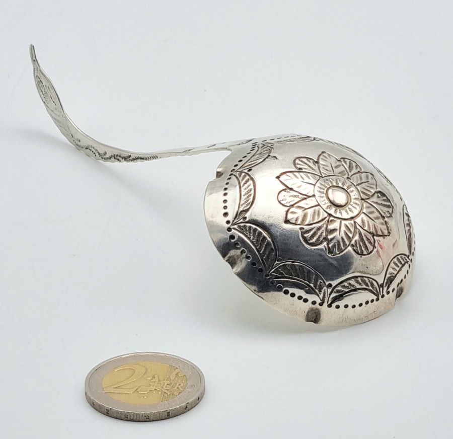 De Biedermeier zilveren roomlepel of zwanenhalslepel dateert uit 1836 (jaarletter B), vervaardigd door de zilversmid C. Kuitert, gemerkt meesterkeur CK, uit Groningen. De lepel is gedreven en gegraveerd met een gestileerd floraal motief en puntlijnen. De lange gebogen steel eindigt in een zwanenkop motief. Alsook gemerkt met keurmerken lopende leeuw 2 en minervakop. Kom langs tijdens de kijkdagen (28 t/m 30 november) en ontdek deze roomlepel zelf! |