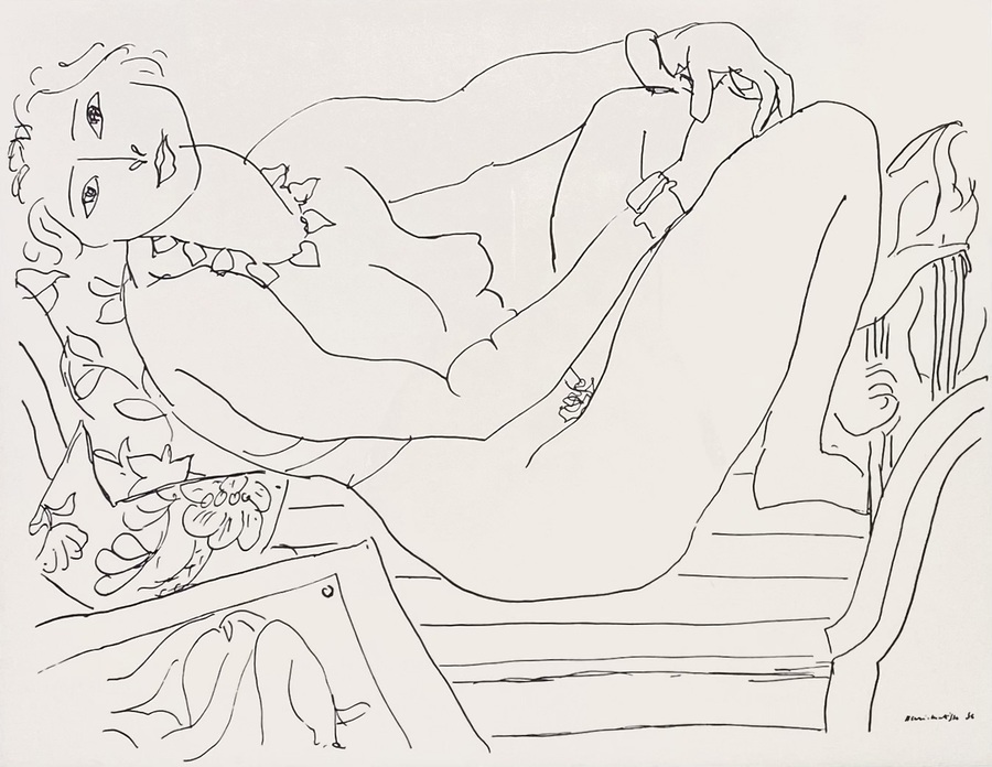 Litho naar de Franse kunstenaar Henri Matisse (1869–1954) in de stijl van het modernisme. Dit werk, uitgevoerd in lithografische inkt op papier, is gedrukt in 1992 als een postume editie uit Cahiers d'Art. De voorstelling is een naaktfiguur weergegeven met de beroemde, gereduceerde contourlijnen van Matisse uit 1936. De signatuur 'Henri Matisse 36' is in de plaat opgenomen.