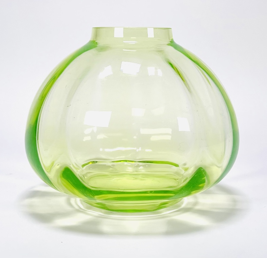 Glazen vaas, model "Mira", ontwerp W.J. Rozendaal (1899–1981) voor Kristalunie Maastricht, ontworpen in 1931. De vaas is uitgevoerd in mondgeblazen uraniumglas met verticale optiek ribben. De bolle vormgeving en de strakke hals zijn kenmerkend voor de stijl van de Nieuwe Zakelijkheid in Nederland.