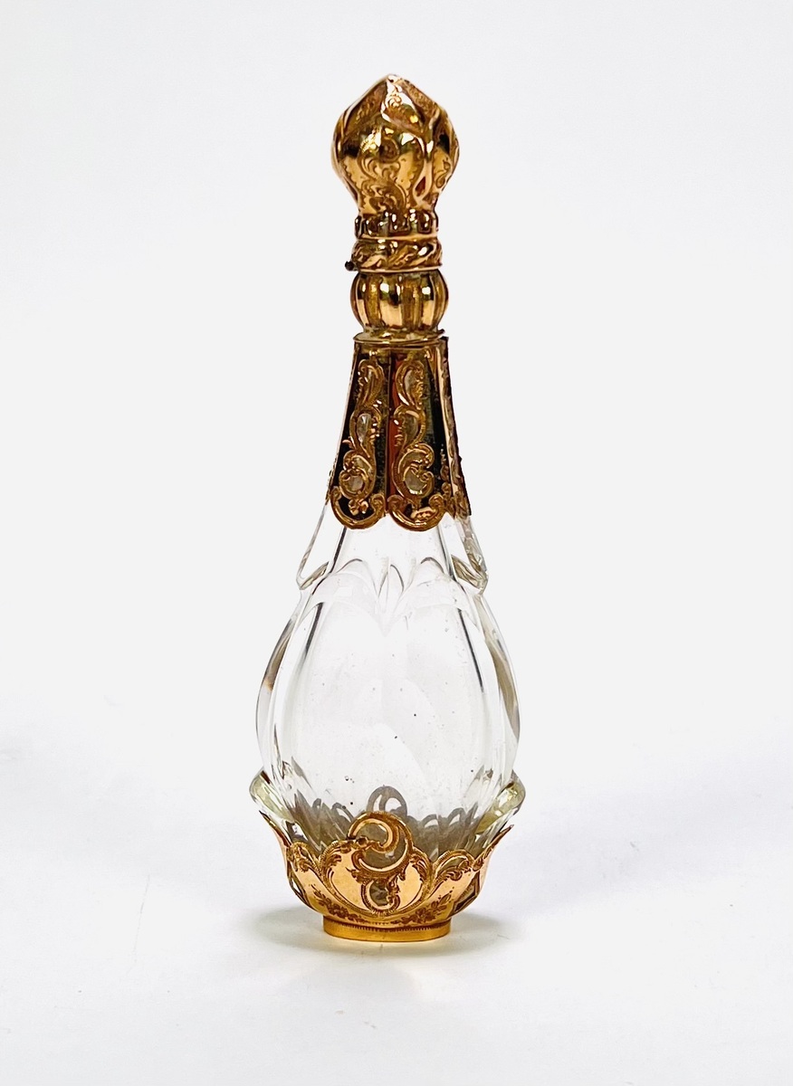 Parfumflesje van helder geslepen kristal met rijk gegraveerde 14 karaat gouden monturen gemerkt met eikenblad, vervaardigd in de tweede helft van de 19e eeuw, Europa. Het peervormig parfumflesje toont florale ornamentiek en reliëfdecoratie aan hals, voet en scharnierend dopdeksel, met bijbehorend glazen stopje.