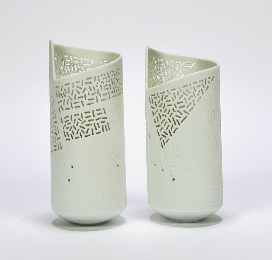 Porseleinen vaasjes/kunstobjecten door de Duitse keramist Horst Göbbels (1936), uitgevoerd in wit porselein met fijn reliëf en een subtiele matte glazuurlaag. De objecten zijn handmatig gedraaid en hebben ajourwerk met geometrische perforaties en een onregelmatige oppervlaktestructuur, typerend voor zijn abstract modernistische stijl. Gedateerd circa 1980–1990. Het monogram HG is onder zichtbaar.
