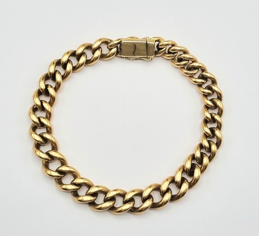 De massieve schakelarmband is uitgevoerd in 14 karaat geelgoud (getoetst) en dateert uit de tweede helft van de 20e eeuw. De armband bestaat uit een reeks aaneengesloten Albert schakels, een klassieke juweliersstijl die bekend staat om zijn robuuste en platte uiterlijk. De armband is voorzien van een geïntegreerde kastsluiting met een extra veiligheidsachtje.