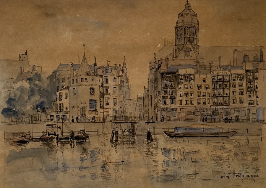 Tekening door J.G. Den Hengst (1904–1983), uitgevoerd in potlood, inkt en aquarel op papier, circa 1940–1960, voorstellend het Prins Hendrikkade te Amsterdam met zicht op de Sint-Nicolaaskerk. Het werk toont een stedelijk haven tafereel met boten, waterreflecties en historische bebouwing. Gesigneerd en getiteld rechtsonder “J.G. den Hengst PR Hendrikkade”, voorzien van goudkleurige lijst.