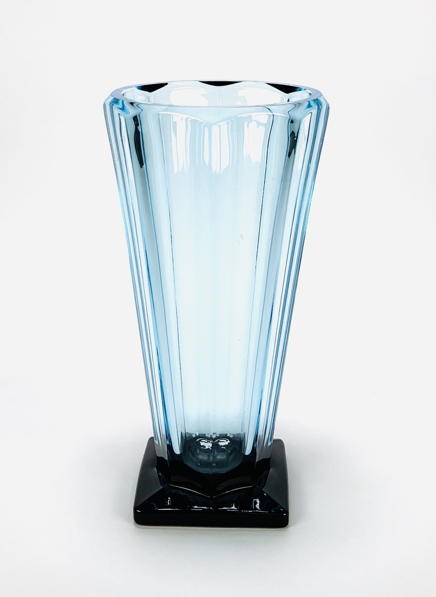 Art Deco vaas van persglas, vervaardigd in Europa omstreeks 1930. Het vaas toont een hoog conisch model met verticaal gefacetteerde wand, uitgevoerd in transparant blauw glas met zwart vierkant voetstuk. De techniek is kenmerkend voor seriële glasproductie uit de interbellumperiode. Herkomst vermoedelijk Tsjecho-Slowakije.