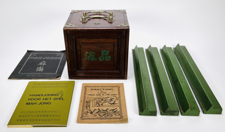 Compleet mahjong spel in een donker houten kist met vijf laatjes en messing beslag. De stenen zijn vervaardigd in een techniek van been en bamboe, met gegraveerde en ingekleurde Chinese karakters. De set bevat vier groene houten latten, fiches, dobbelstenen en drie handleidingen. Dit Chinese exportspel in de traditionele stijl dateert uit de periode ca. 1920–1940.