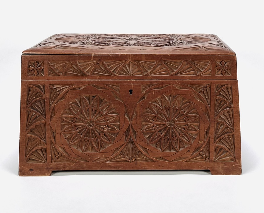 Houten kistje volledig bedekt met uitgebreide kerfsnede decoratie, staand op een geprofileerde plint, toont geometrische rozetten en waaiervormige patronen. De techniek is houtsnijwerk, kenmerkend voor de volkskunst begin 20e eeuw. Het kistje is van Friese herkomst en is compleet met messing scharnieren en twee sleutels.